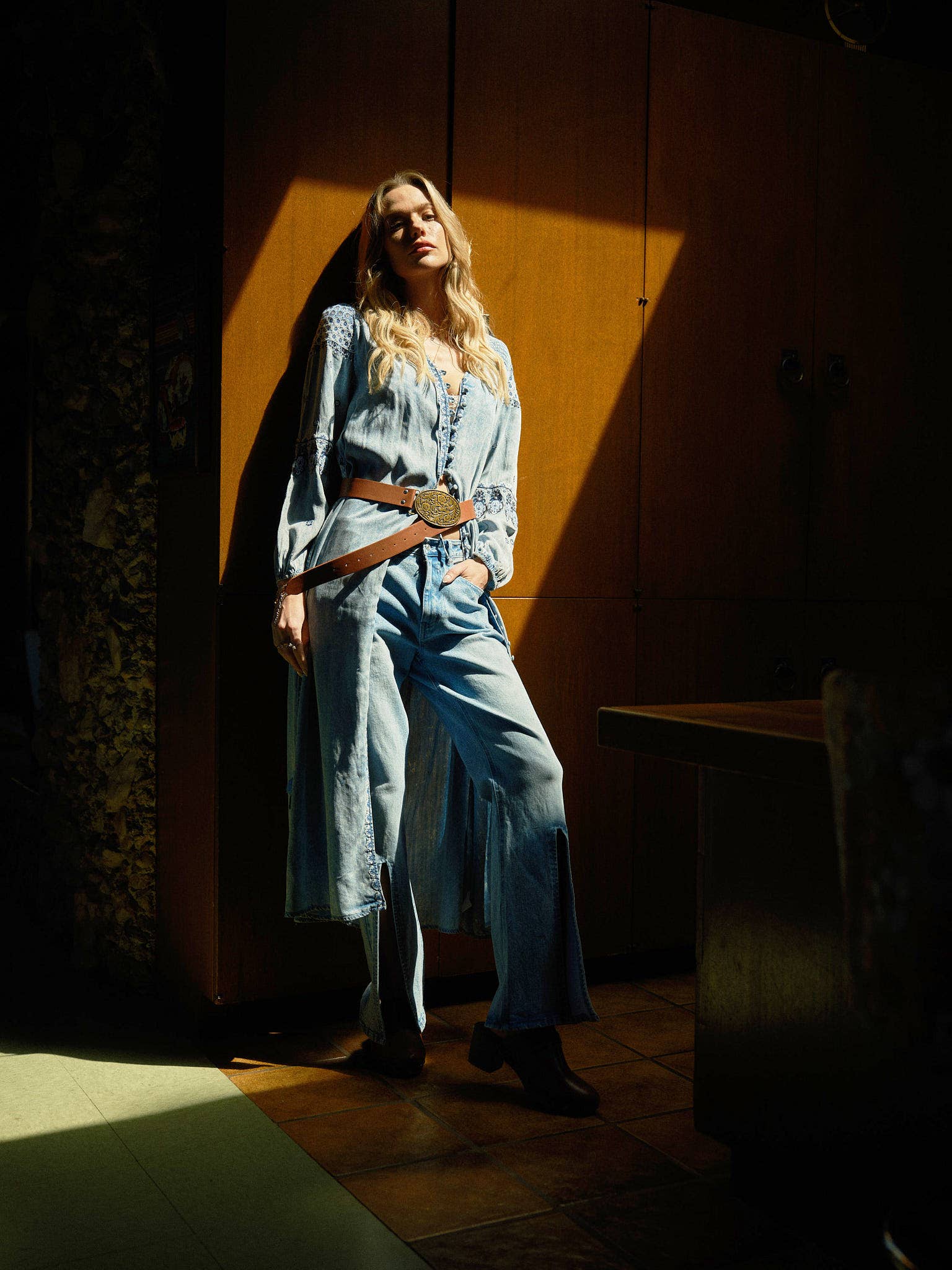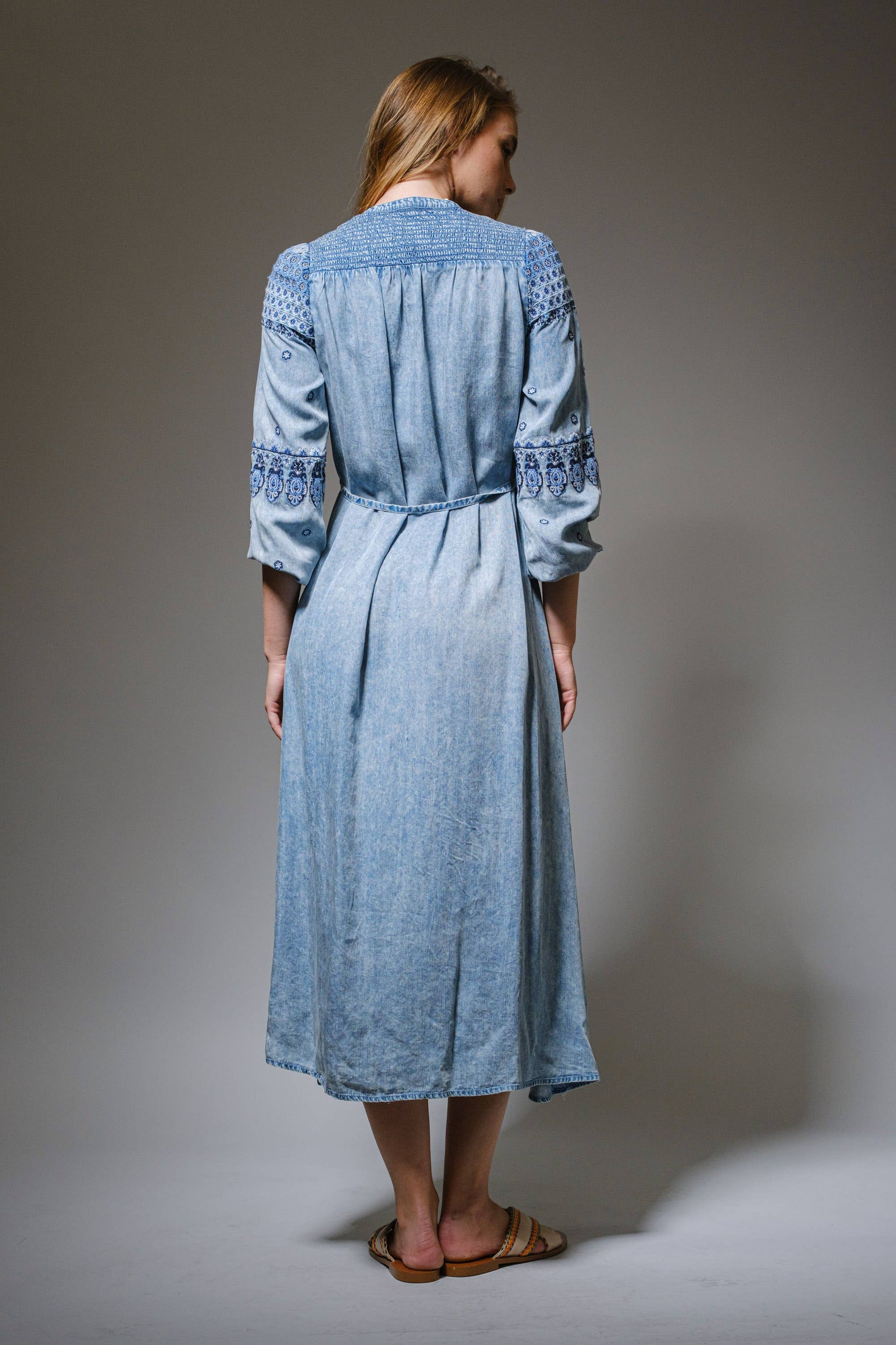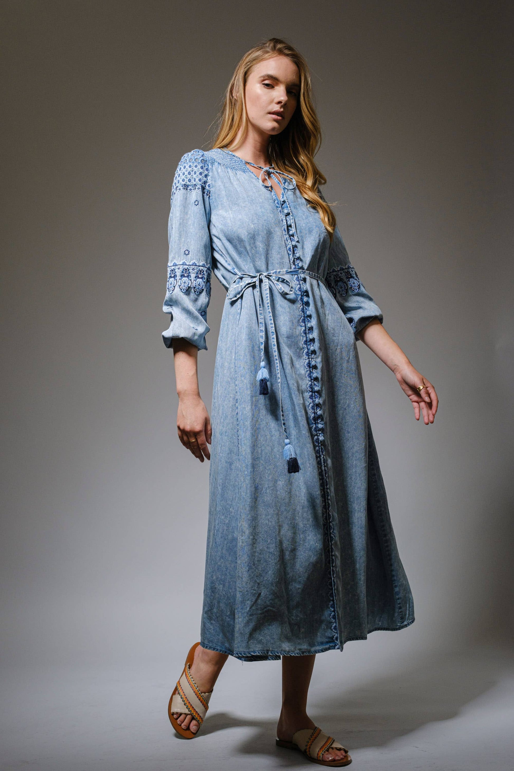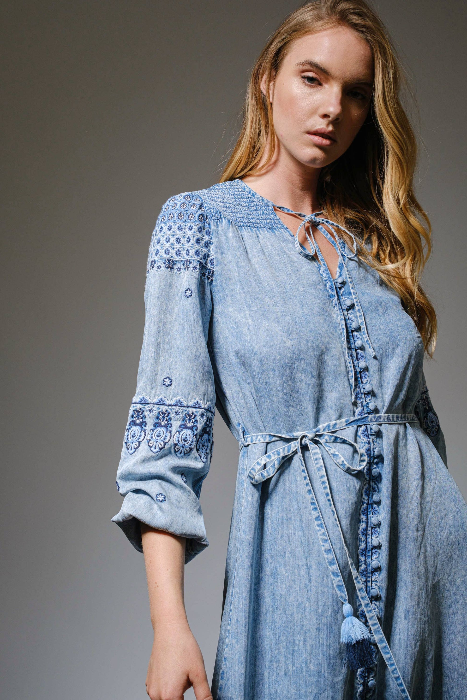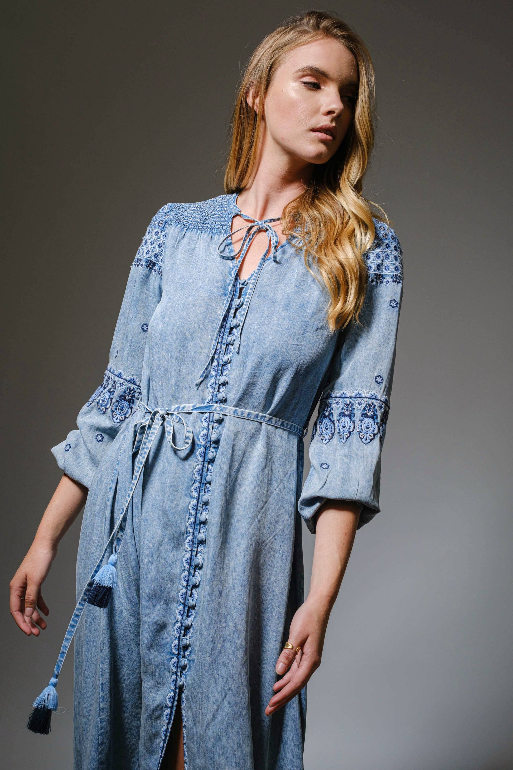 This maxi dress features smocked shoulders, intricate embroidery, and a button-up front with a tie detail. Crafted from soft Tencel for a relaxed fit.