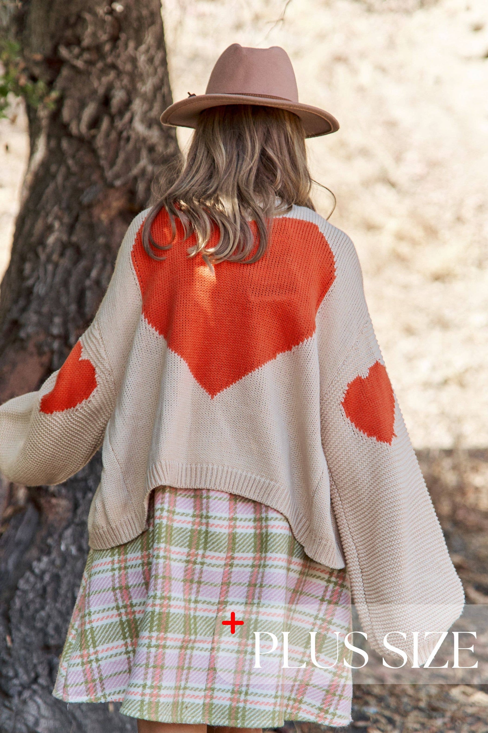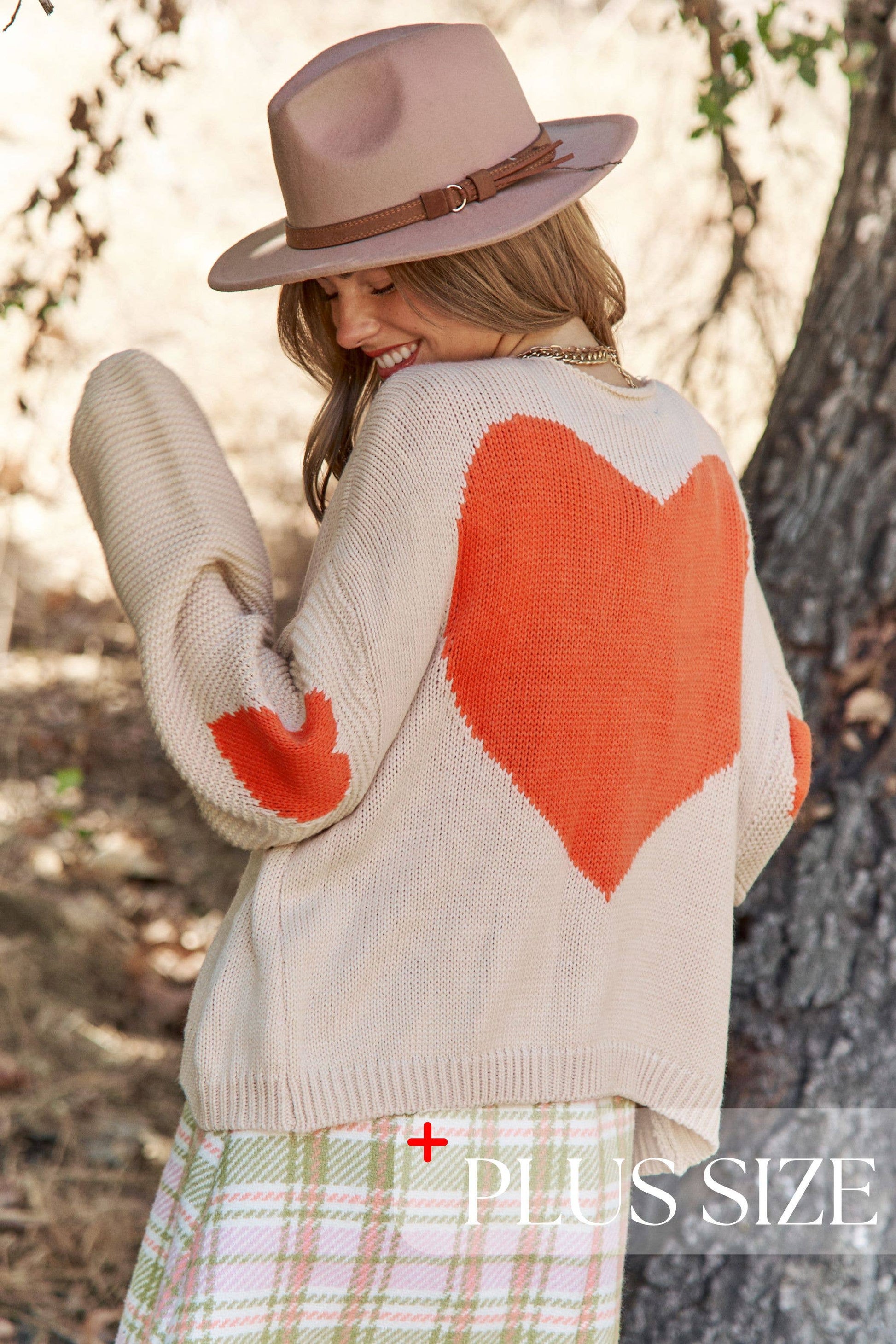 Women's plus size open cardigan. Heart shape knit design on the back and the elbows.