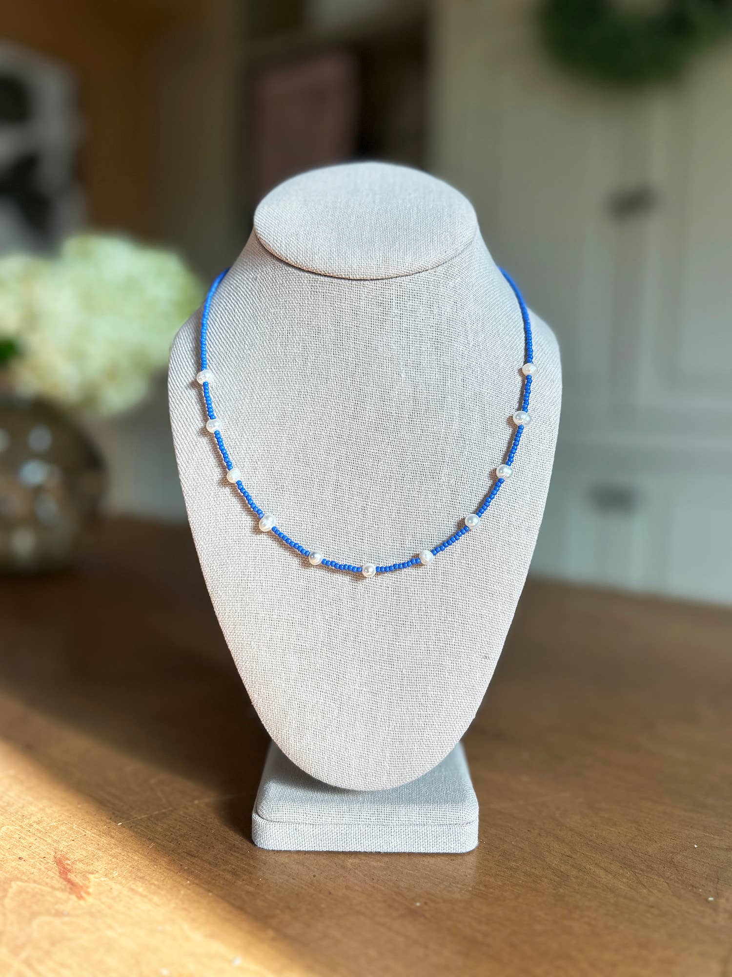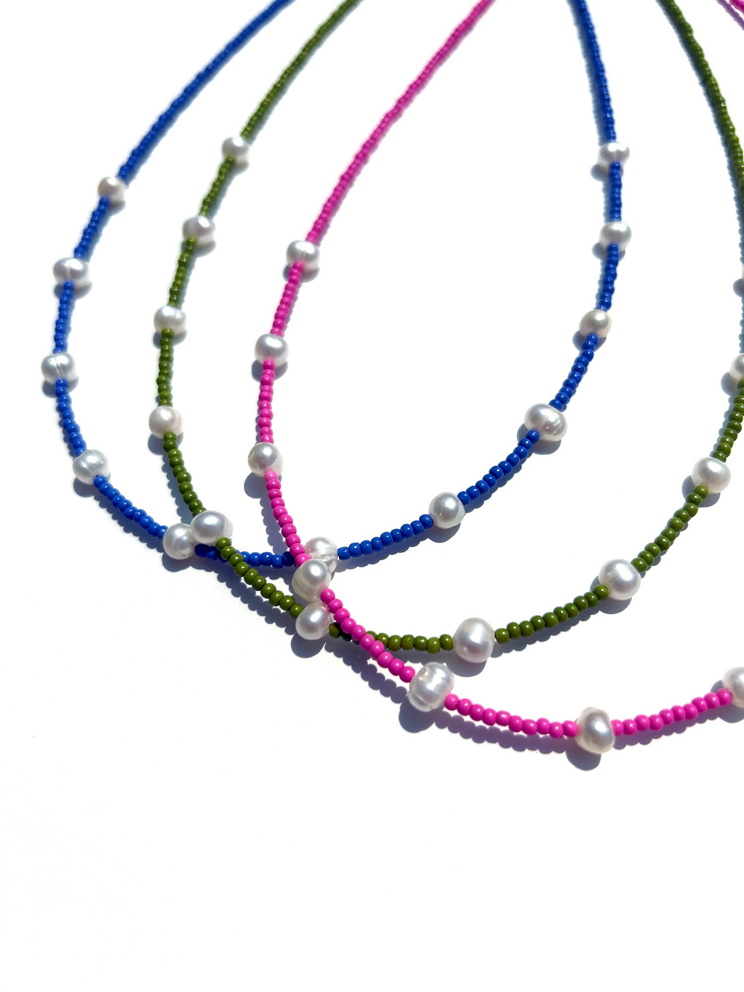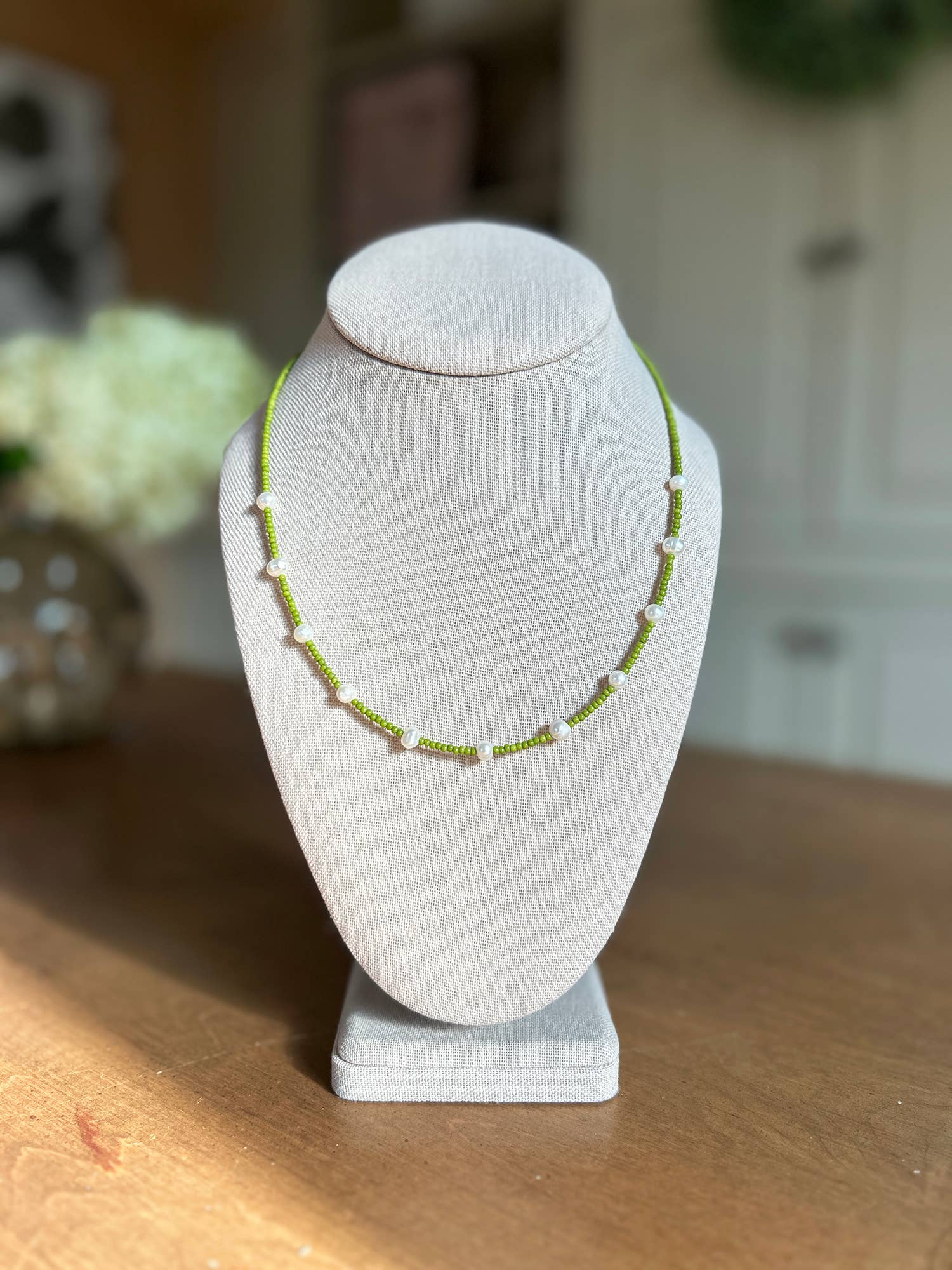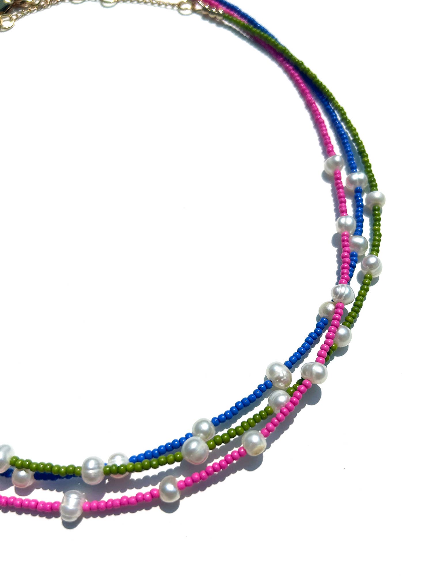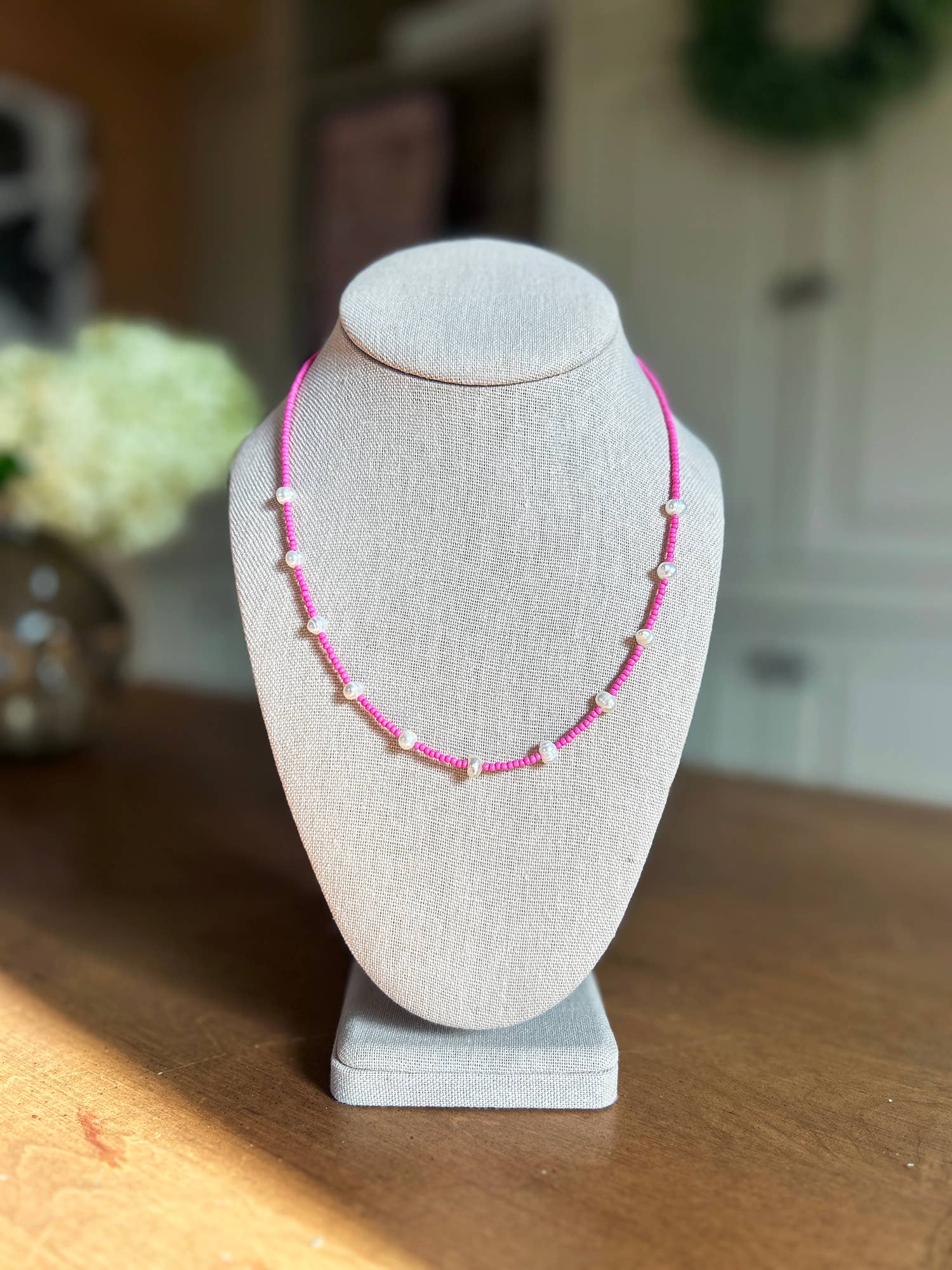 Shine brightly in this cute neon seed bead and genuine pearl necklace! - Handmade in Rhode Island - 14k gold filled or sterling silver finishes - 16.5” + 2” extender - Grade A seed beads, freshwater pearls - Hypoallergenic - 14K is tarnish free.