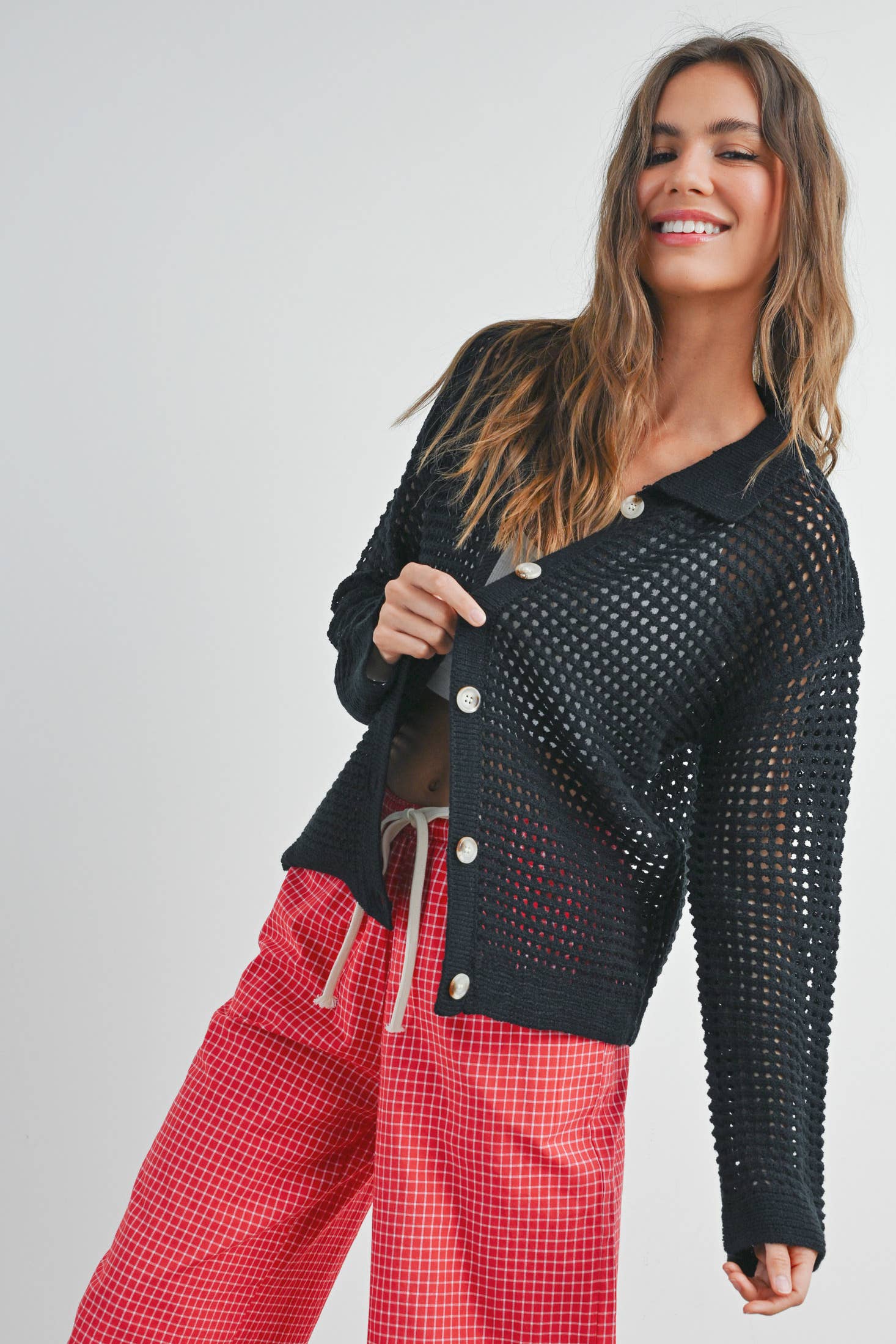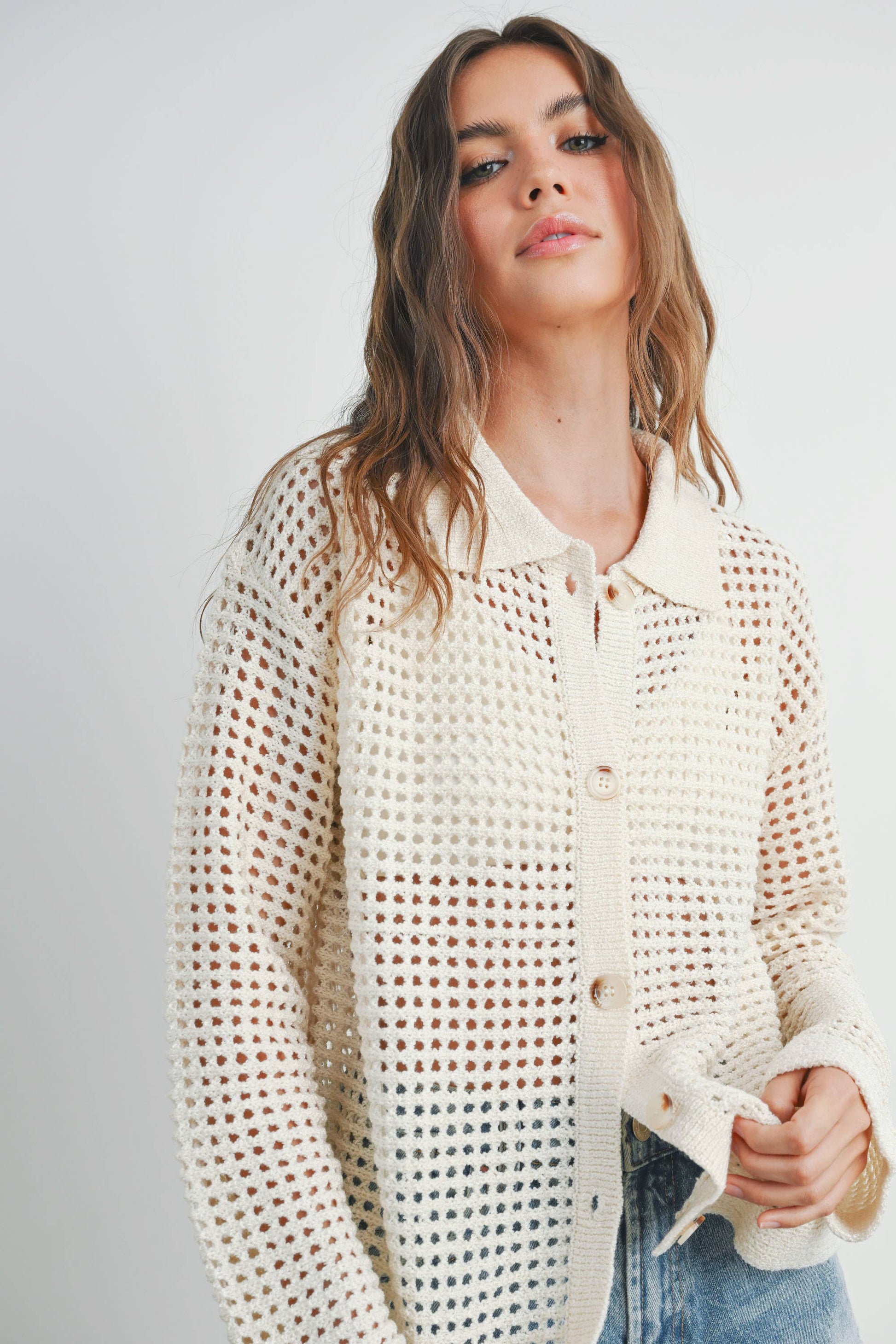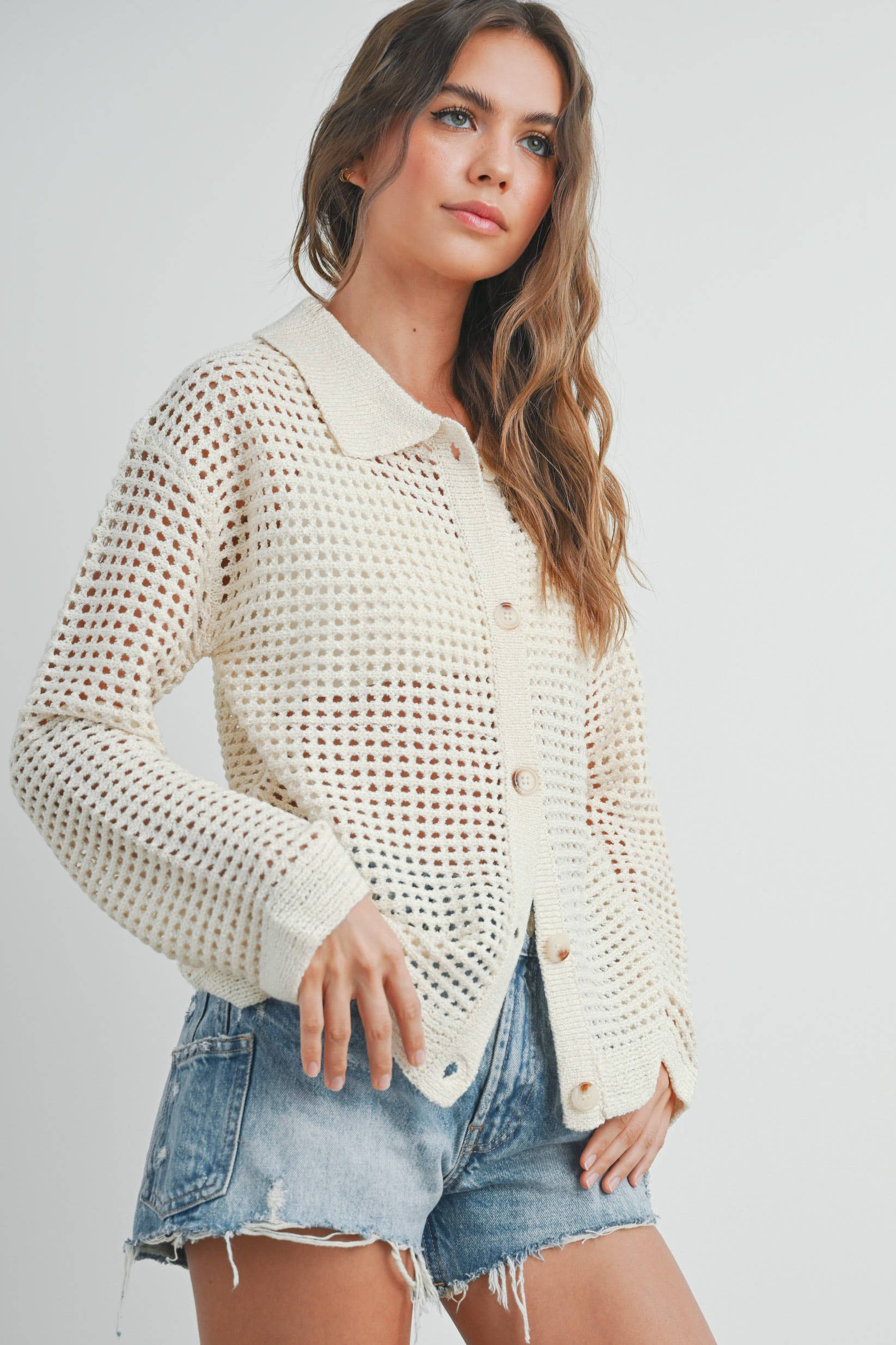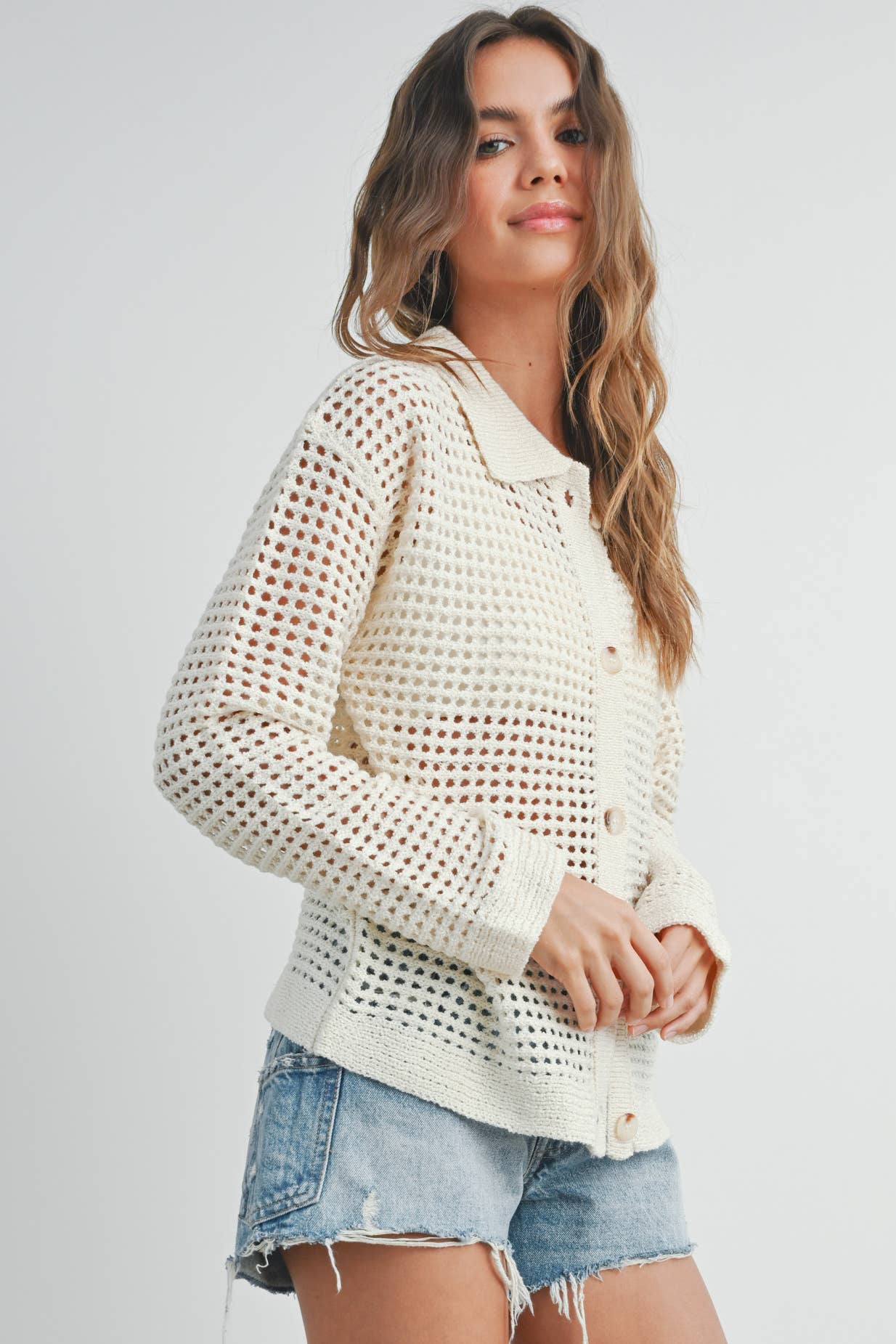 OPEN STITCH CROCHET COLLAR CARDIGAN