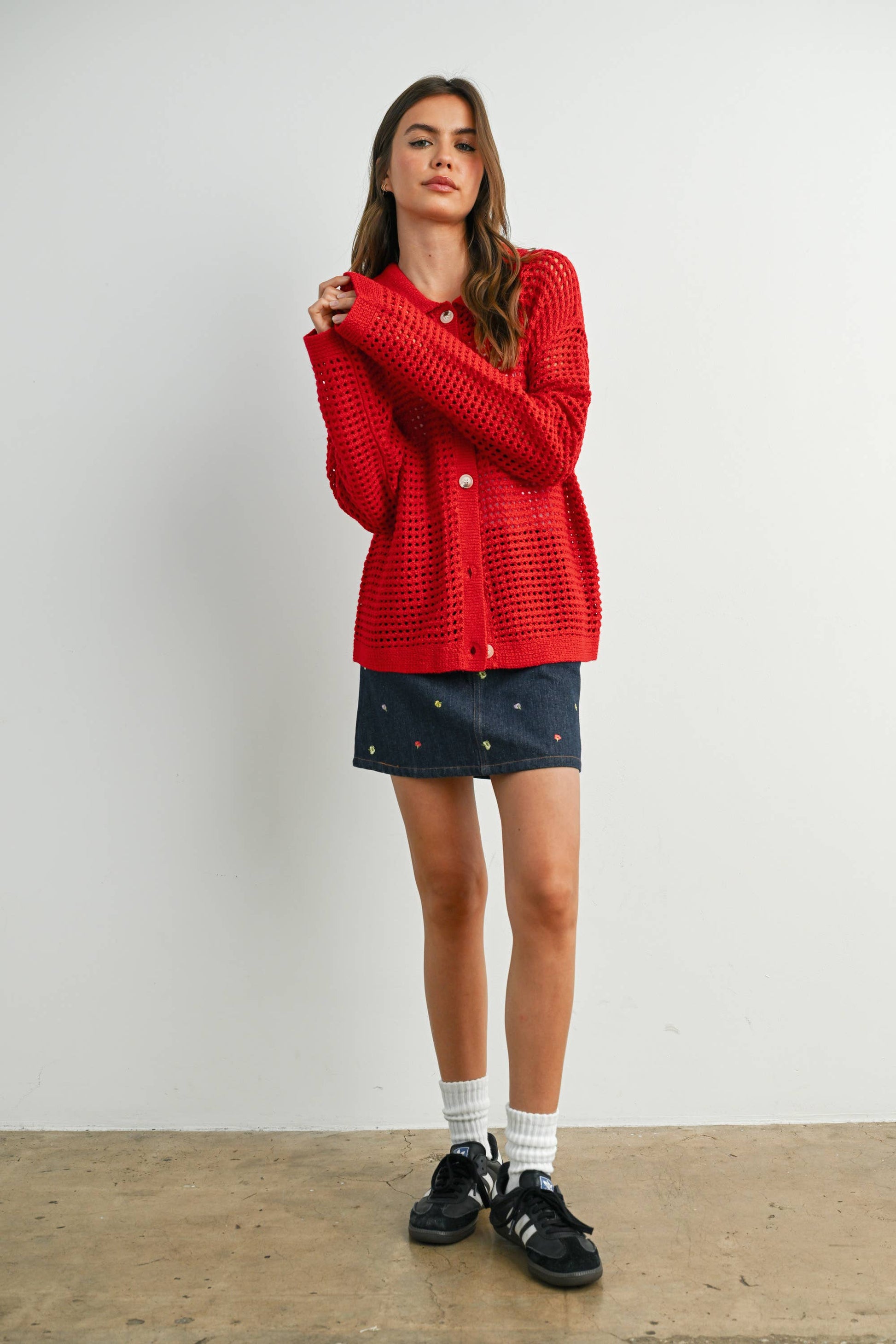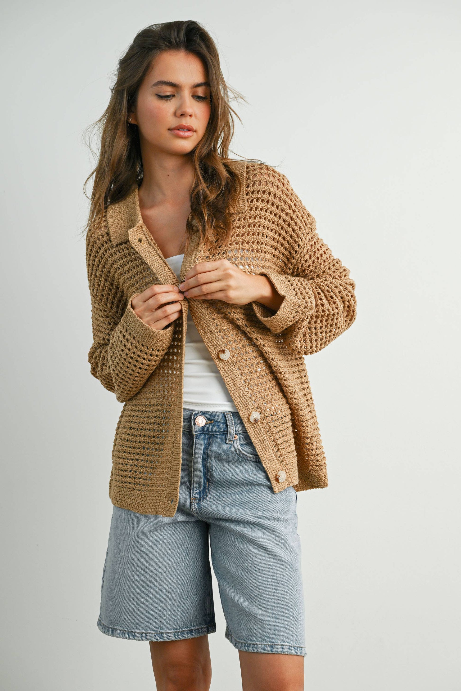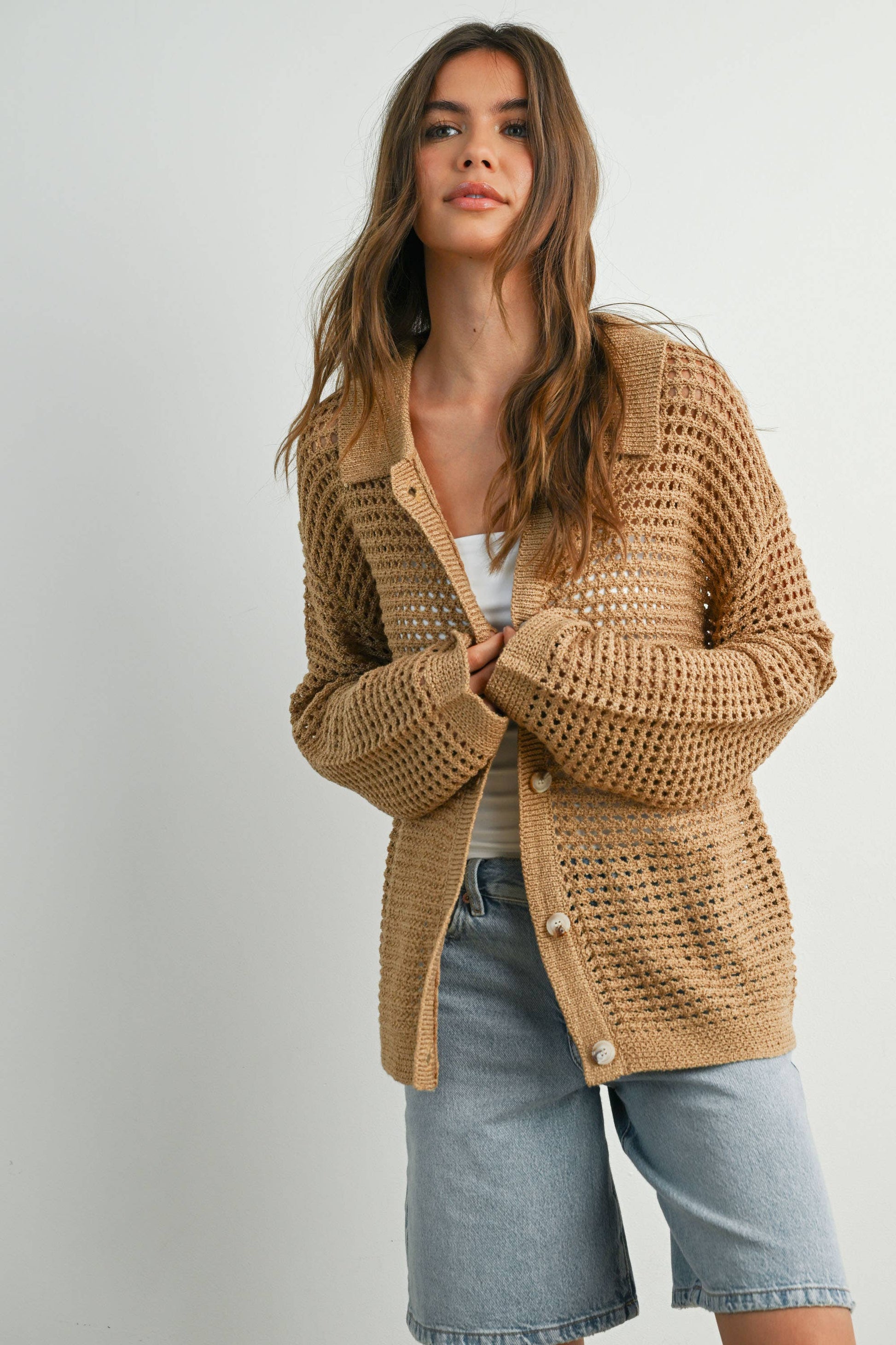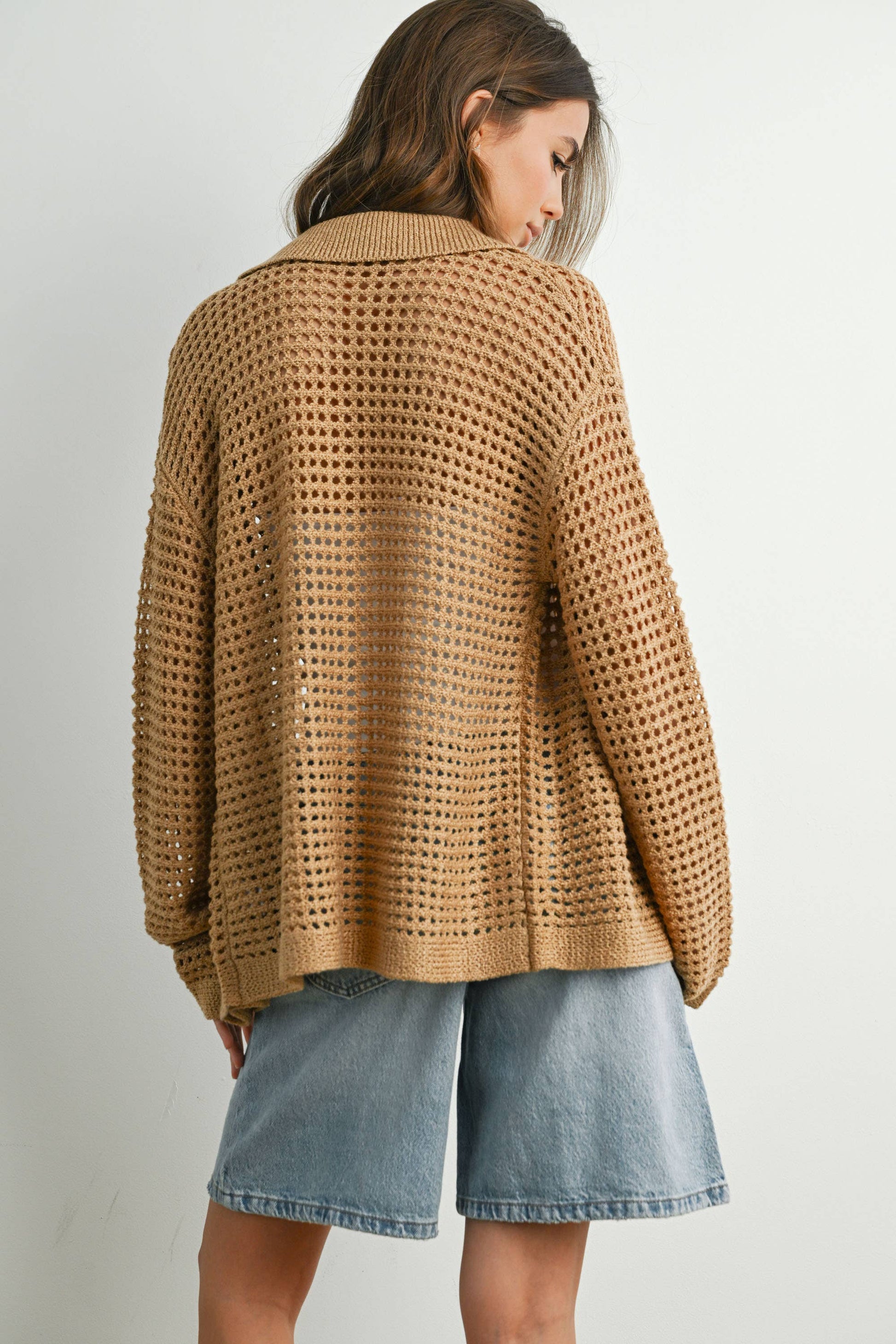 OPEN STITCH CROCHET COLLAR CARDIGAN