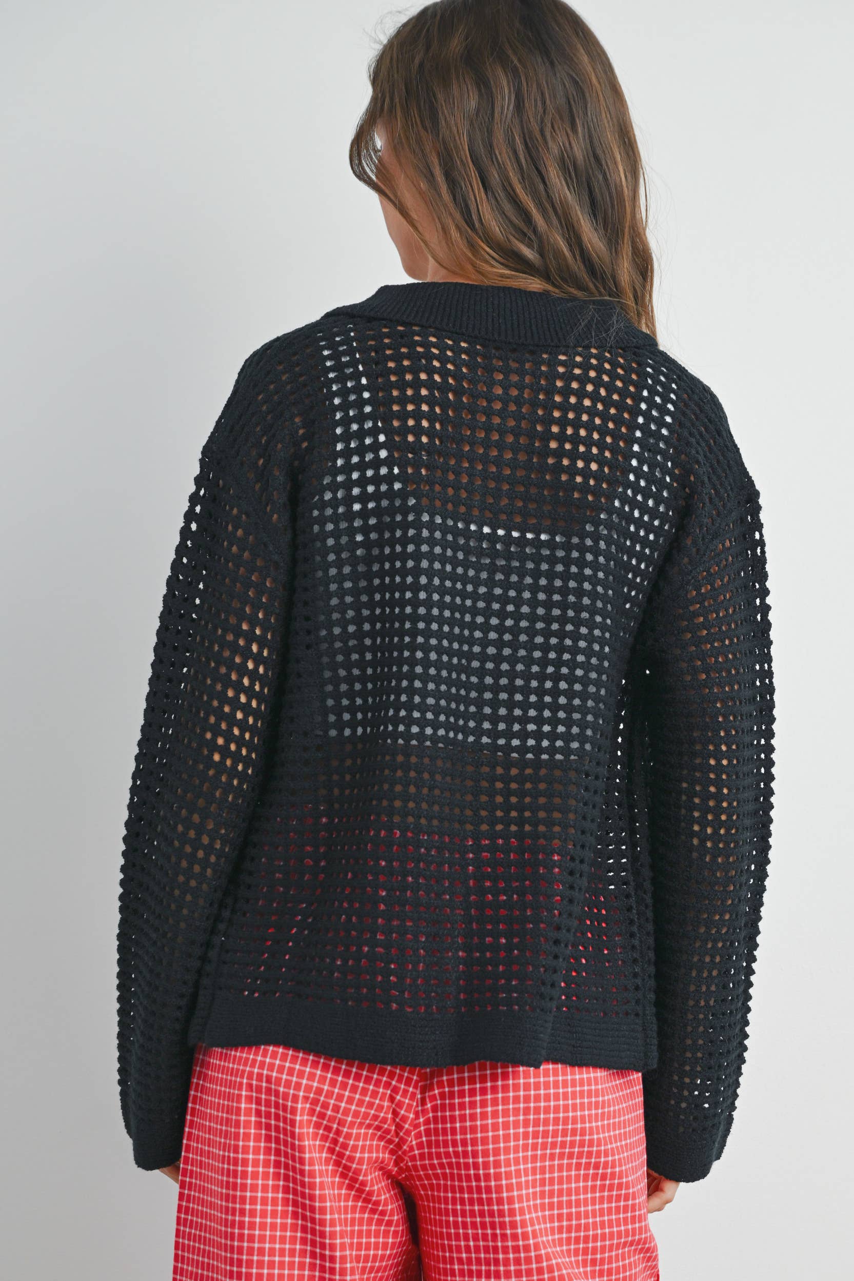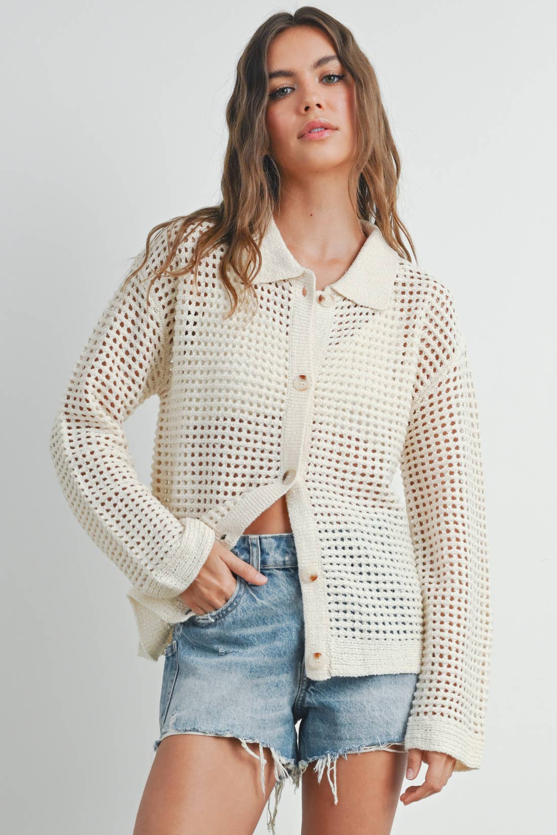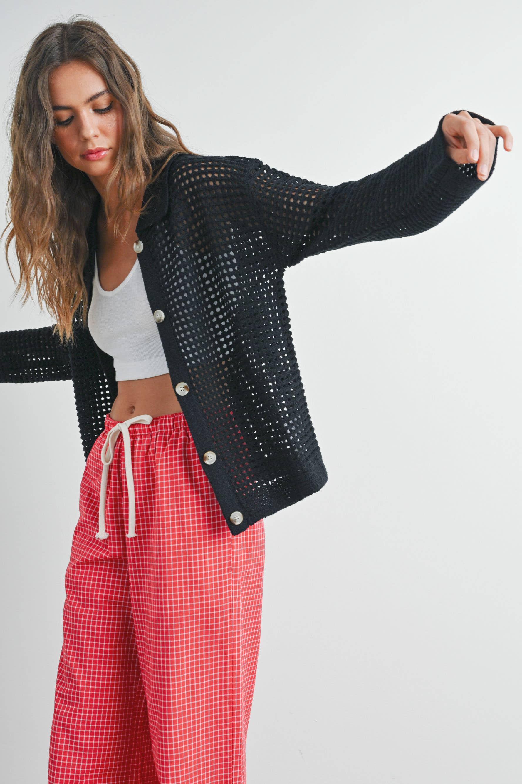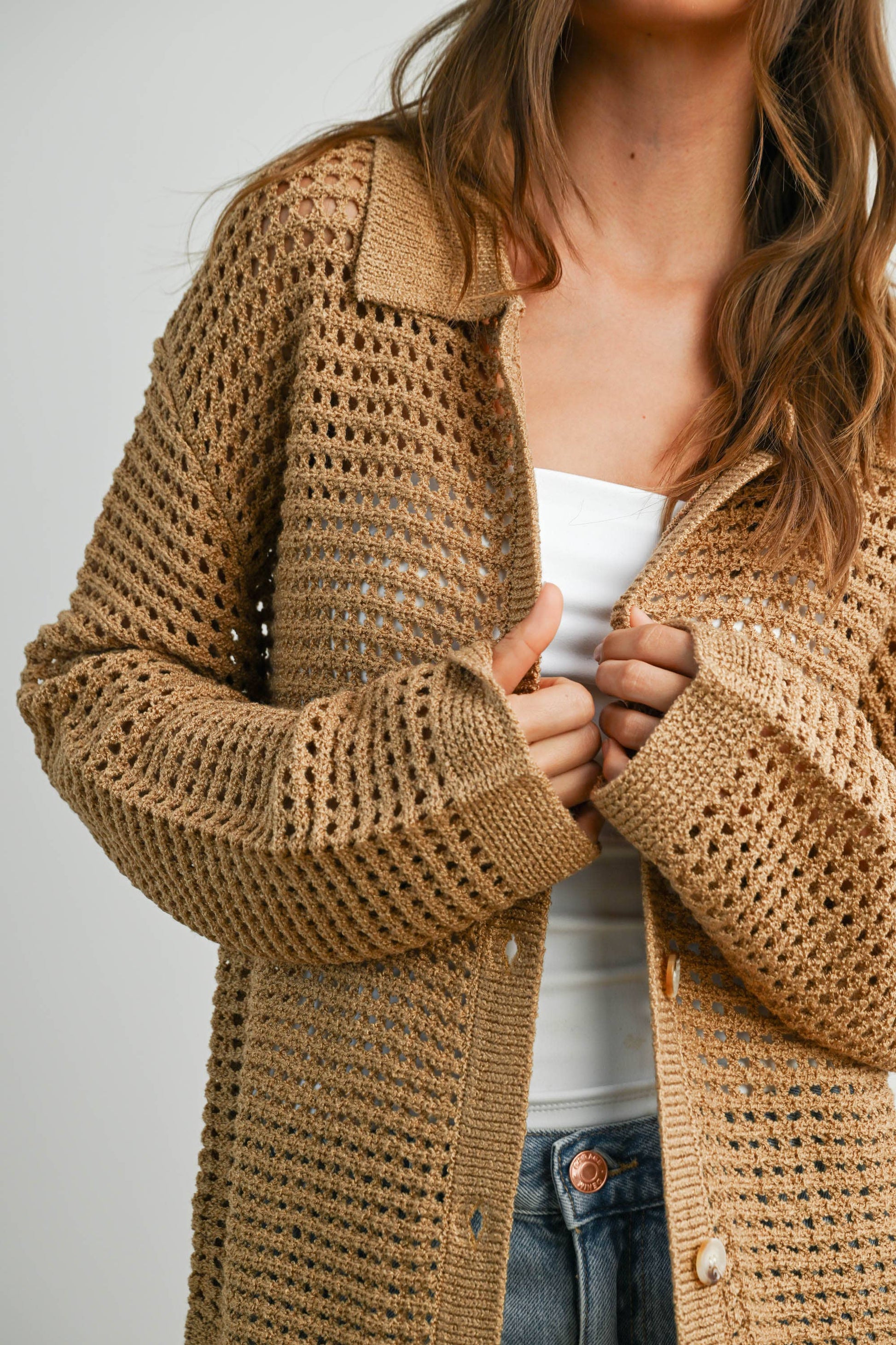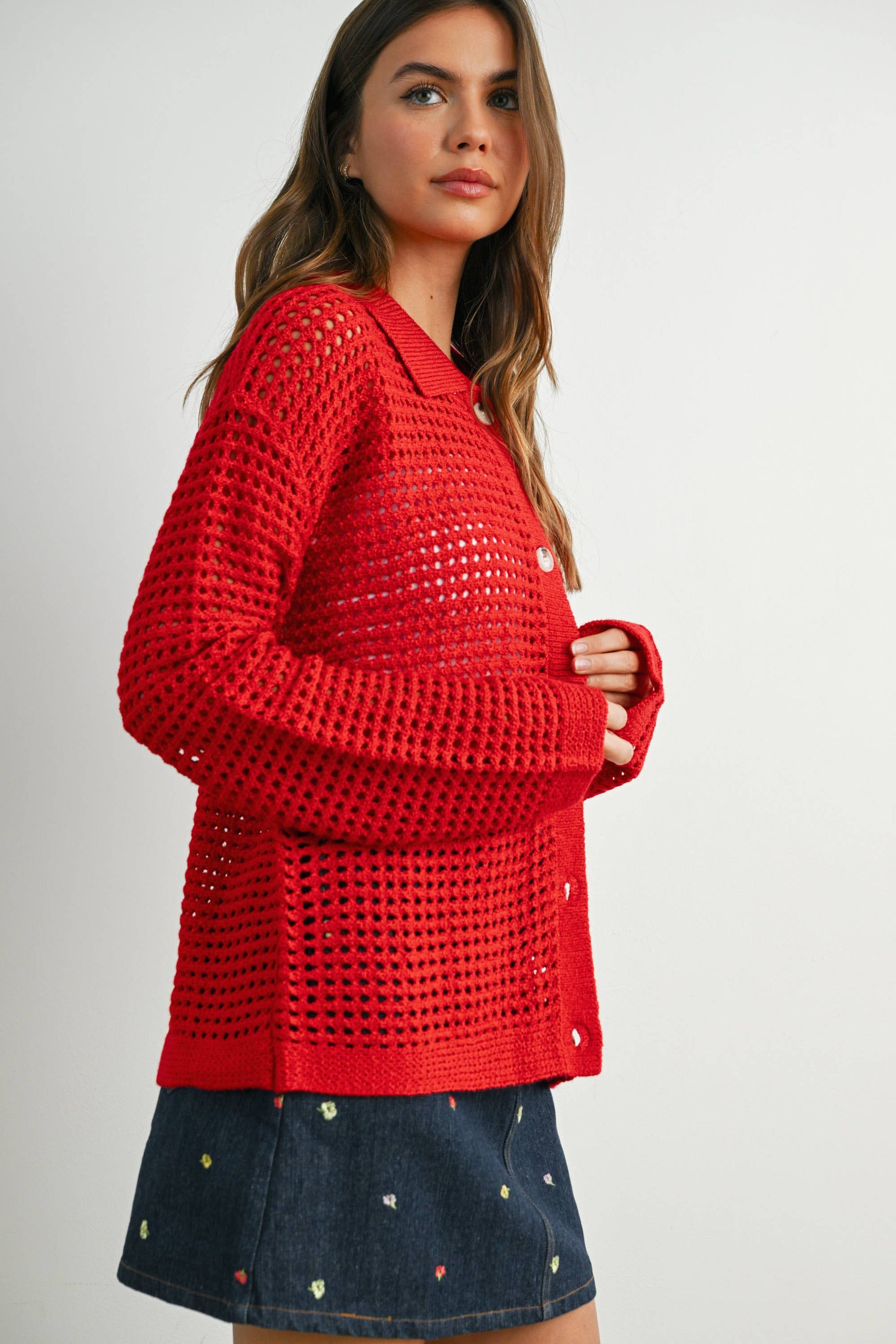 OPEN STITCH CROCHET COLLAR CARDIGAN