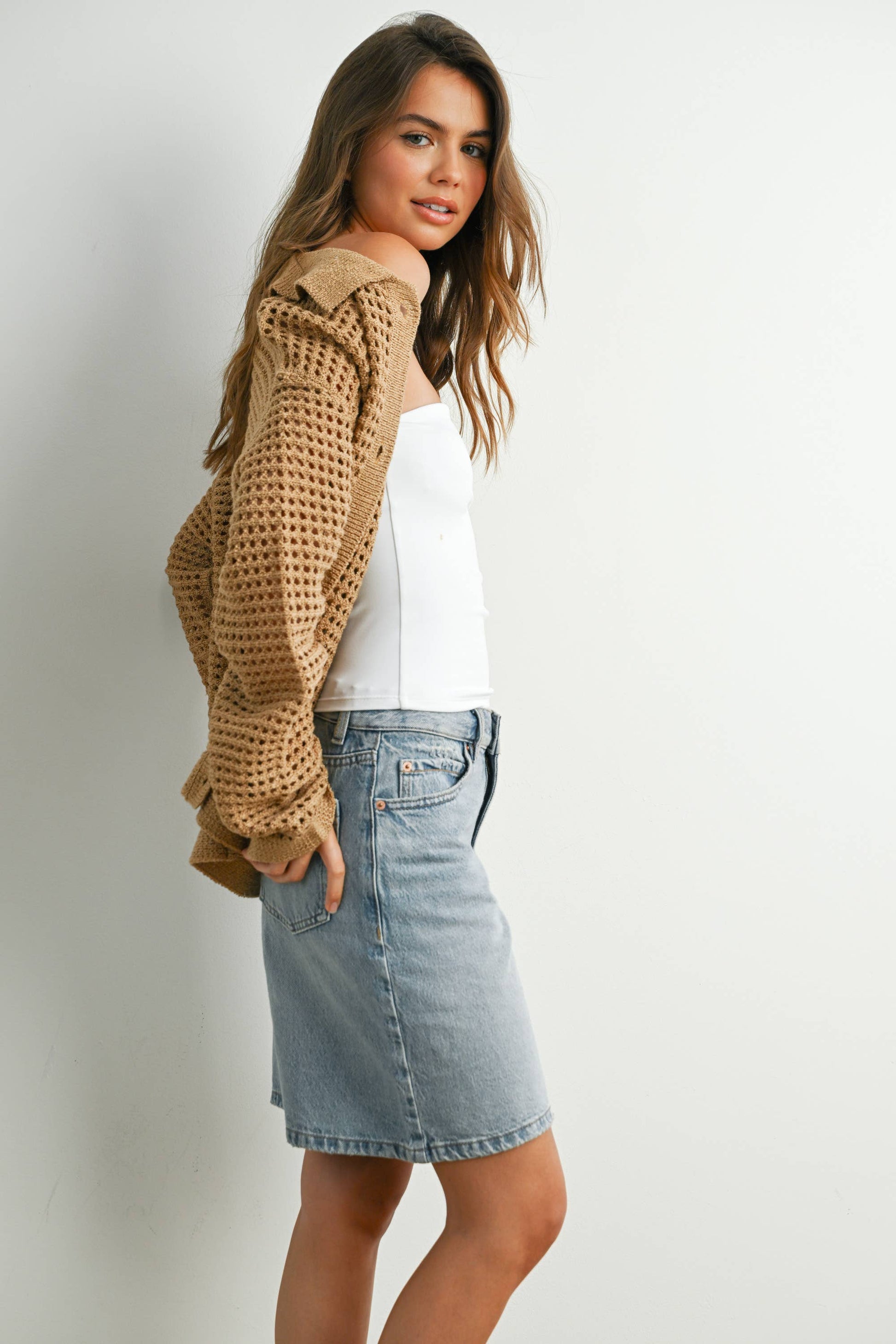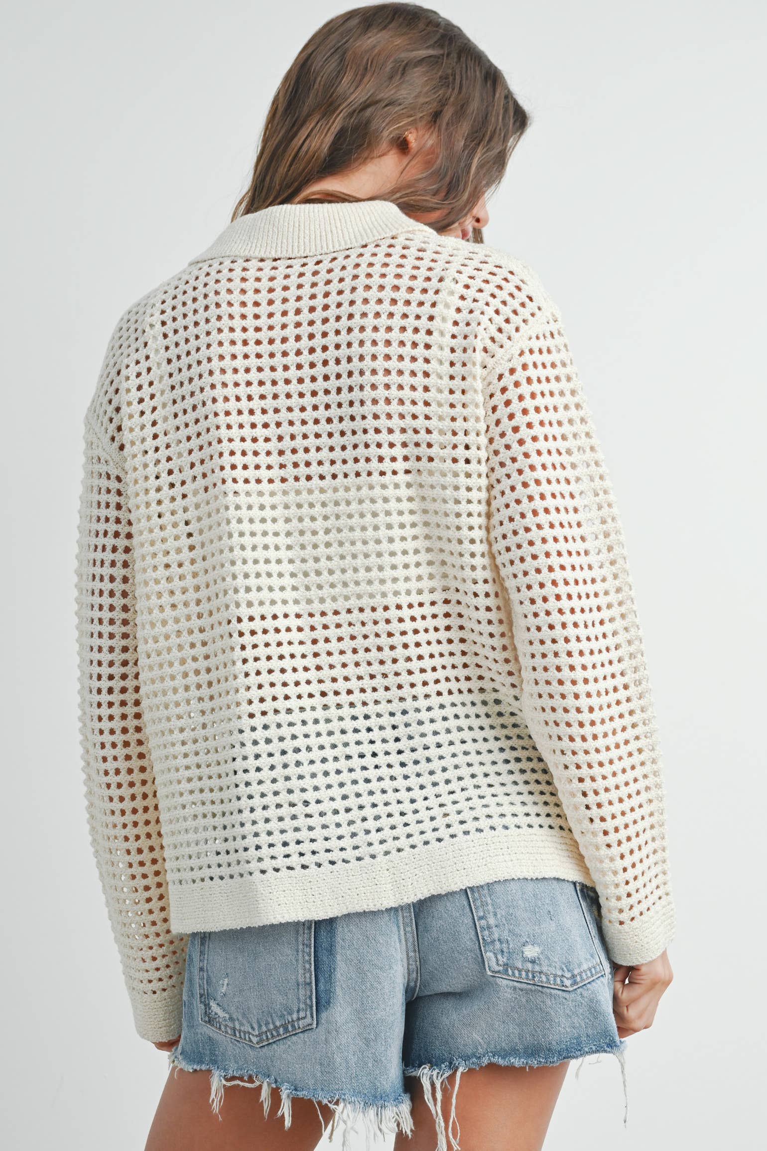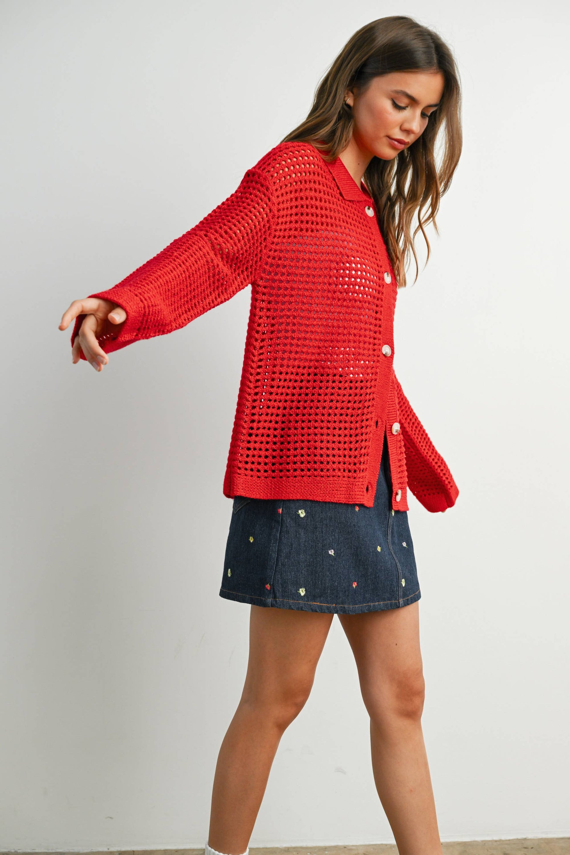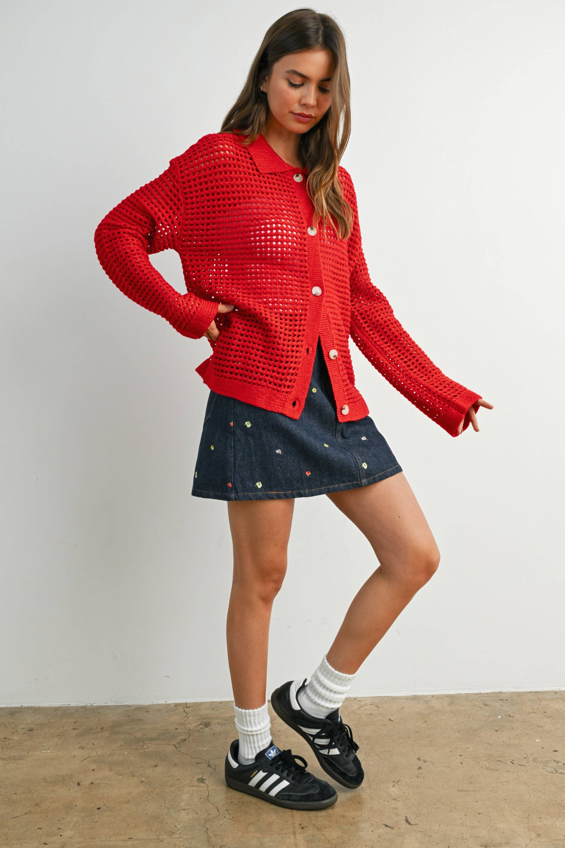 OPEN STITCH CROCHET COLLAR CARDIGAN