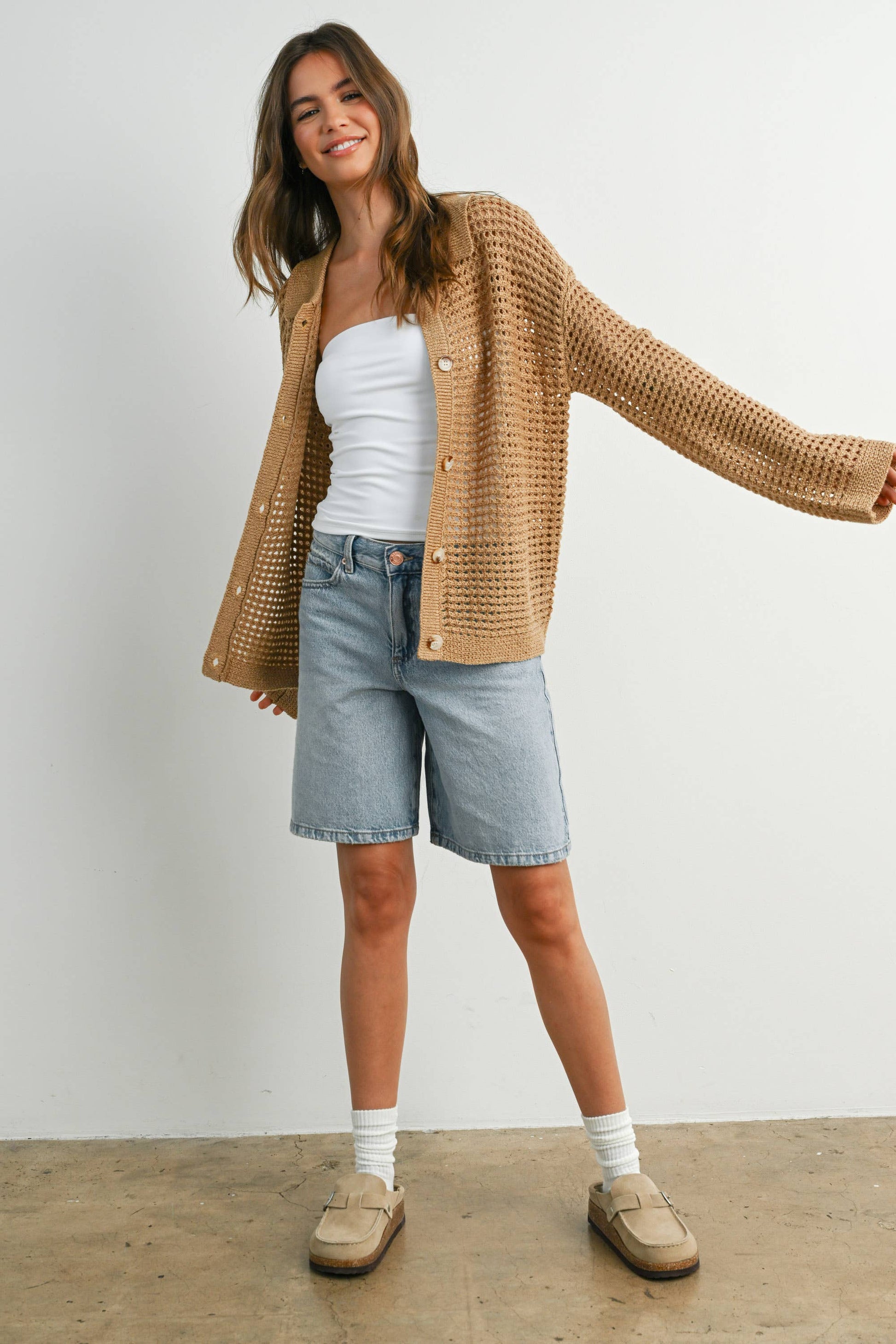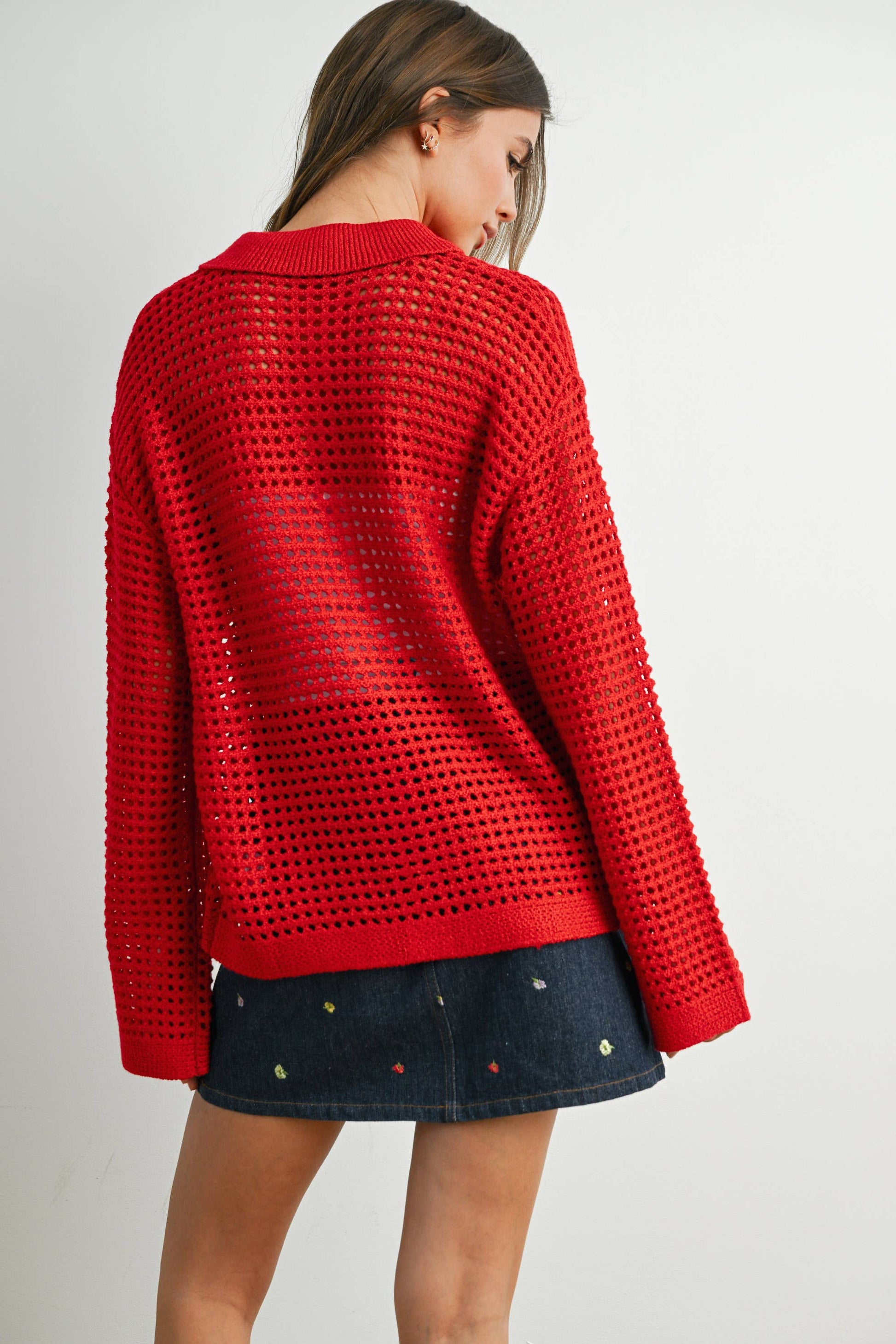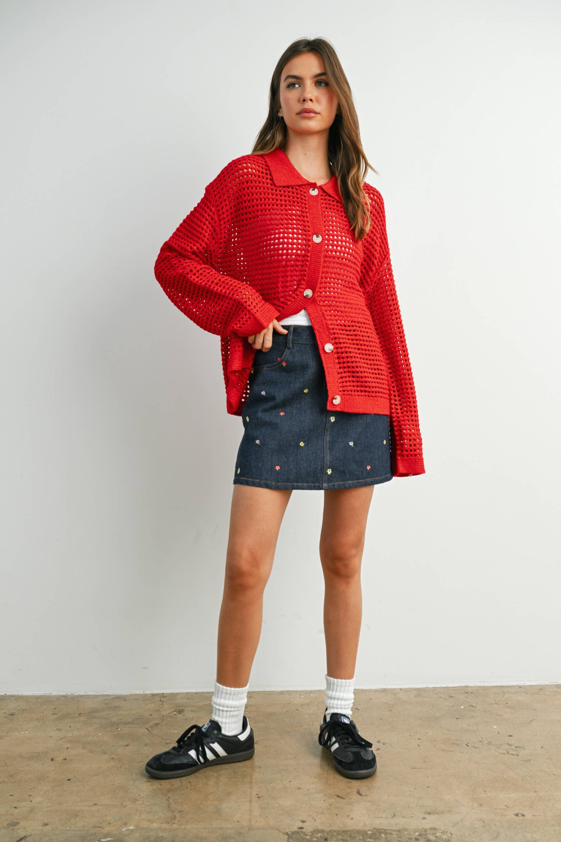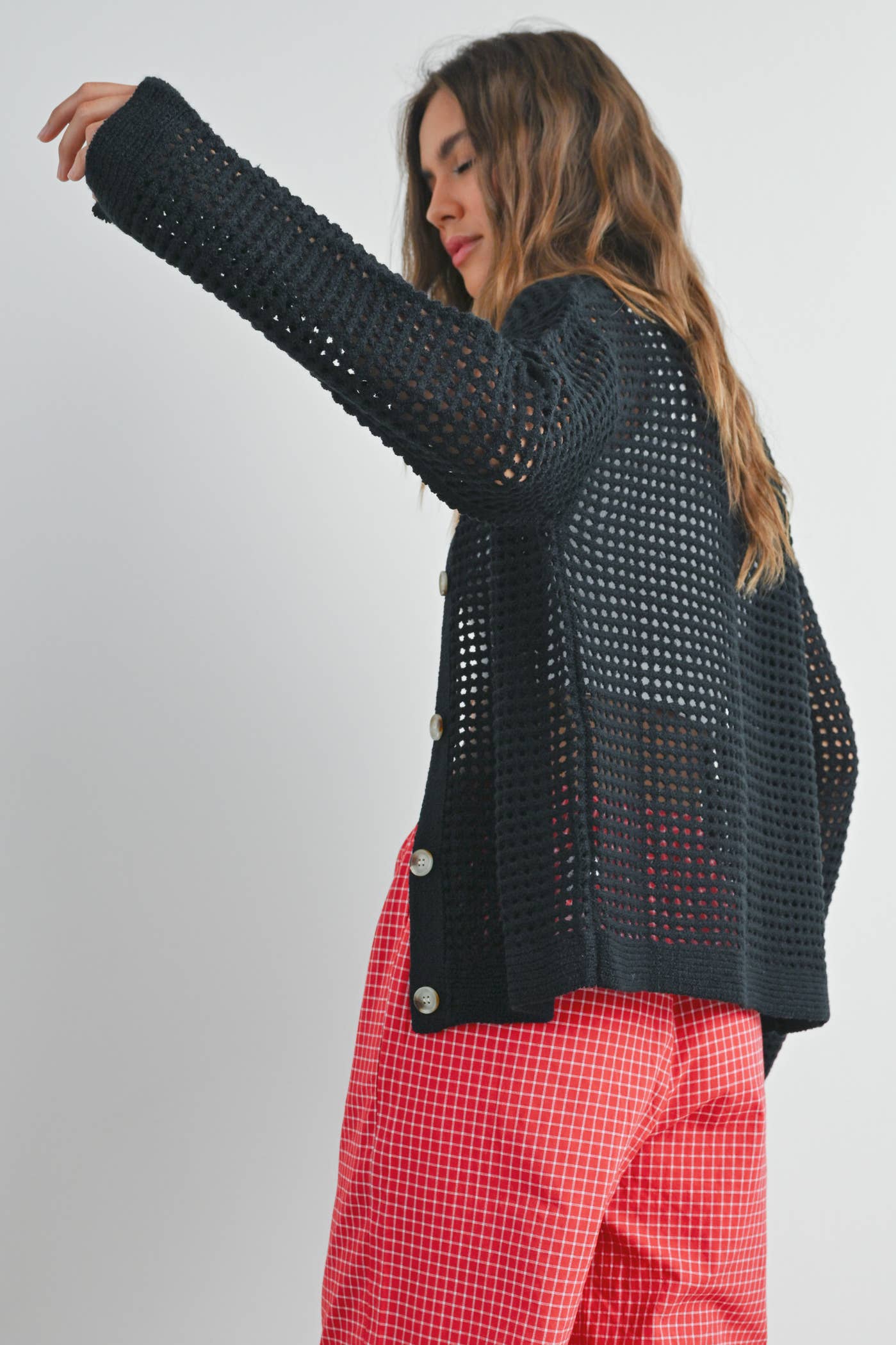 OPEN STITCH CROCHET COLLAR CARDIGAN