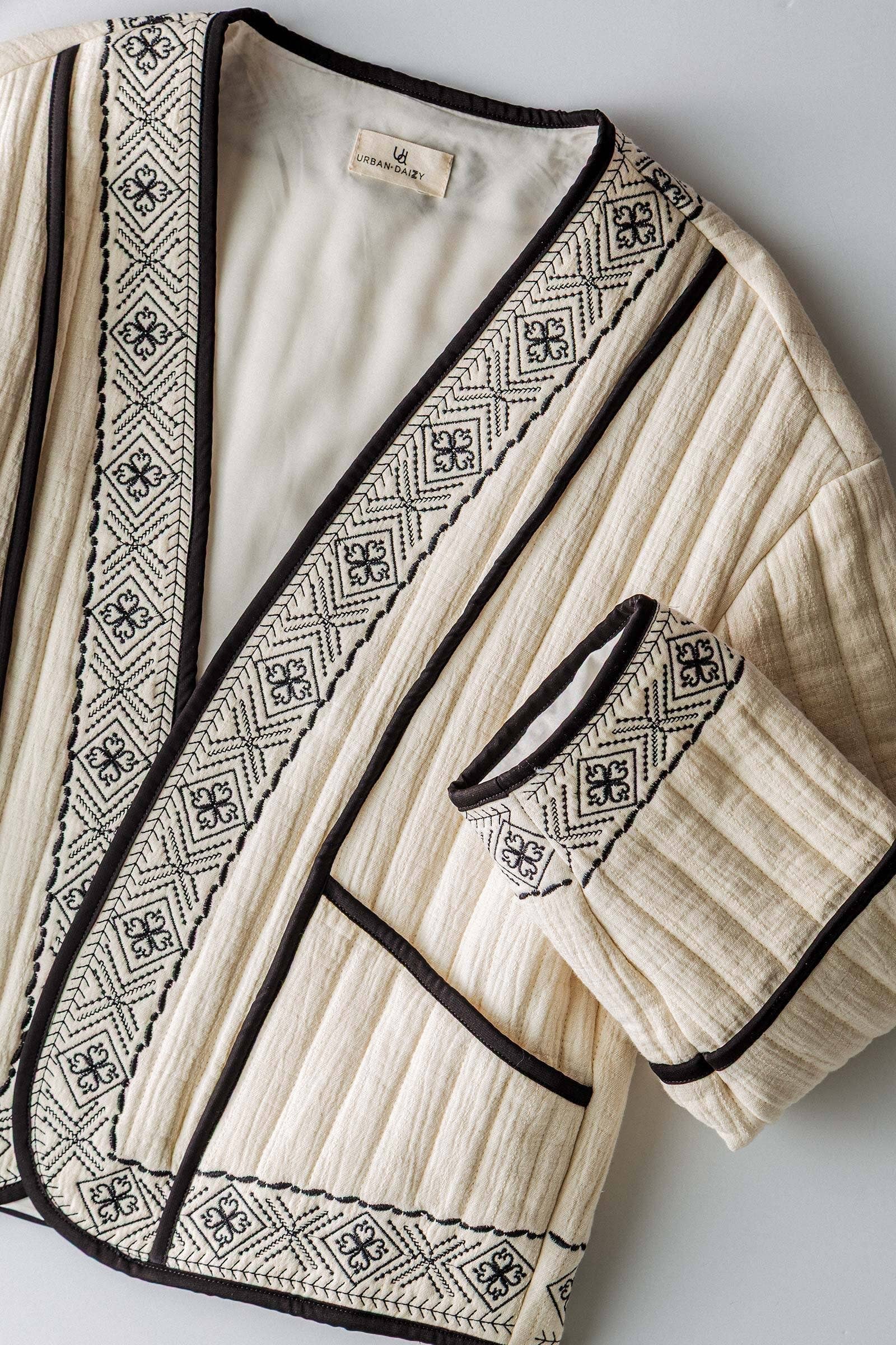 Crafted from a soft cotton-linen blend, it features intricate embroidery, bold contrast piping, and a relaxed, boxy fit with wide sleeves and a slightly cropped length—perfect for layering over dresses, jeans, or sets.