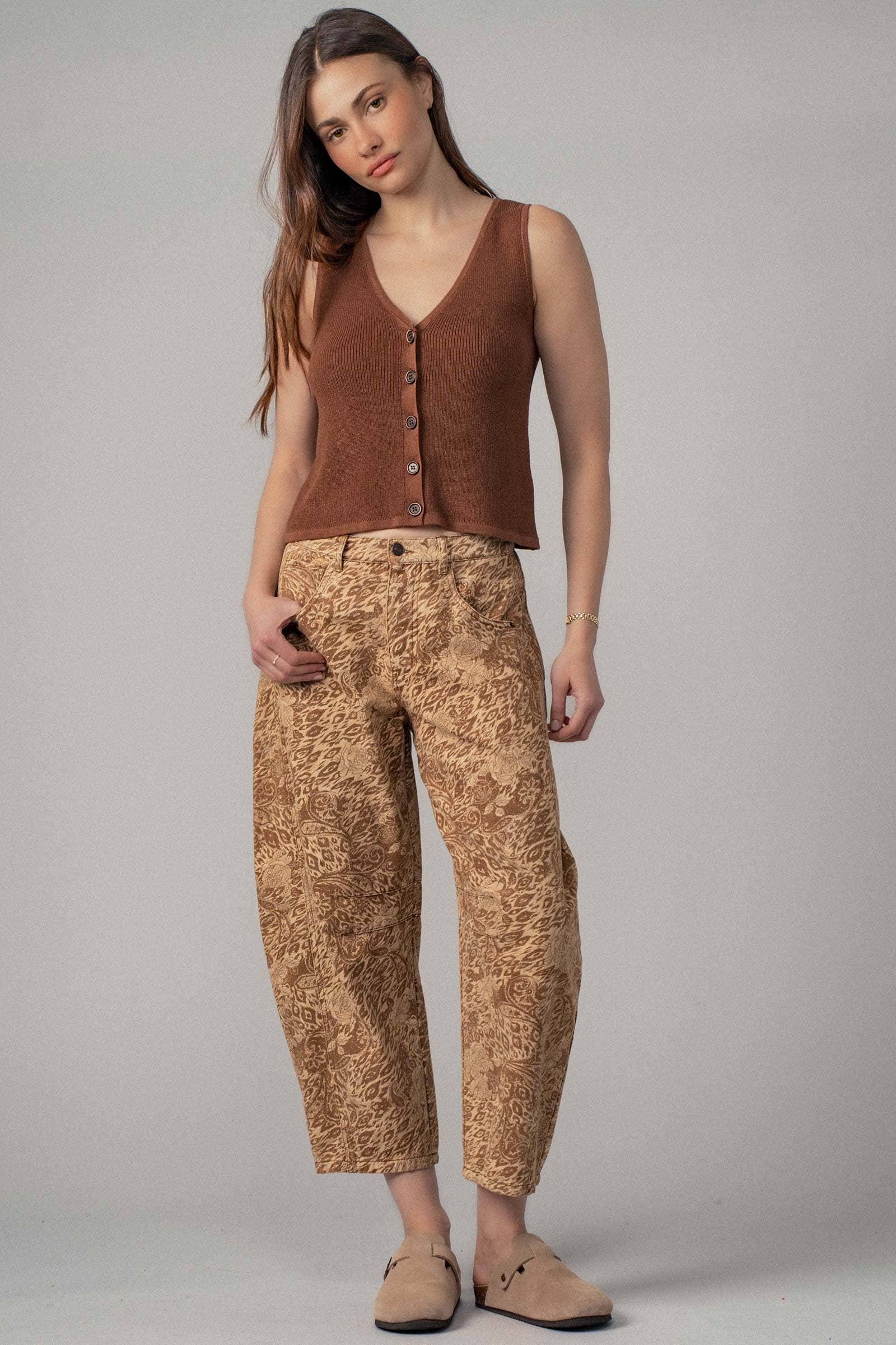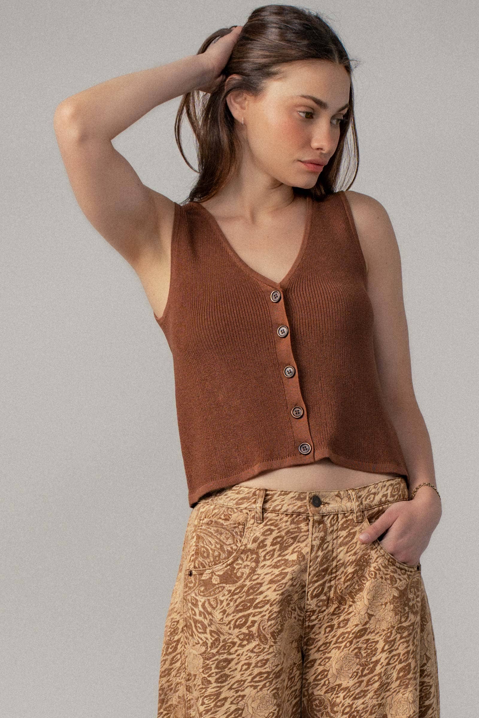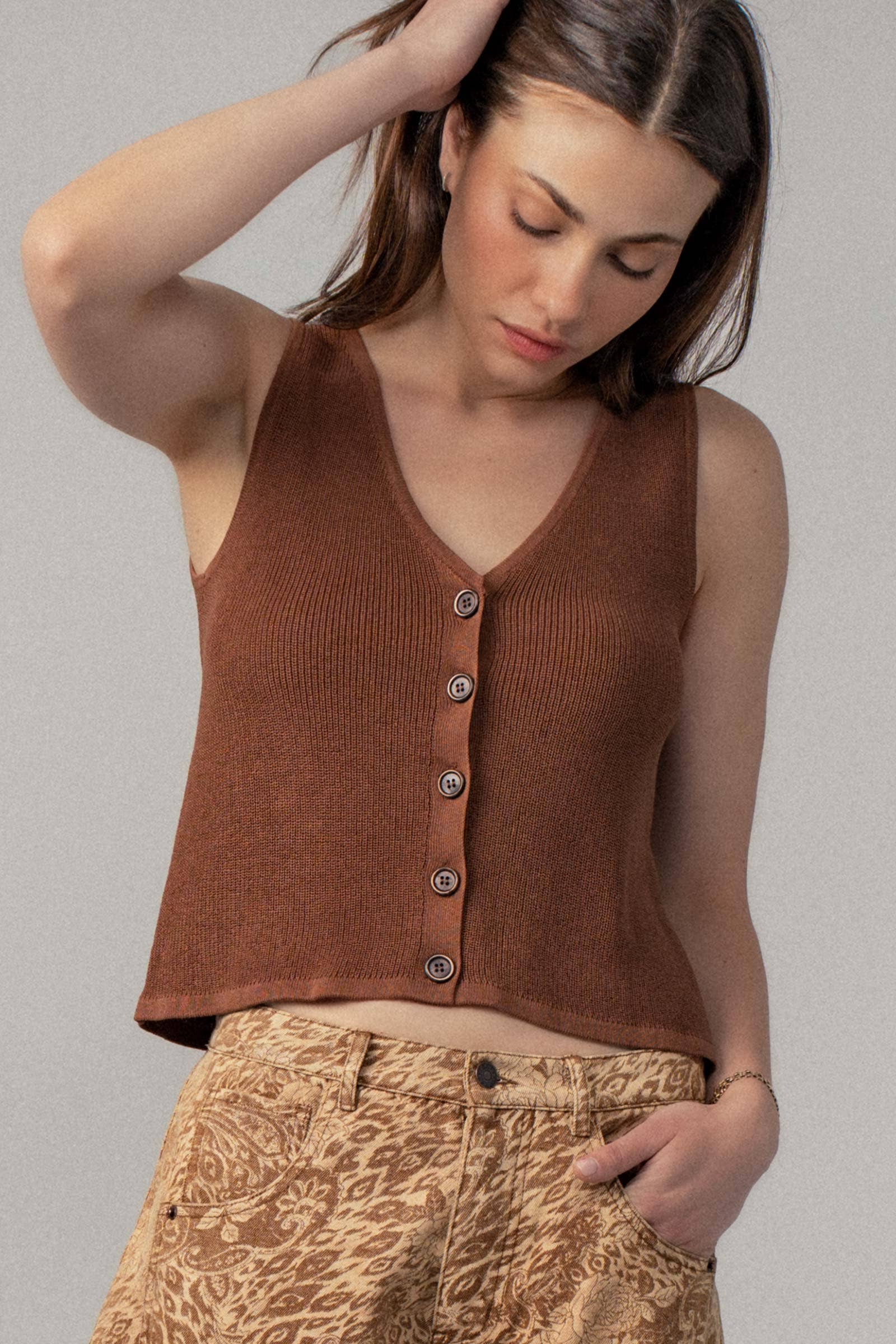 Breathable crochet knit vest, ideal for layering or styling solo. Its button-front detail and relaxed shape offer casual ease perfect for warm-weather days and game day layering.
