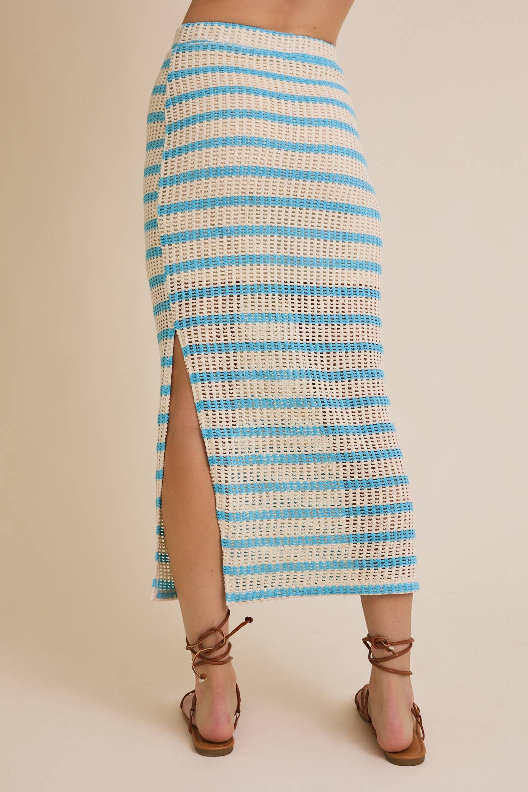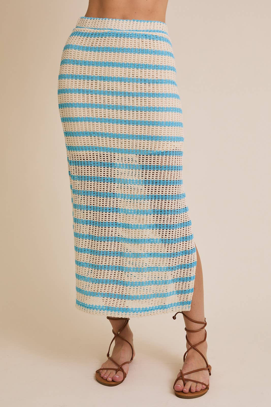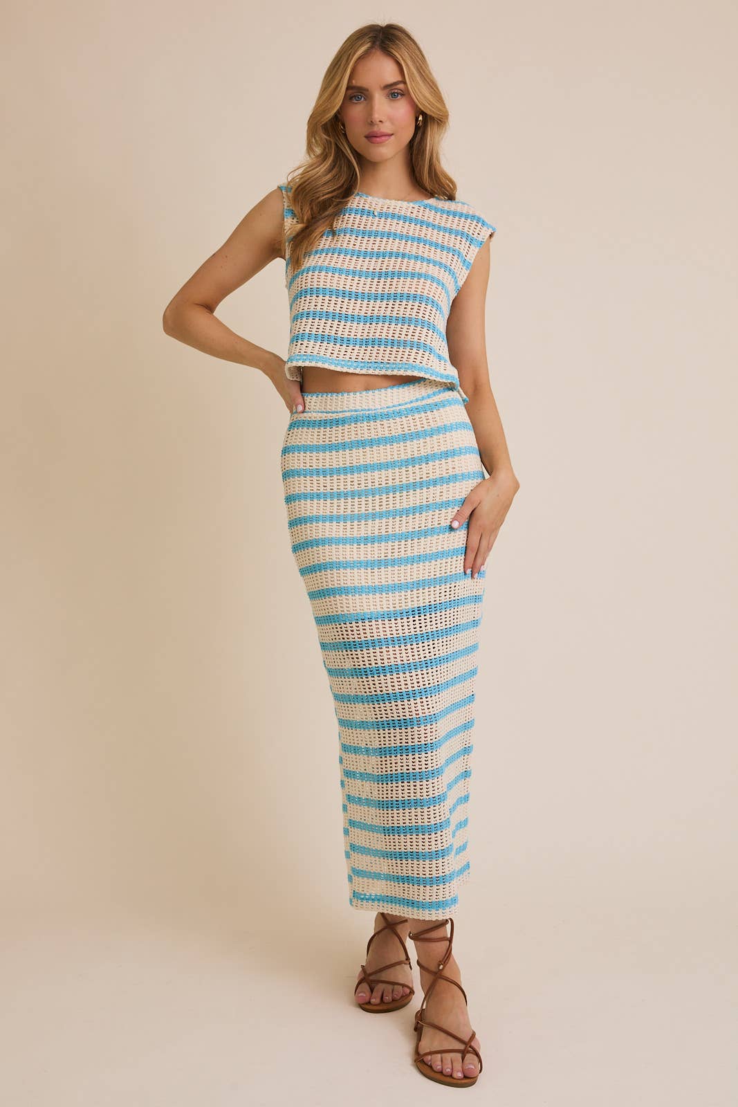 CAP SLEEVE STRIPE TOP AND WAIST ELASTIC STRIPE MIDI SKIRT