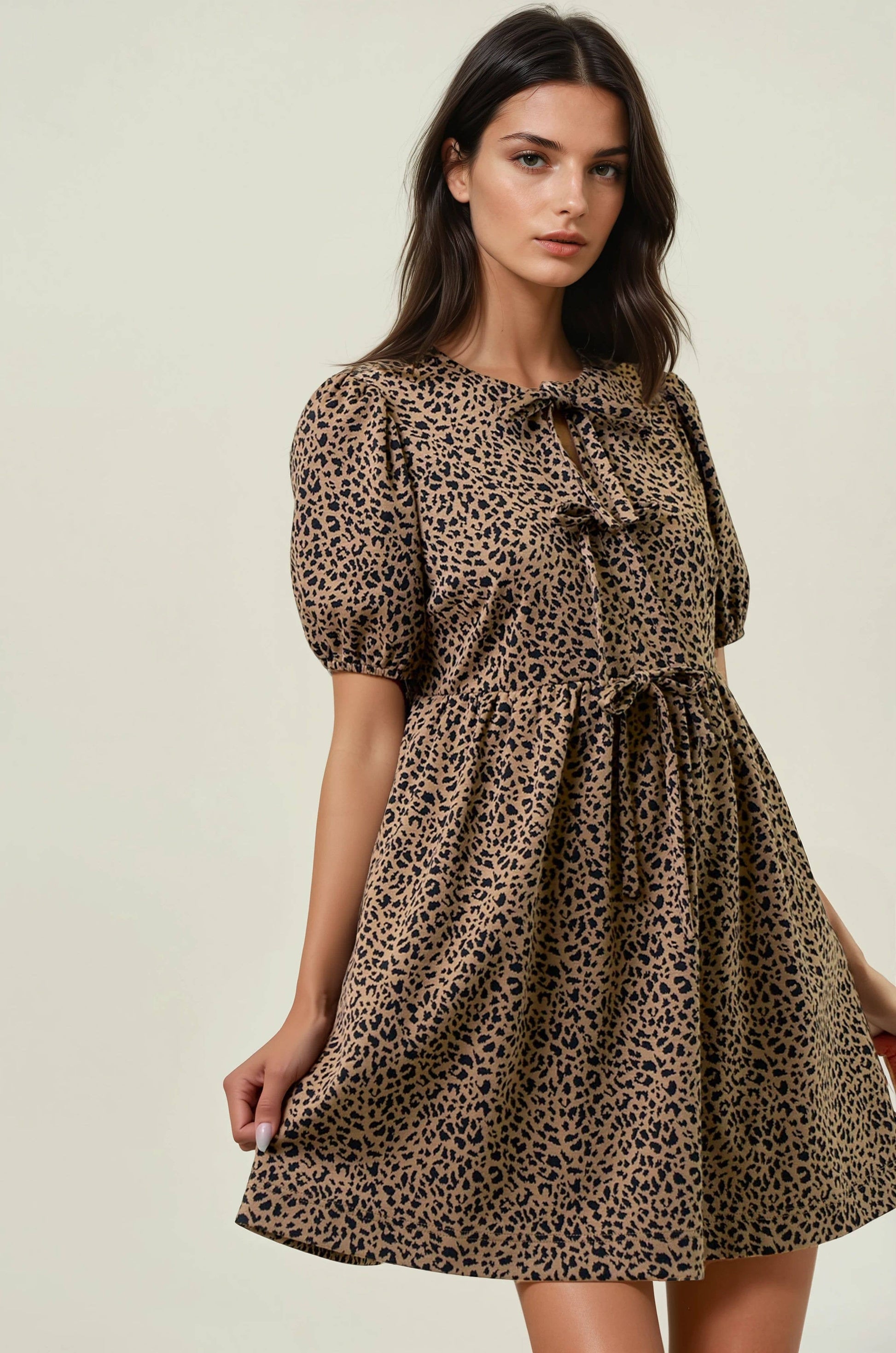 COTTON ANIMAL PUFF SHORT SLEEVE BOW TIE FRONT DRESS - animal print pattern in neutral tones - Sleeves: Puff short sleeves add a feminine, stylish touch - Neckline: Features a bow tie front for added charm and adjustability - Fit: Relaxed, peplum silhouette with a gathered waist for a flattering shape.