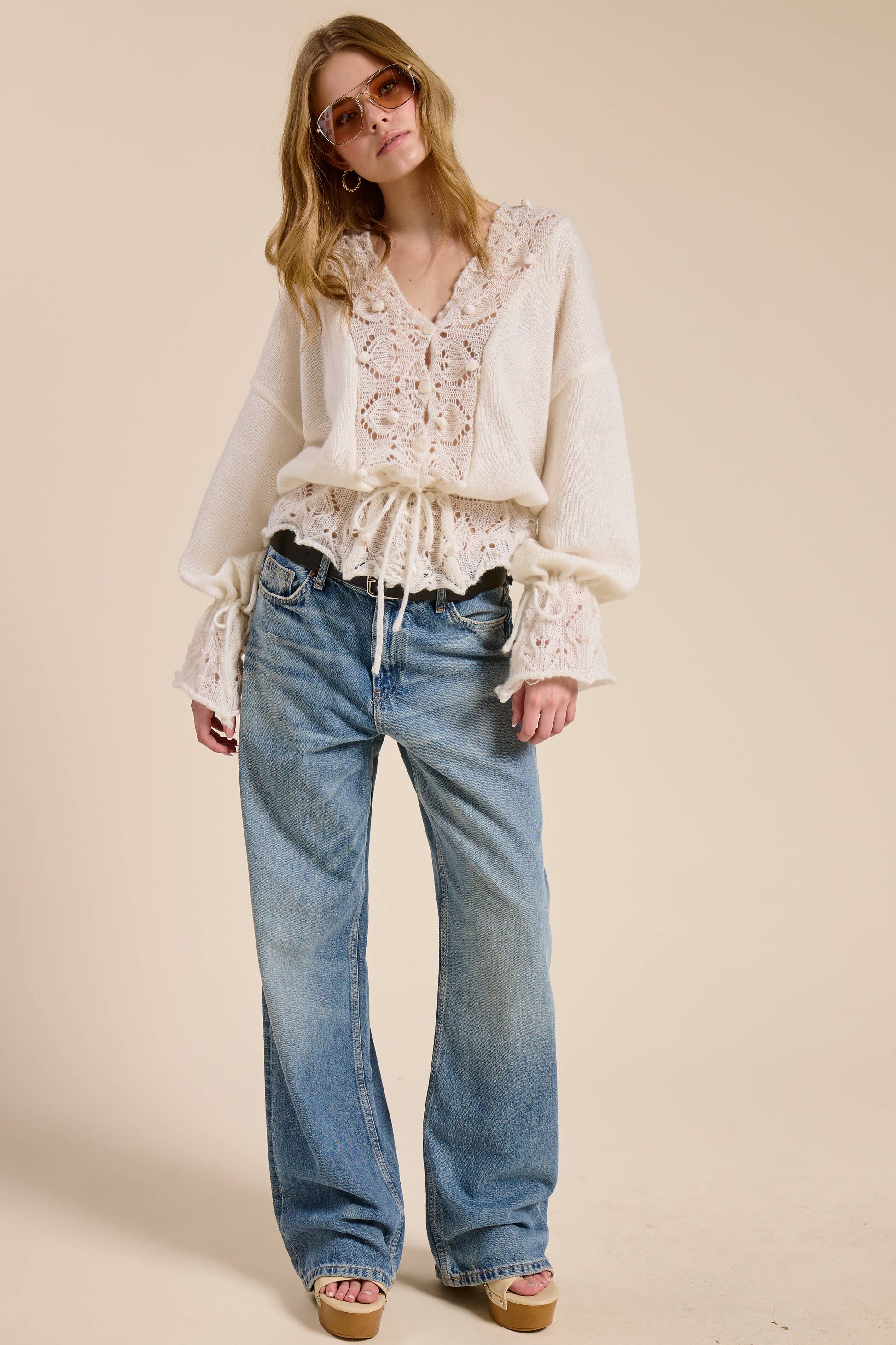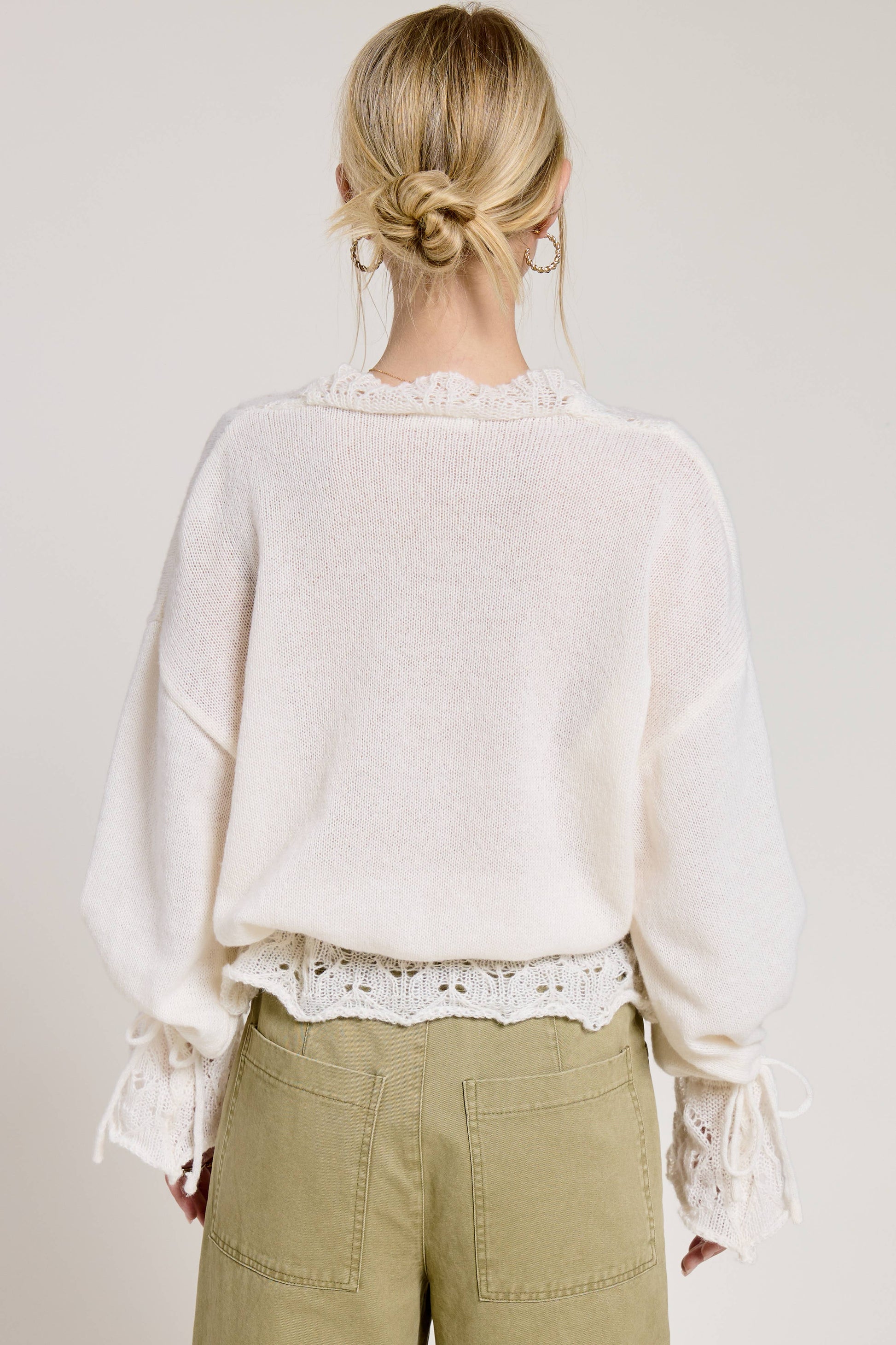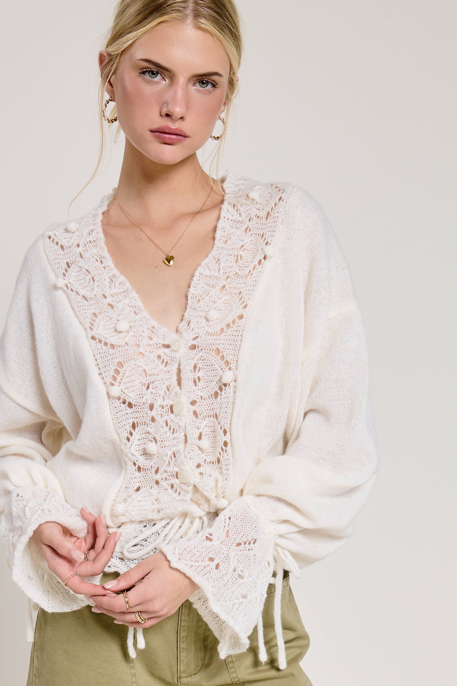 This romantic top features an intricate crochet lace trim along the neckline, cuffs, and hem, bringing texture and charm to any outfit. • Soft lightweight knit fabric • Crochet lace trim with pom detailing • V-neckline and button front accents • Flared long sleeves with drawstring