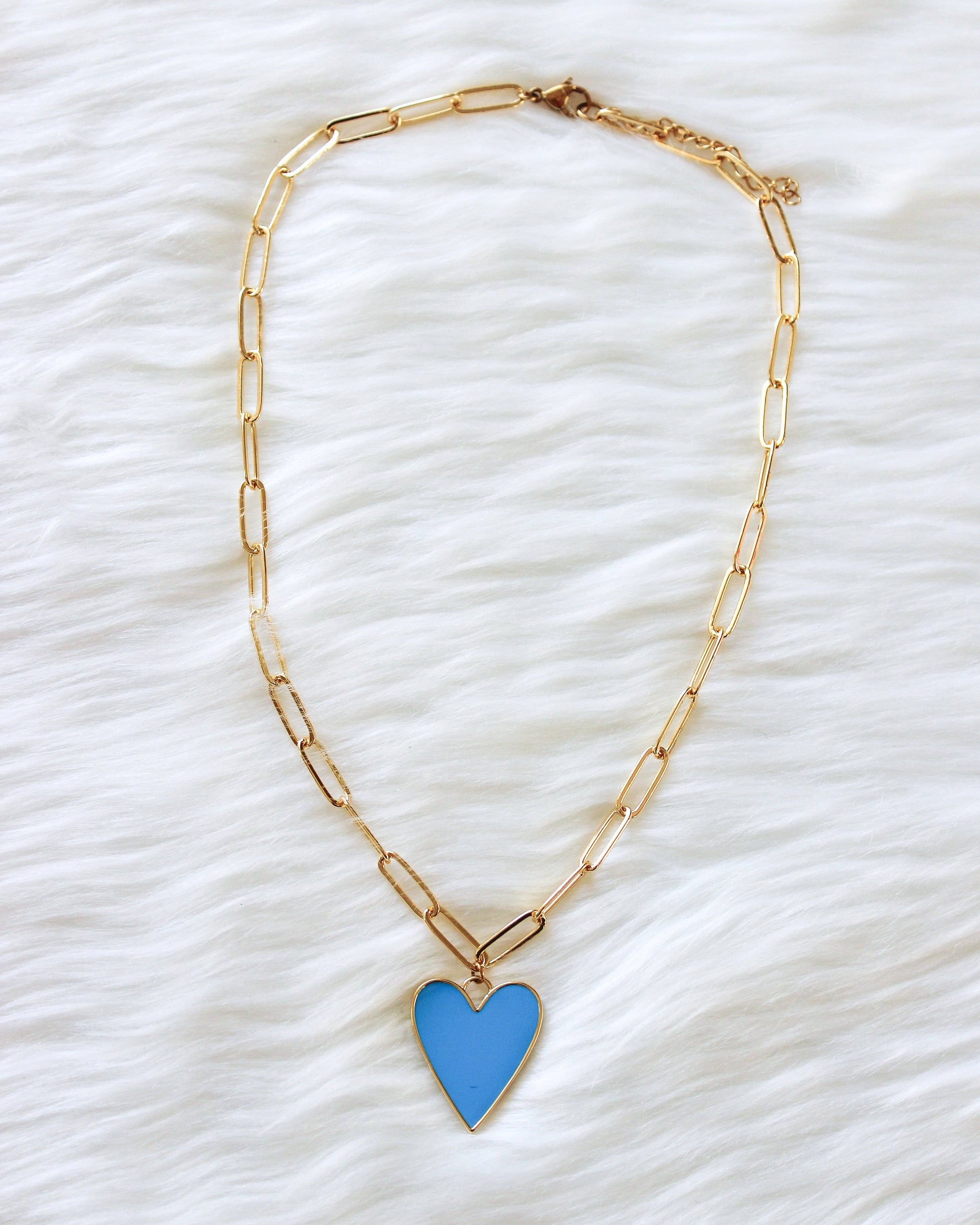16 inch paperclip chain necklace with a blue enamel heart pendant. Tarnish resistant chain. 2 inch extender.