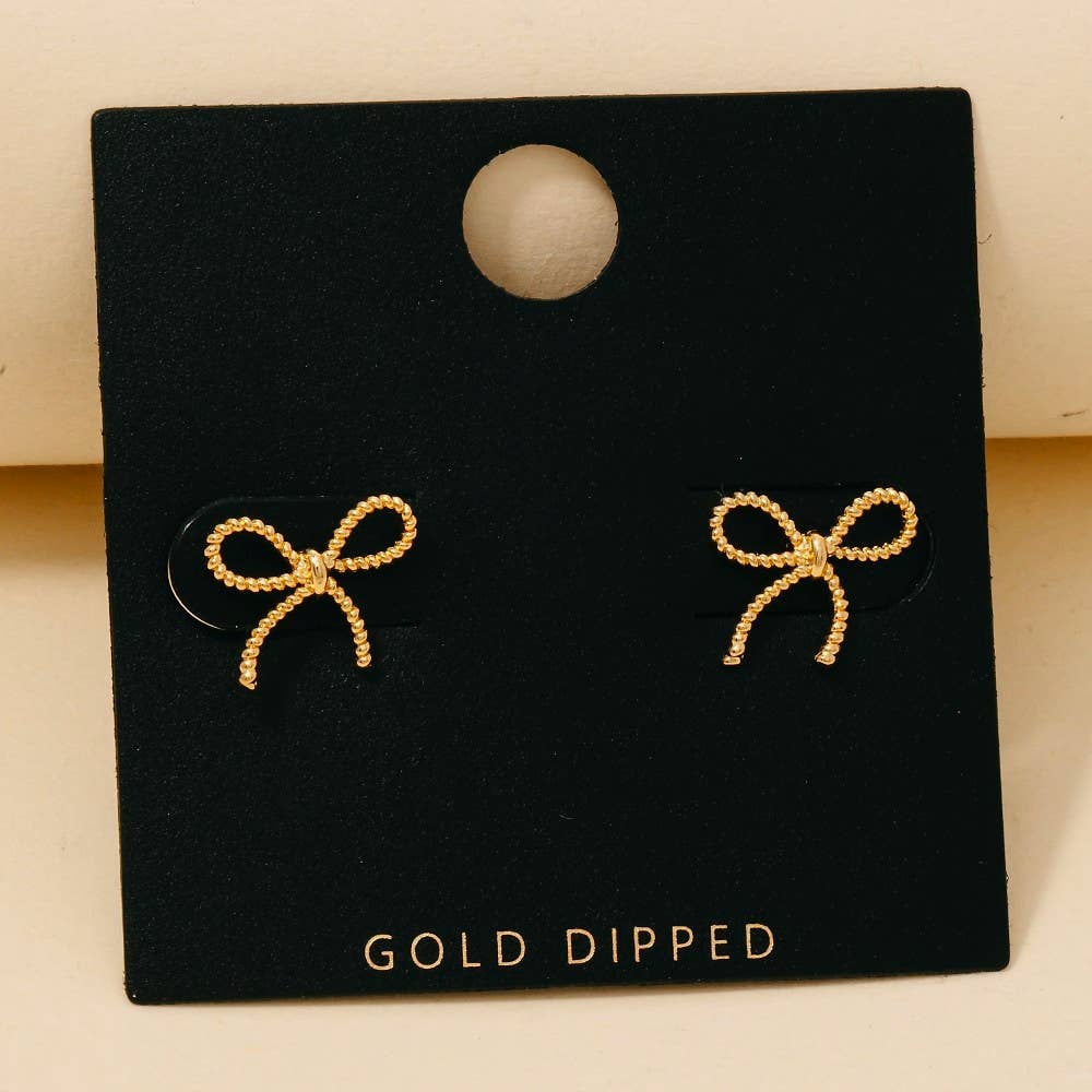 Unleash your inner fashionista, this pair of stud earrings carries a charming gold dipped ribbon bow design. This item is perfect for anyone who loves to accessorize and add some personality to their outfits.