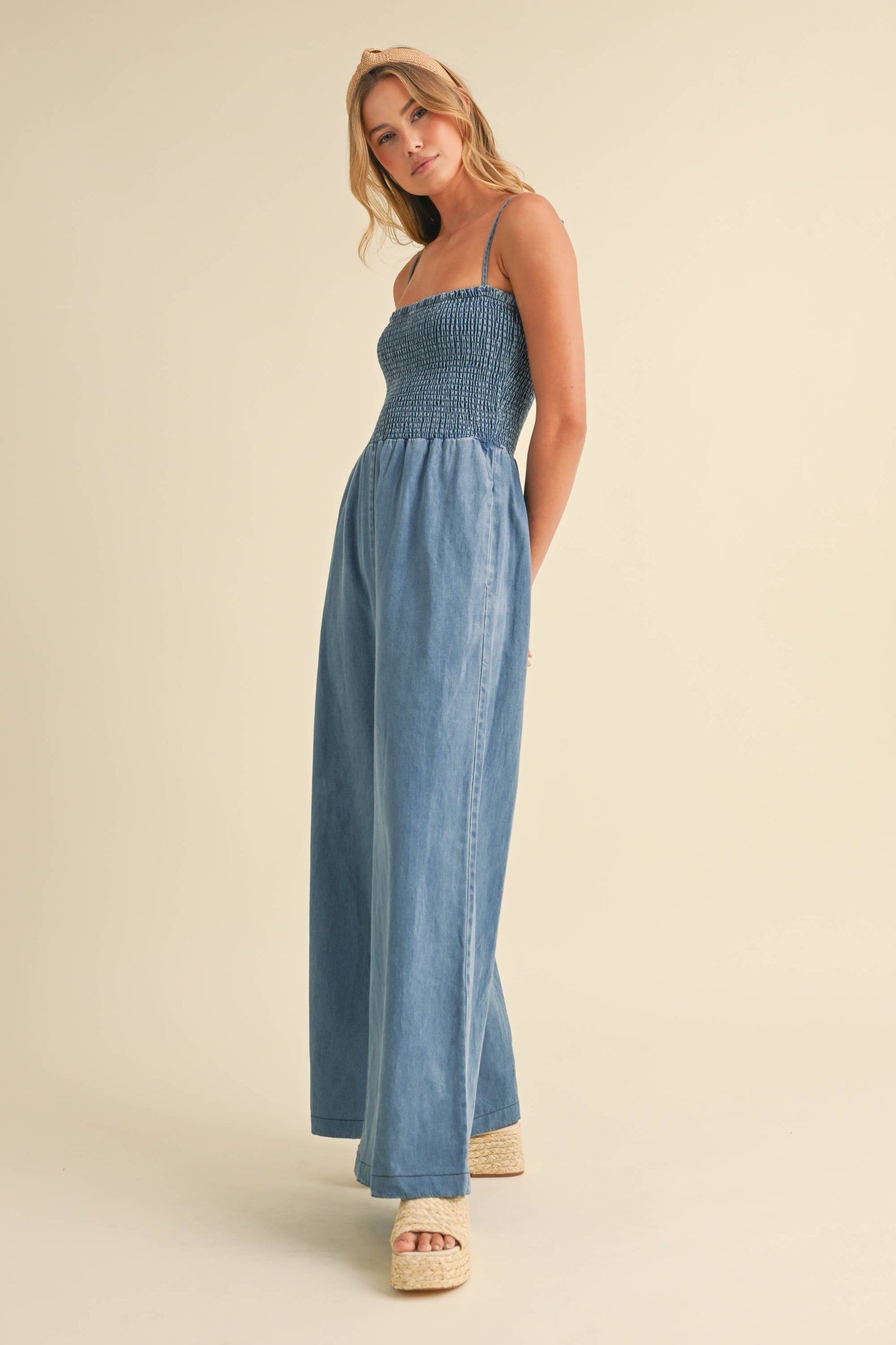 SMOCKED SPAGHETTI STRAP WIDE LEG JUMPSUIT WITH SIDE POCKETS