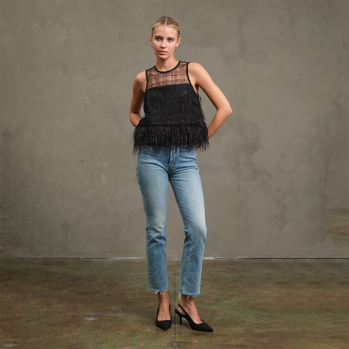 Elevate your look with this festive-meets-chic feather trim top. Sheer plaid mesh yoke with subtle sparkle -Fully lined bodice for comfortable wear -Feather trim at hem for a glamorous, playful touch -Back neck keyhole closure -Perfect for holiday parties, night outs, or dressing up your favorite denim. ** Model is wearing size SÂ