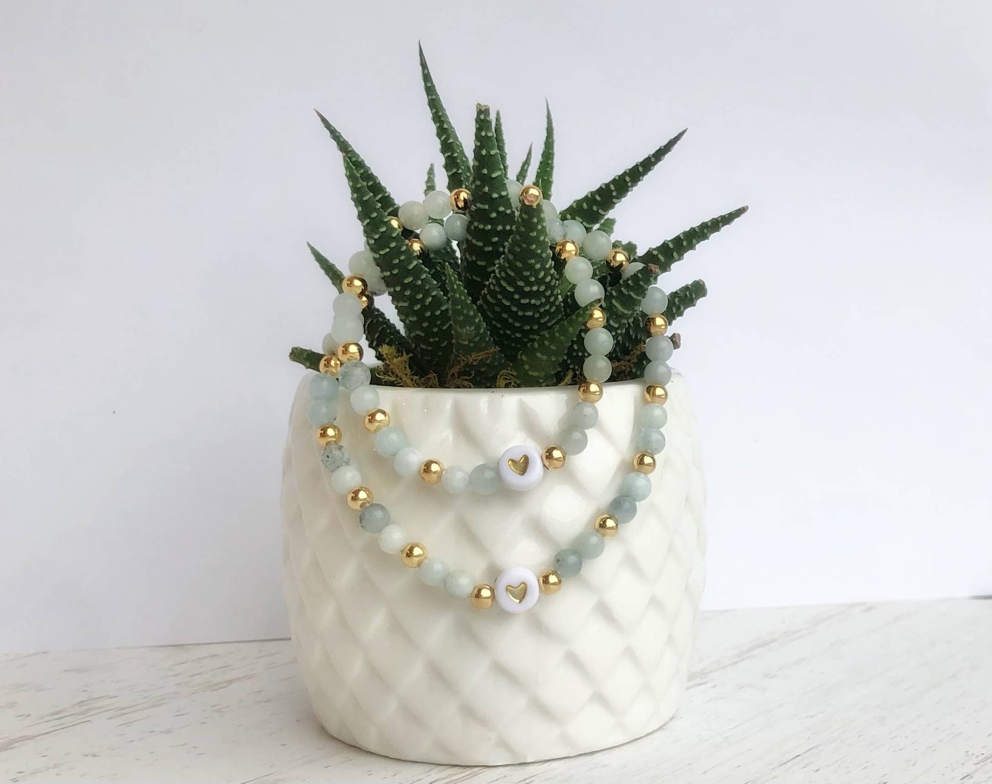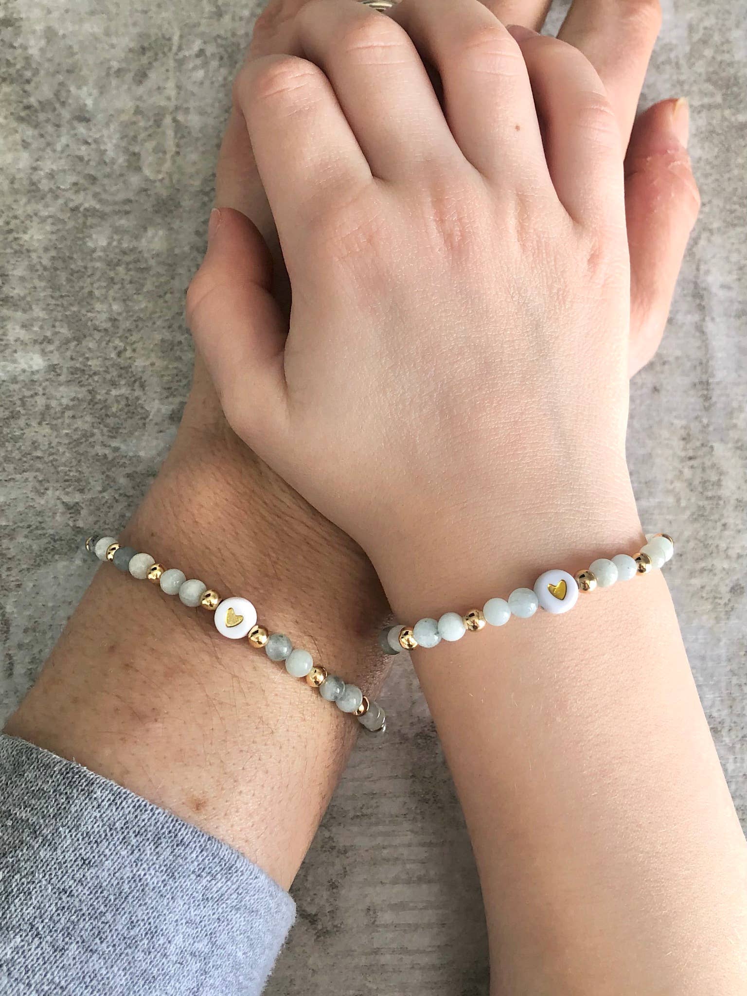 This is a beautiful set of matching mother/daughter beaded bracelets. These make a perfect gift for a mama and daughter duo, or any ladies who want to show their special connection. Matching with your little is always fun, and these dainty bracelets make dressing up even more special! This set of matching mother and daughter bracelets are made with aquamarine gemstones, 18k gold plated beads and a white bead with a gold heart and then strung together with a strong elastic. These simple little bracelets can help your little ones feel connected to their loved ones. Length: Mama bracelet is made to a standard 7 inches; Mini Bracelet is made to a standard 5.5 inches (ages 4-8).