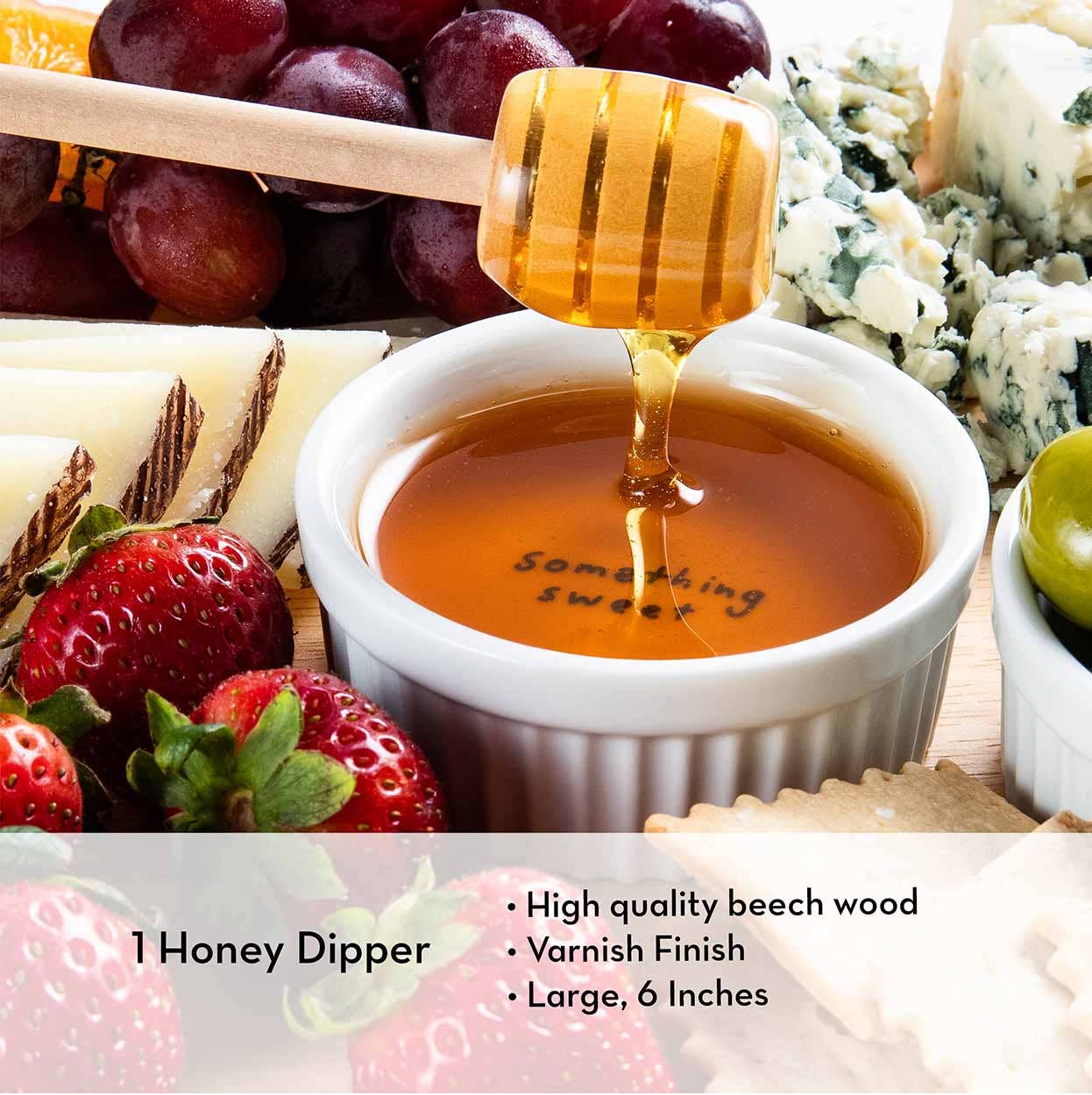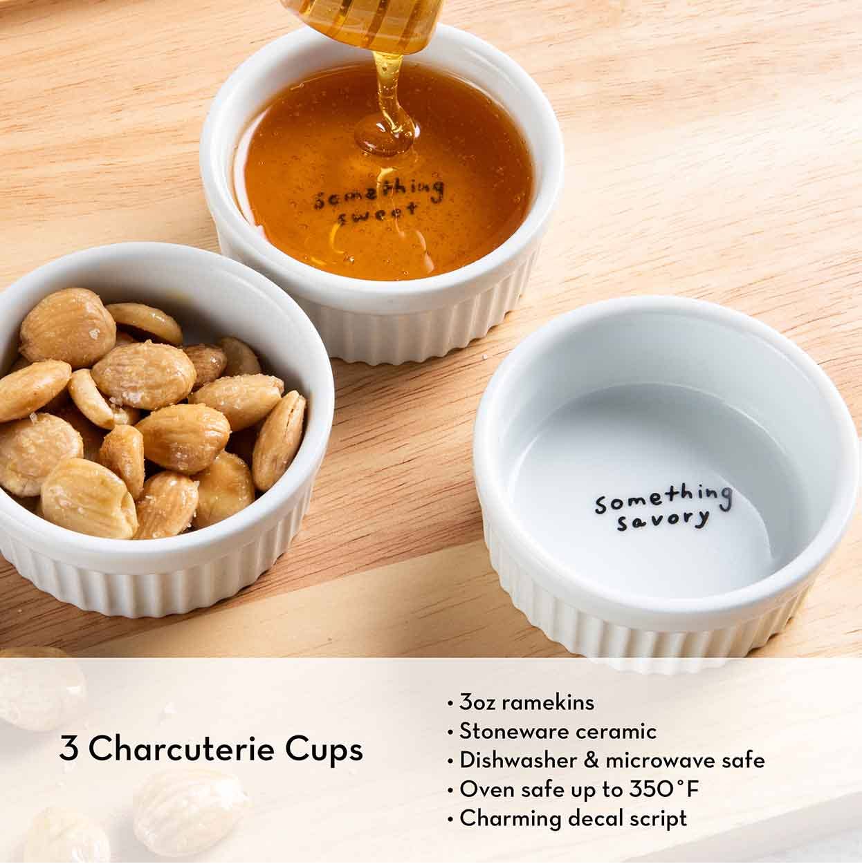 Kit Includes: Premium 18 x 10” Board: This XL rubber wood cheese board features raised edges and an easy-to-clean, varnish finish making post-party cleanup a breeze. Three Gold Cheese Knives: Embossed with the labels 'soft cheese,' 'semi-soft cheese,' and 'spreads,' this set ensures you effortlessly match the right knife to each type of cheese. Each knife is approximately 5.5". Three Large Ceramic Ramekins: These 3oz, stoneware ceramic ramekins have a glazed finish and are dishwasher, microwave, and oven safe up to 350 degrees. They feature charming decal words on the bottom, labeled 'something savory', 'something crunchy', and 'something sweet.' Wooden Honey Dipper: Recommending honey as your 'something sweet', we've included a beech wooden, 6" honey dipper with a varnish finish- perfect for drizzling over