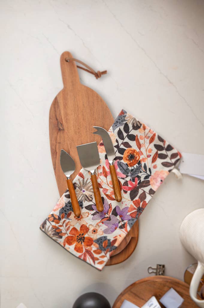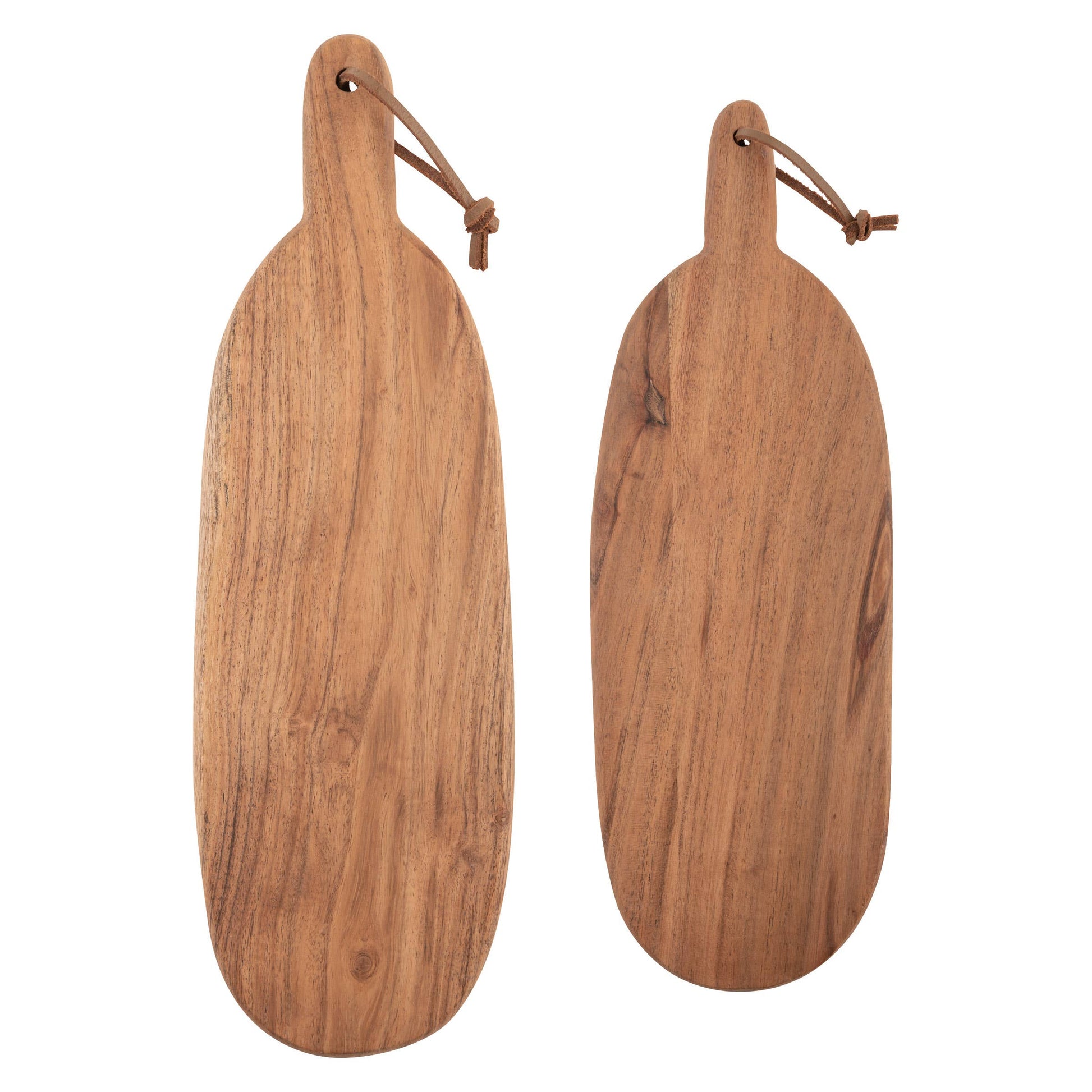 This classic set of Oval Paddle Boards is perfect for serving appetizers, charcuterie or drinks. Made from acacia wood, they have a beautiful natural, organic tone and a raw edge cut for a classic shape. Their attached leather handles make it easy to hang when they are not being used or to carry from kitchen to table. Details Set of 2 Hand wash only