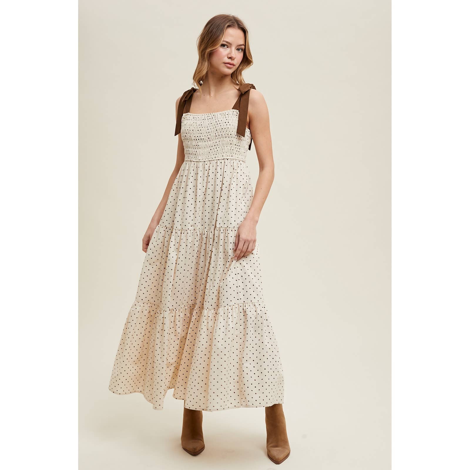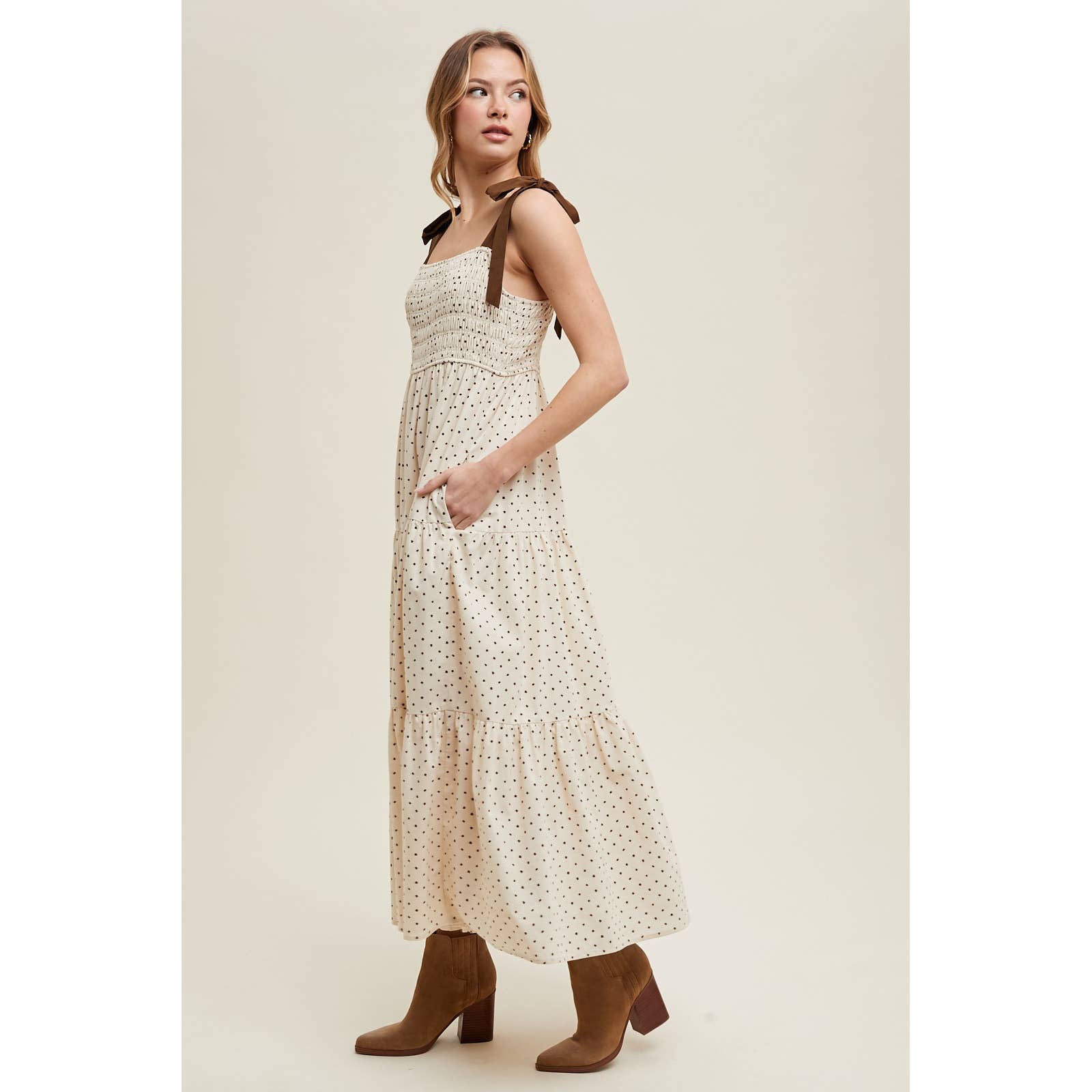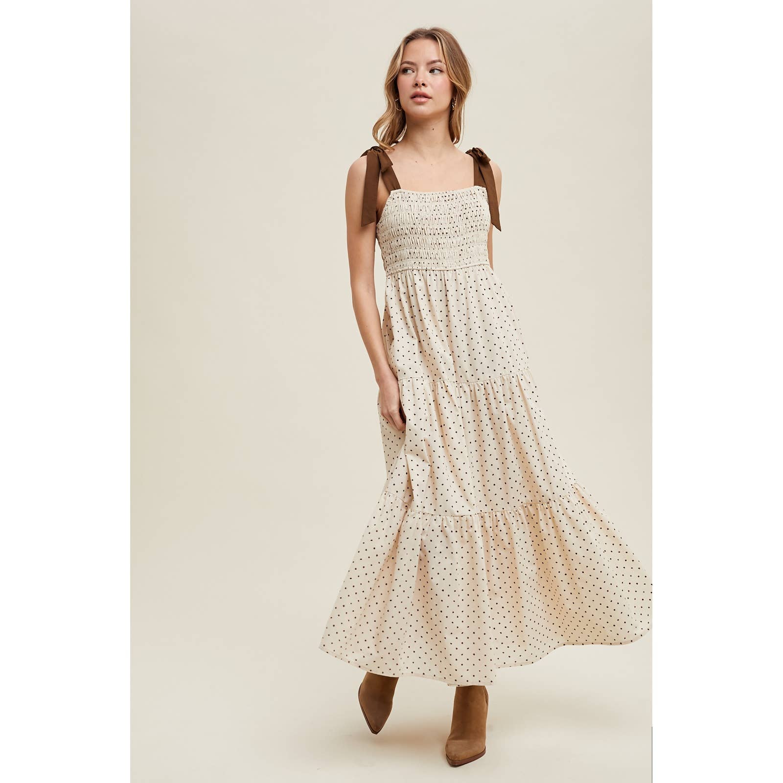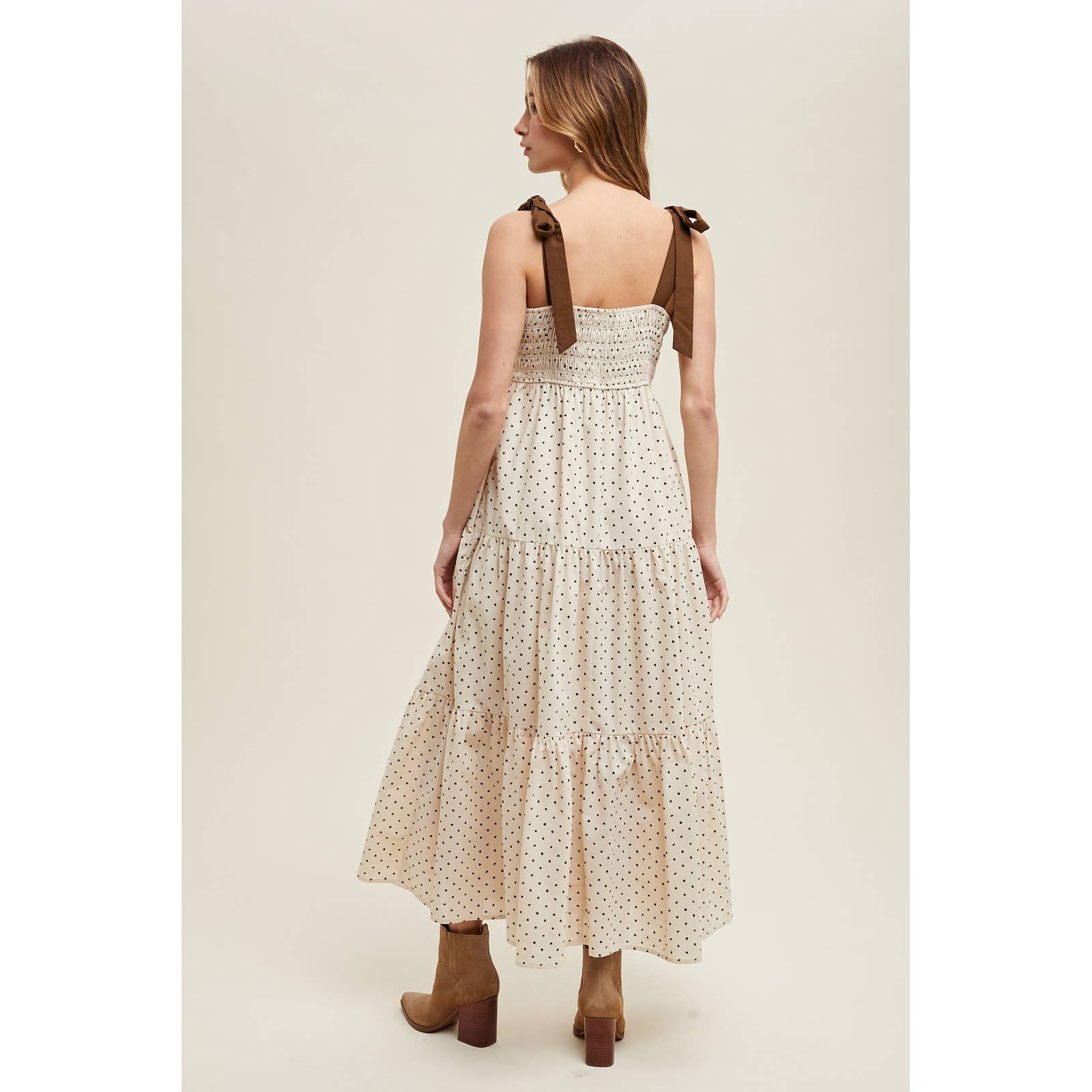 POLKA DOT TIERED MIDI DRESS - SELF TIE SHOULDER STRAPS - SMOCKED BODICE - SIDE POCKETS AND LINED