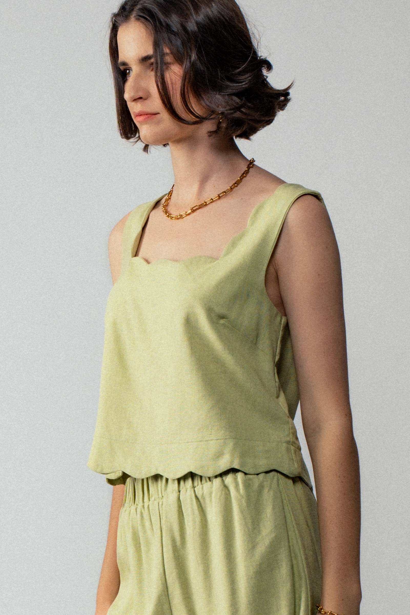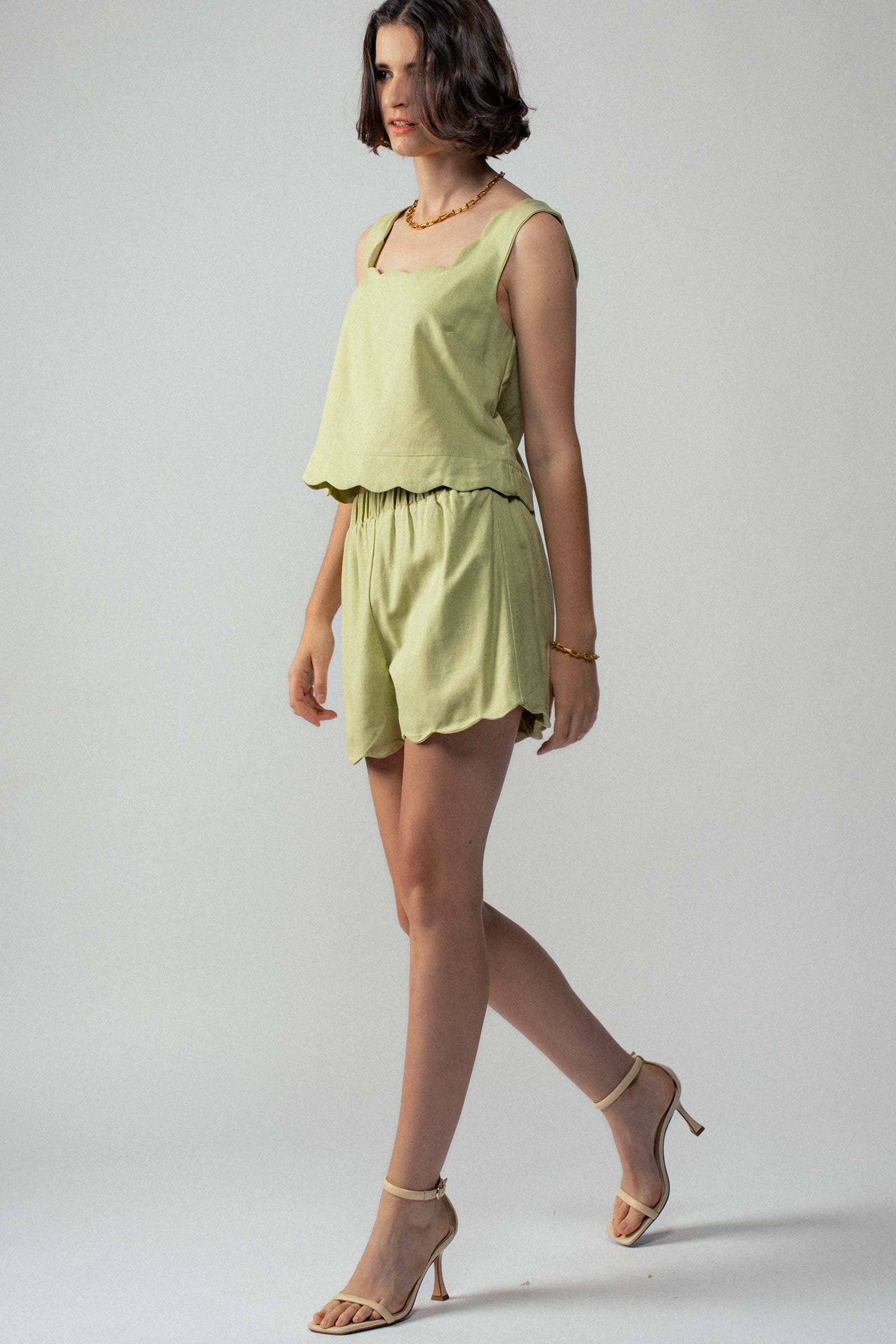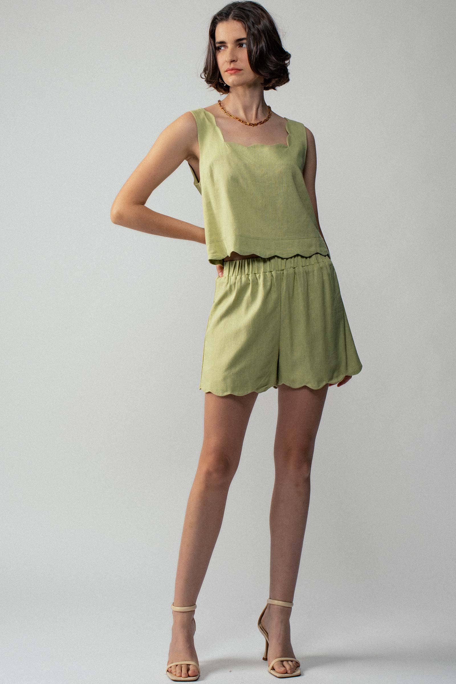 These playful yet sophisticated shorts feature charming scalloped hems and a comfortable elastic waistband, crafted from soft, airy linen-blend fabric.