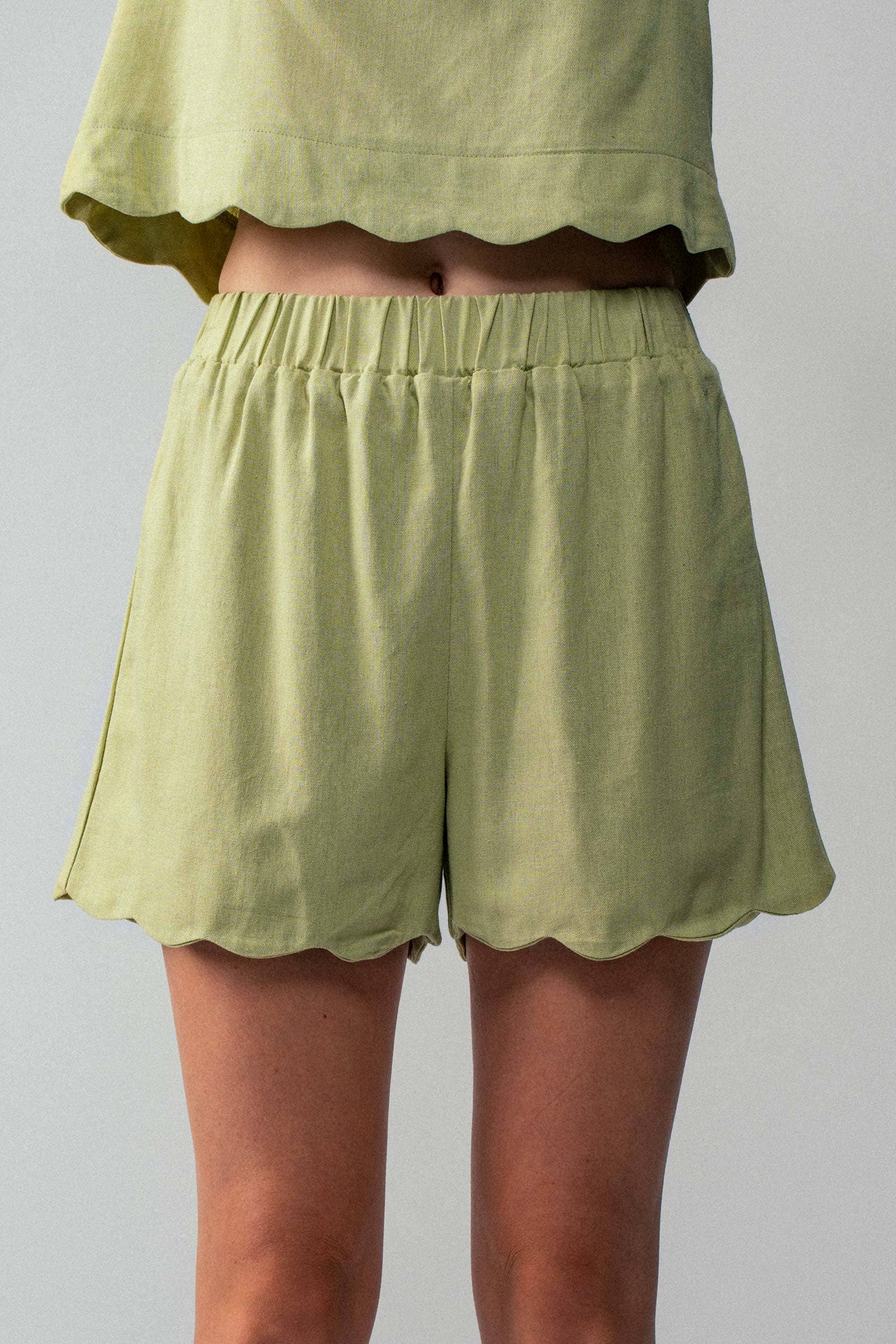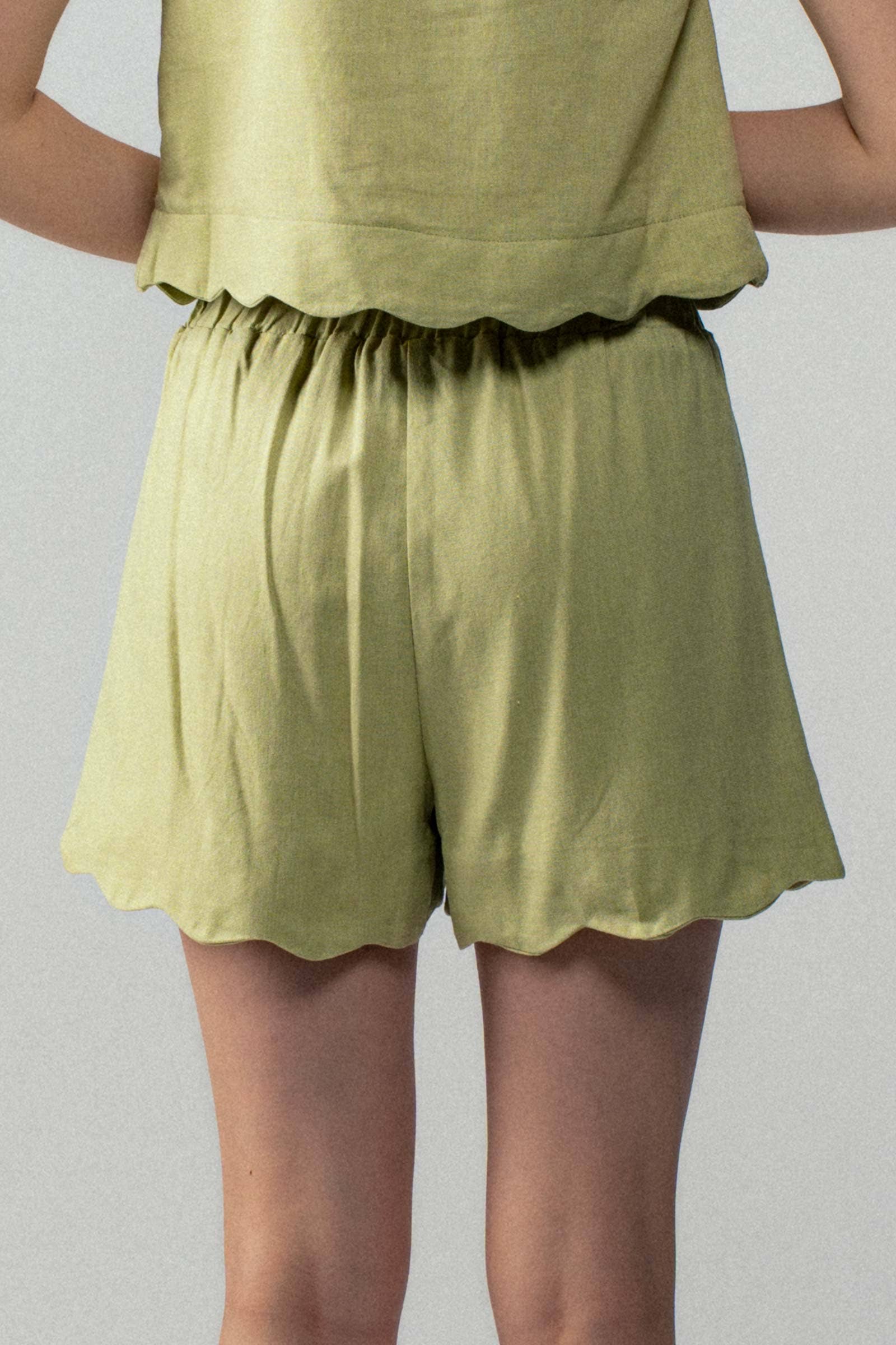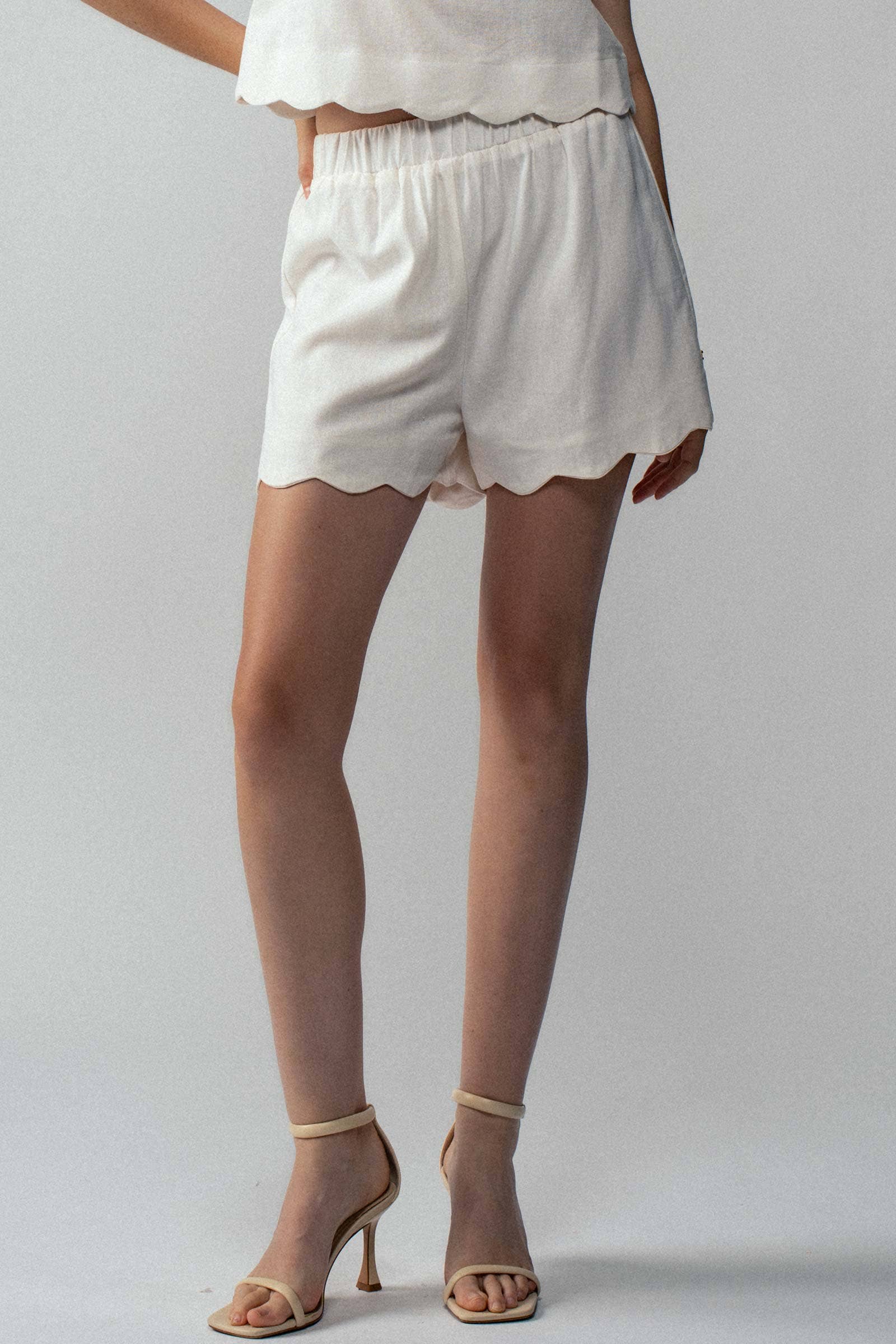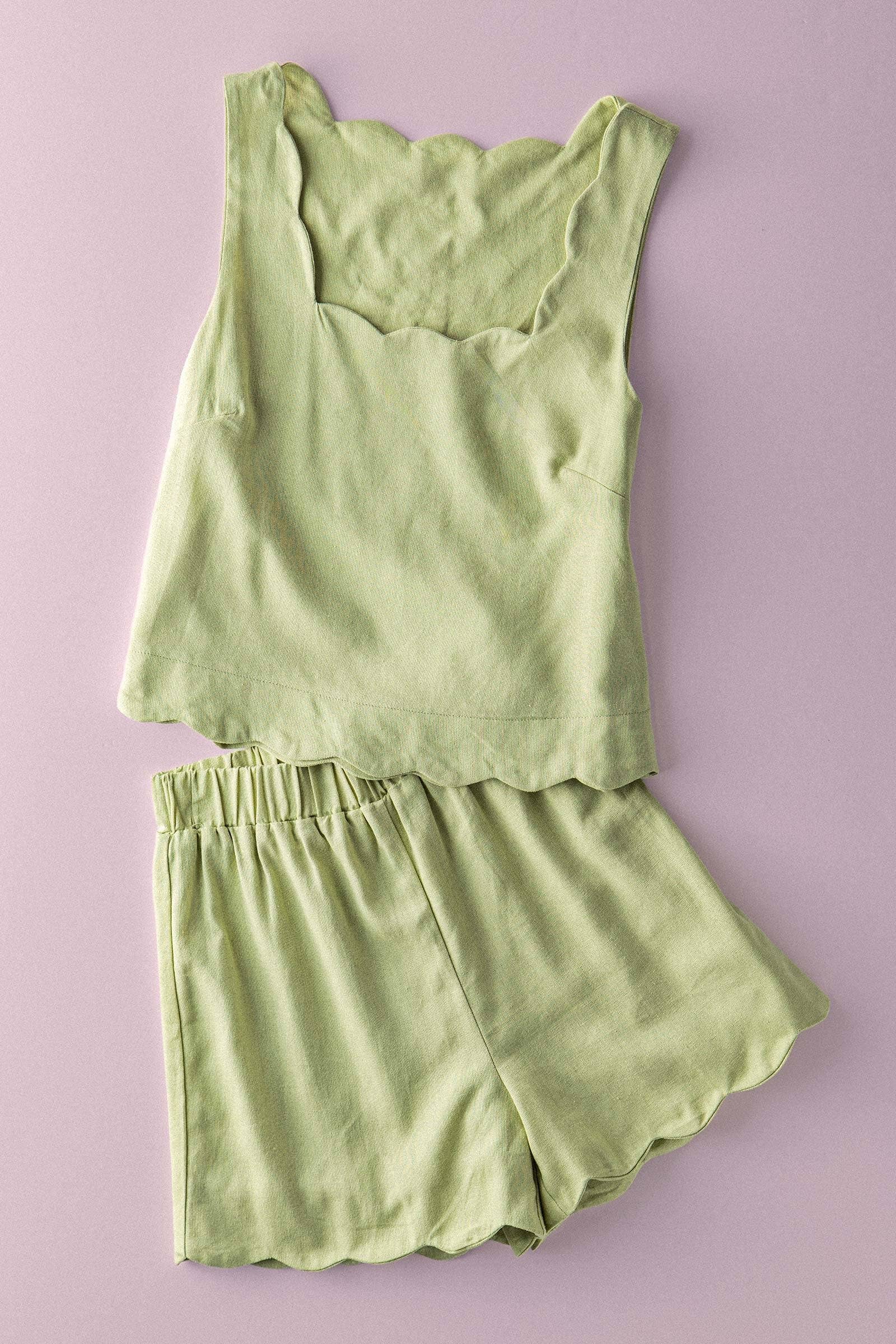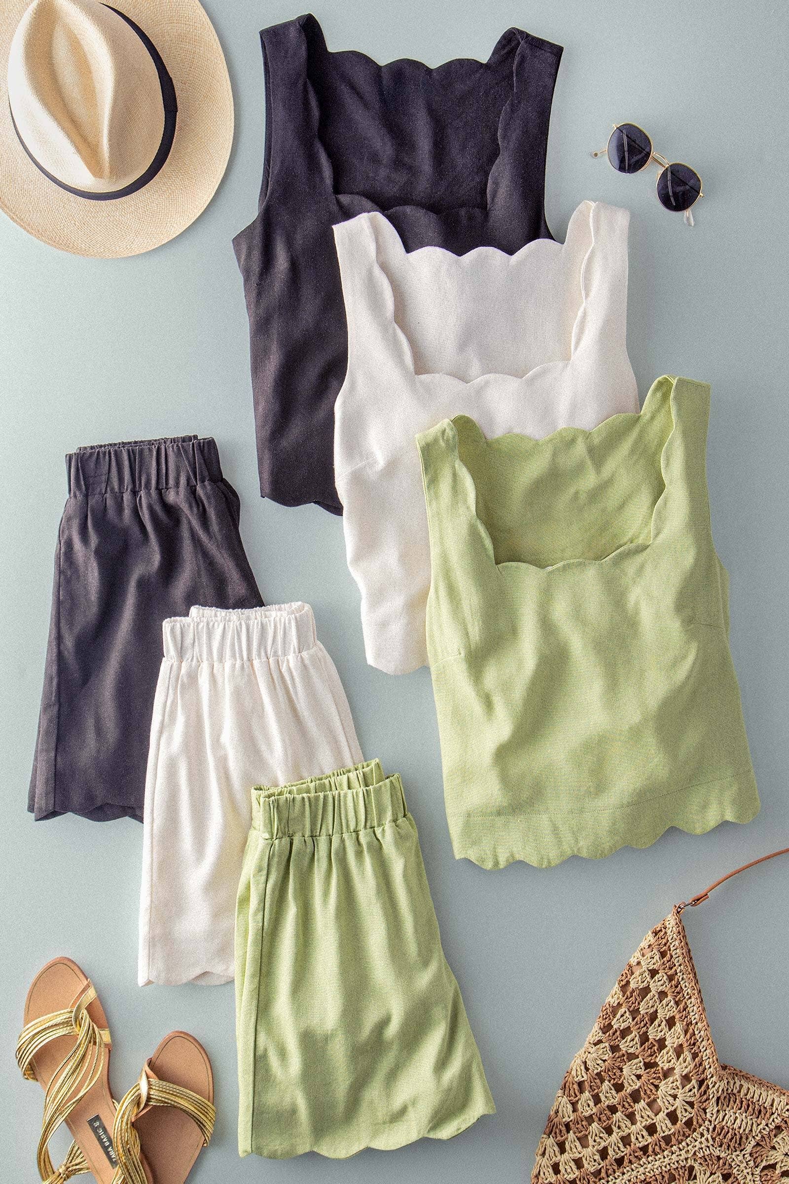 Lightweight, breathable linen-blend fabric and features a flattering square neckline with delicate scalloped detailing along the neckline and hem. Pairs effortlessly with shorts or skirts.