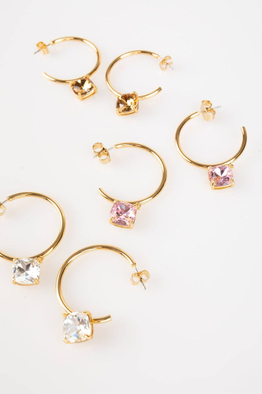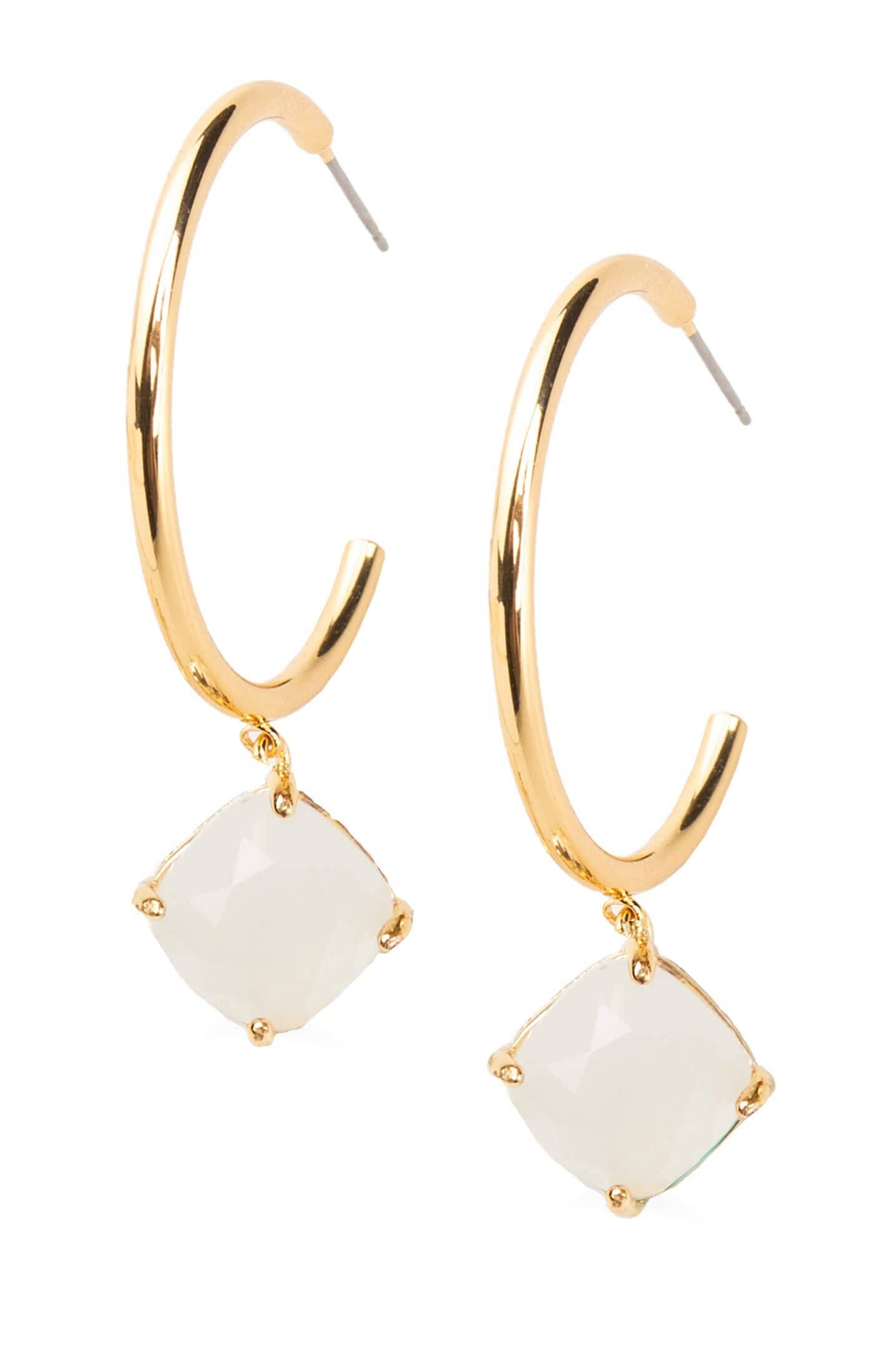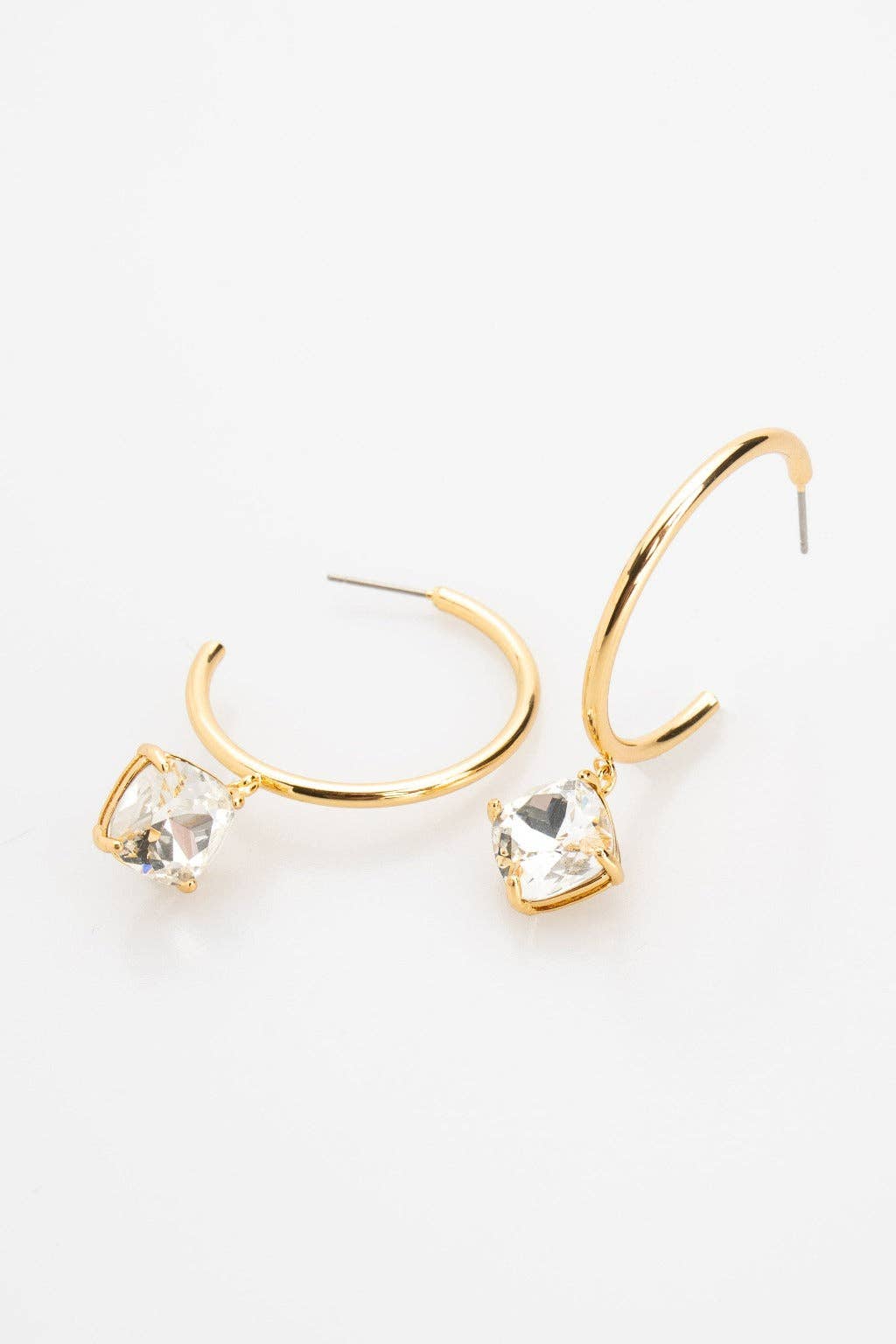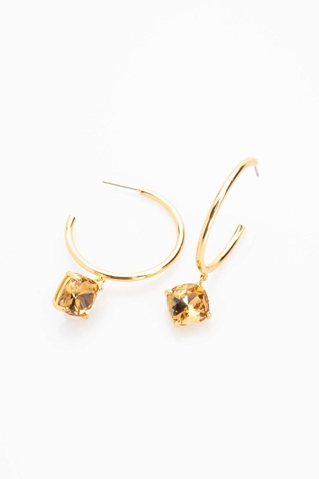 The perfect dress-down hoop - 1.25" hoop with 12mm glass stone charm - hypoallergenic + lead-free posts - gold-plated