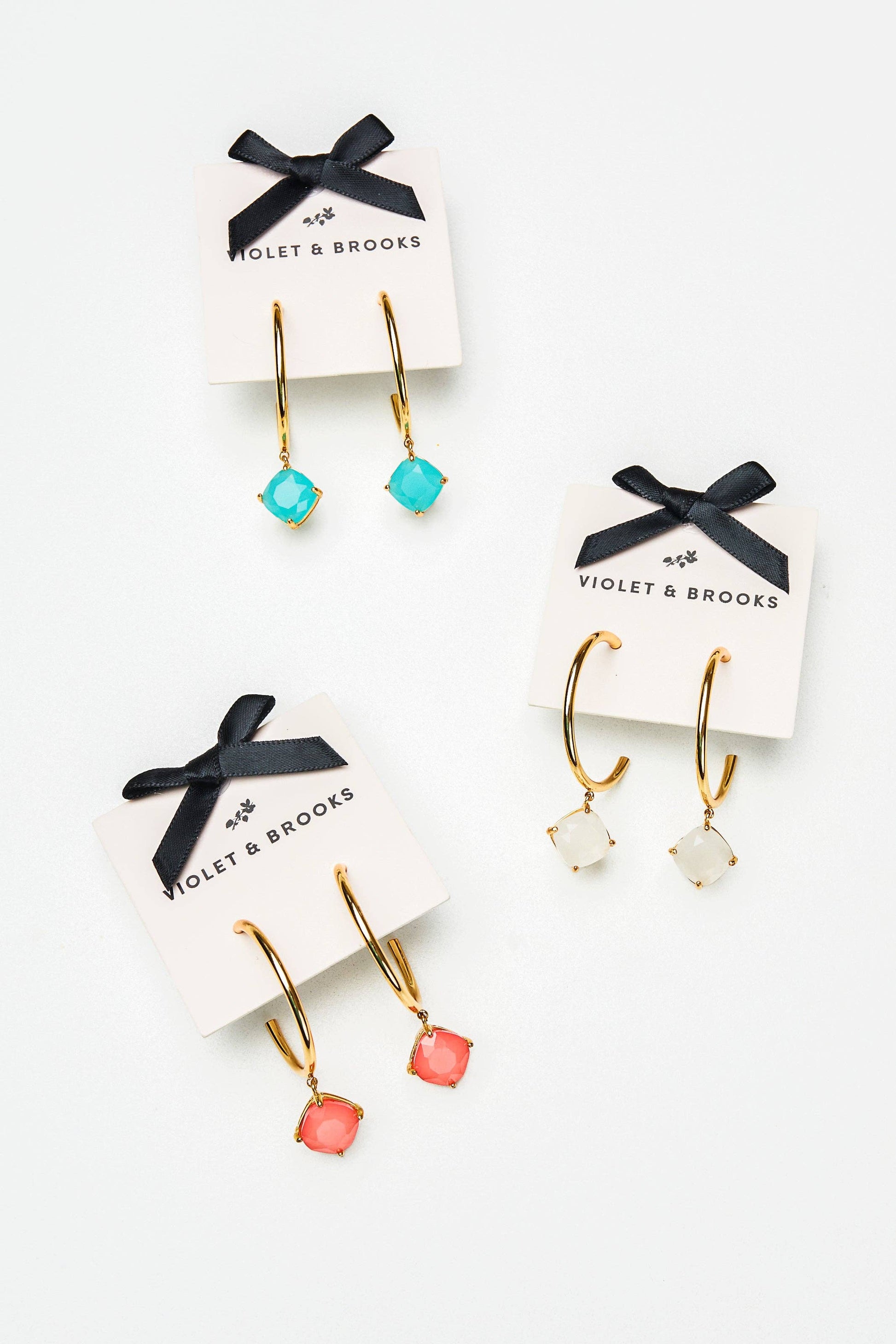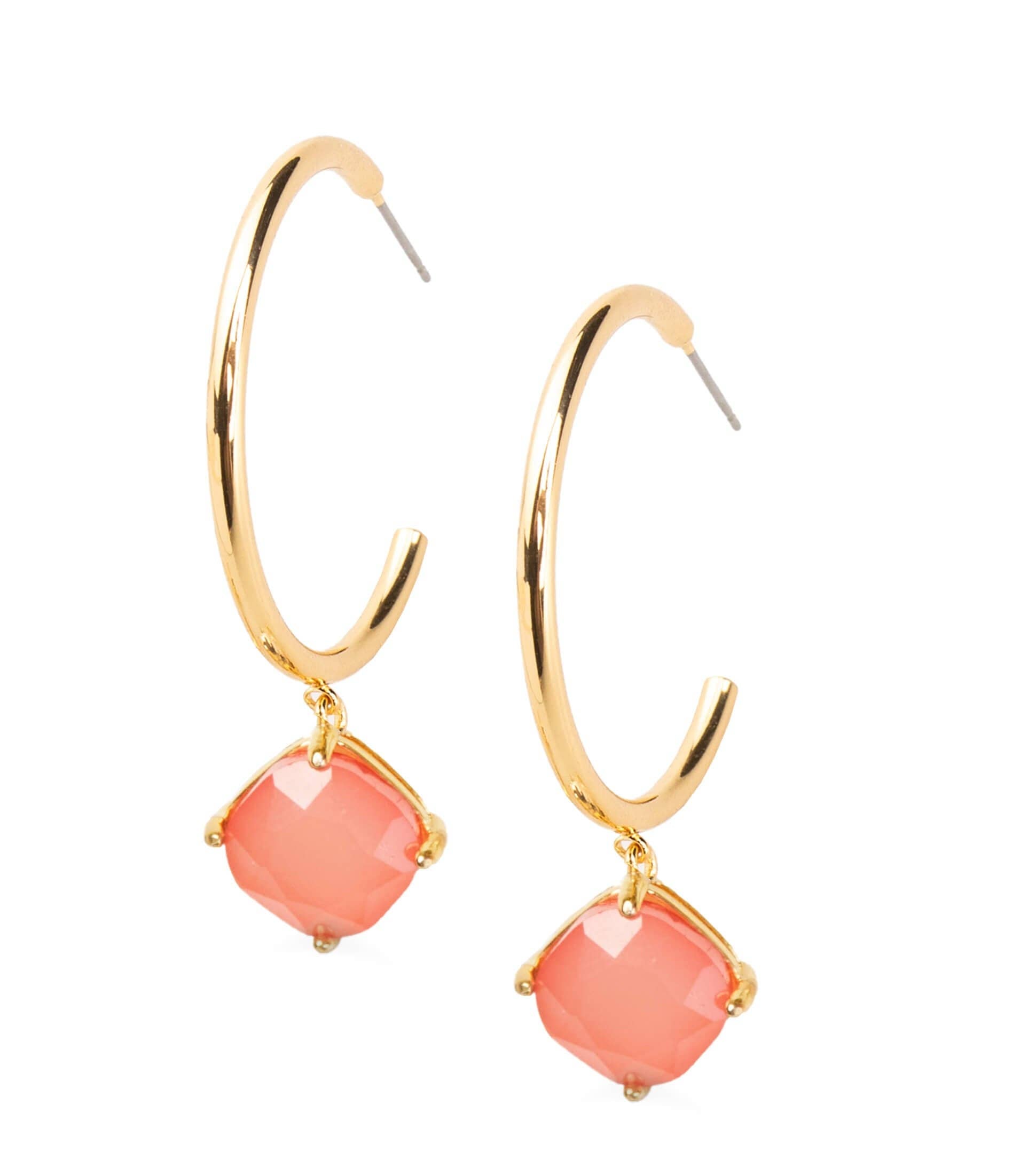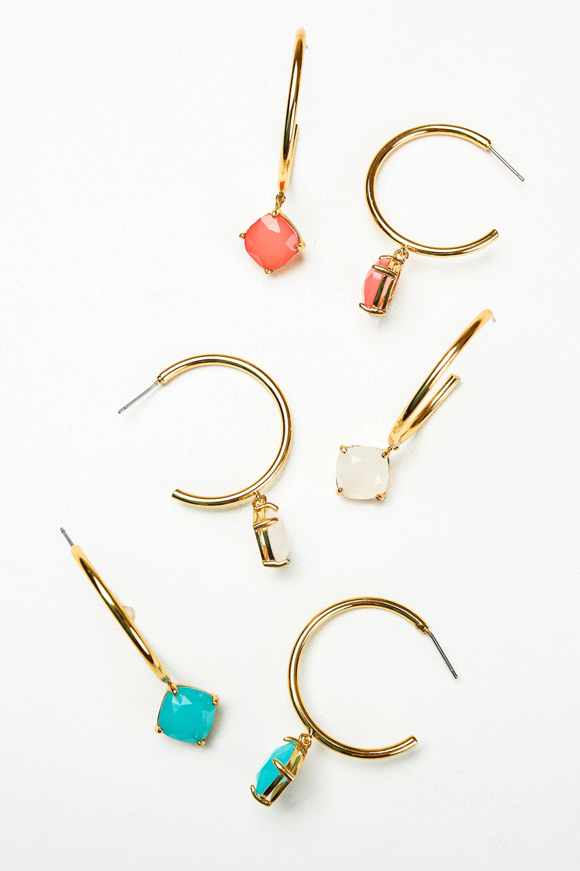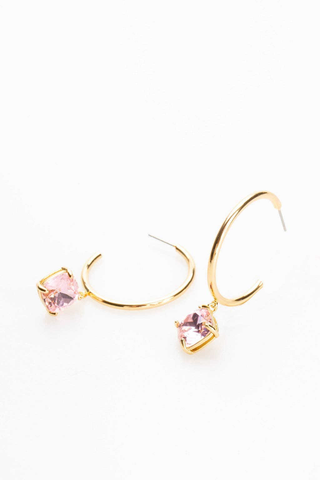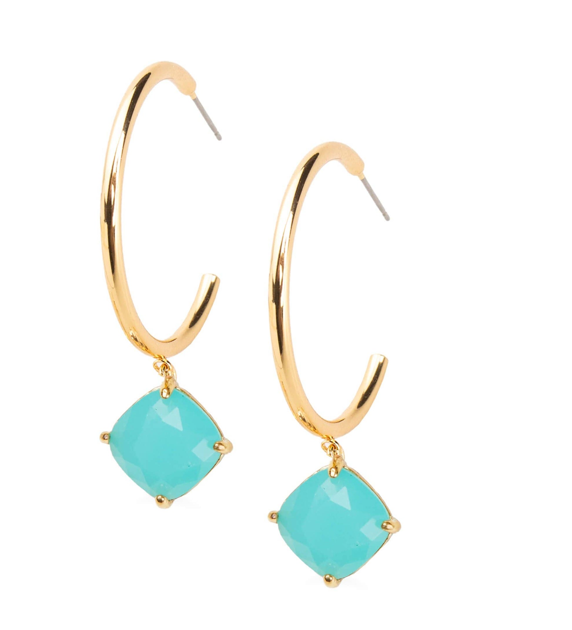 The perfect dress-down hoop - 1.25" hoop with 12mm glass stone charm - hypoallergenic + lead-free posts - gold-plated