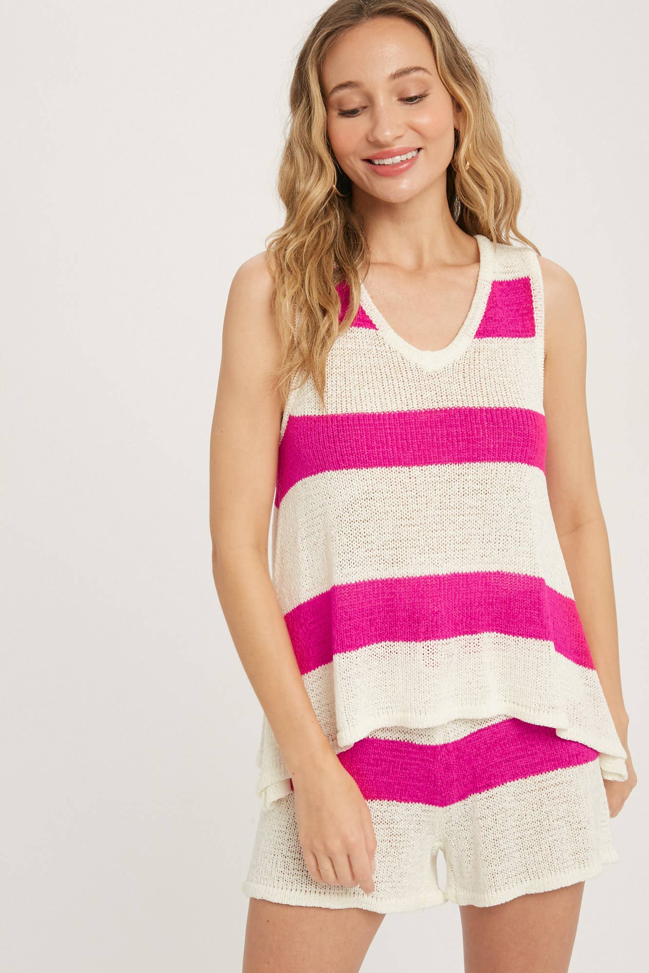 Lounge set features a knitted material, the top has a v-neckline, sleeveless, trapeze silhouette and the shorts are high waist, elasticated waist band, relaxed fit.