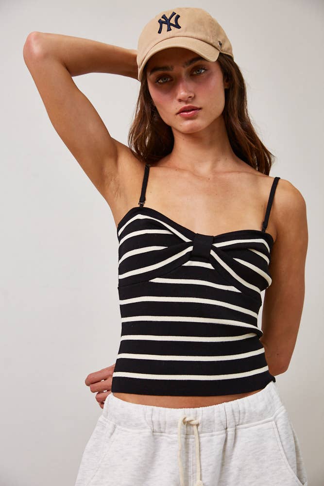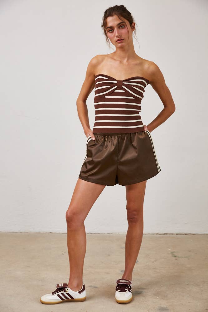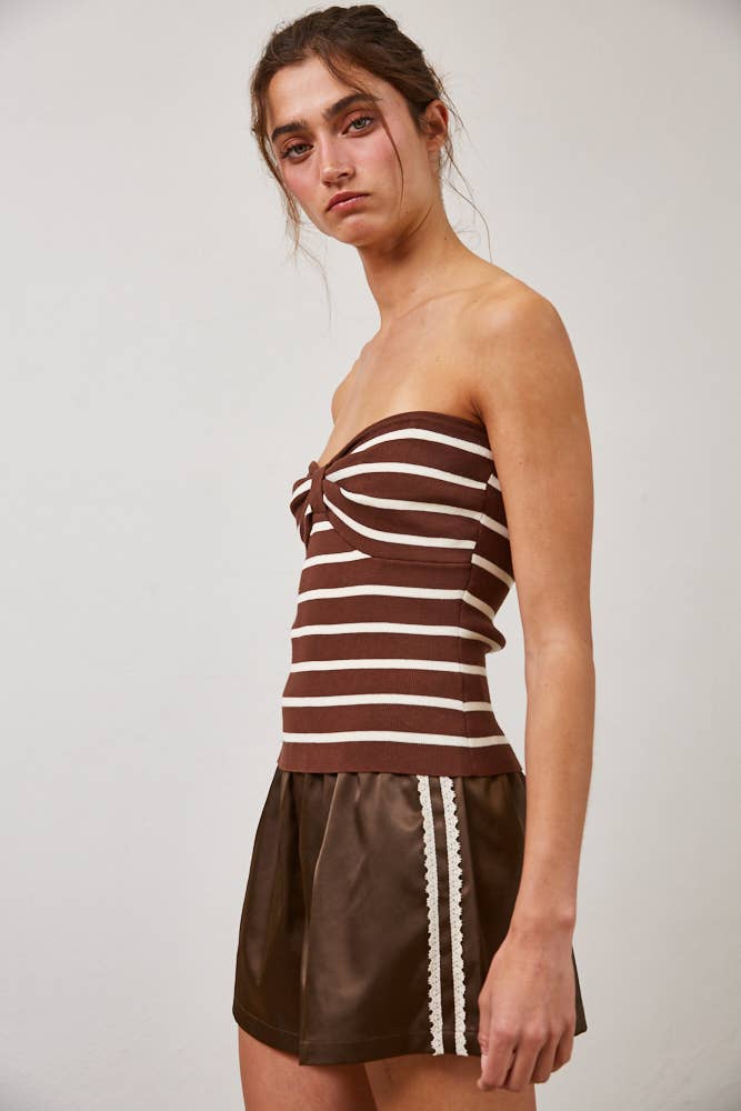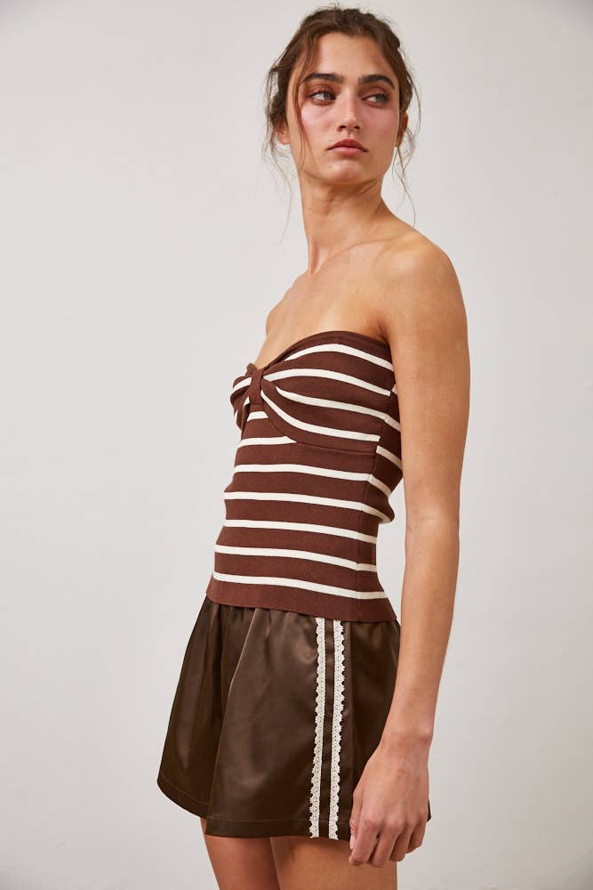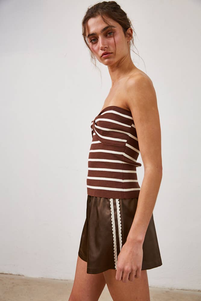Soft, stretchy texture with a slim, body-hugging fit -Cropped length that hits at the waist for a modern look -Twist detail at the bust creates a naturally feminine shape -Removable shoulder straps allow for two styling options -Pairs effortlessly with high-waisted pants, joggers or skirts