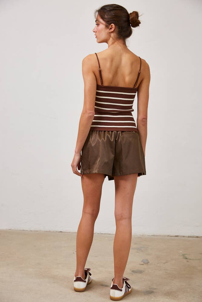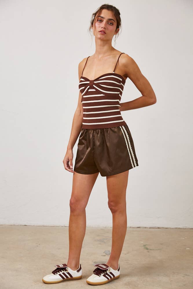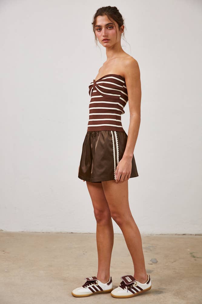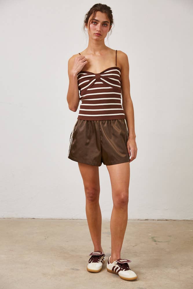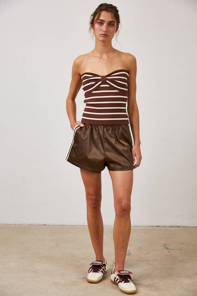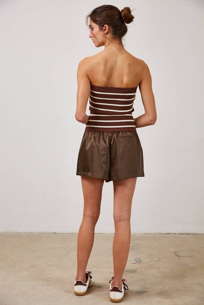 Soft, stretchy texture with a slim, body-hugging fit -Cropped length that hits at the waist for a modern look -Twist detail at the bust creates a naturally feminine shape -Removable shoulder straps allow for two styling options -Pairs effortlessly with high-waisted pants, joggers or skirts