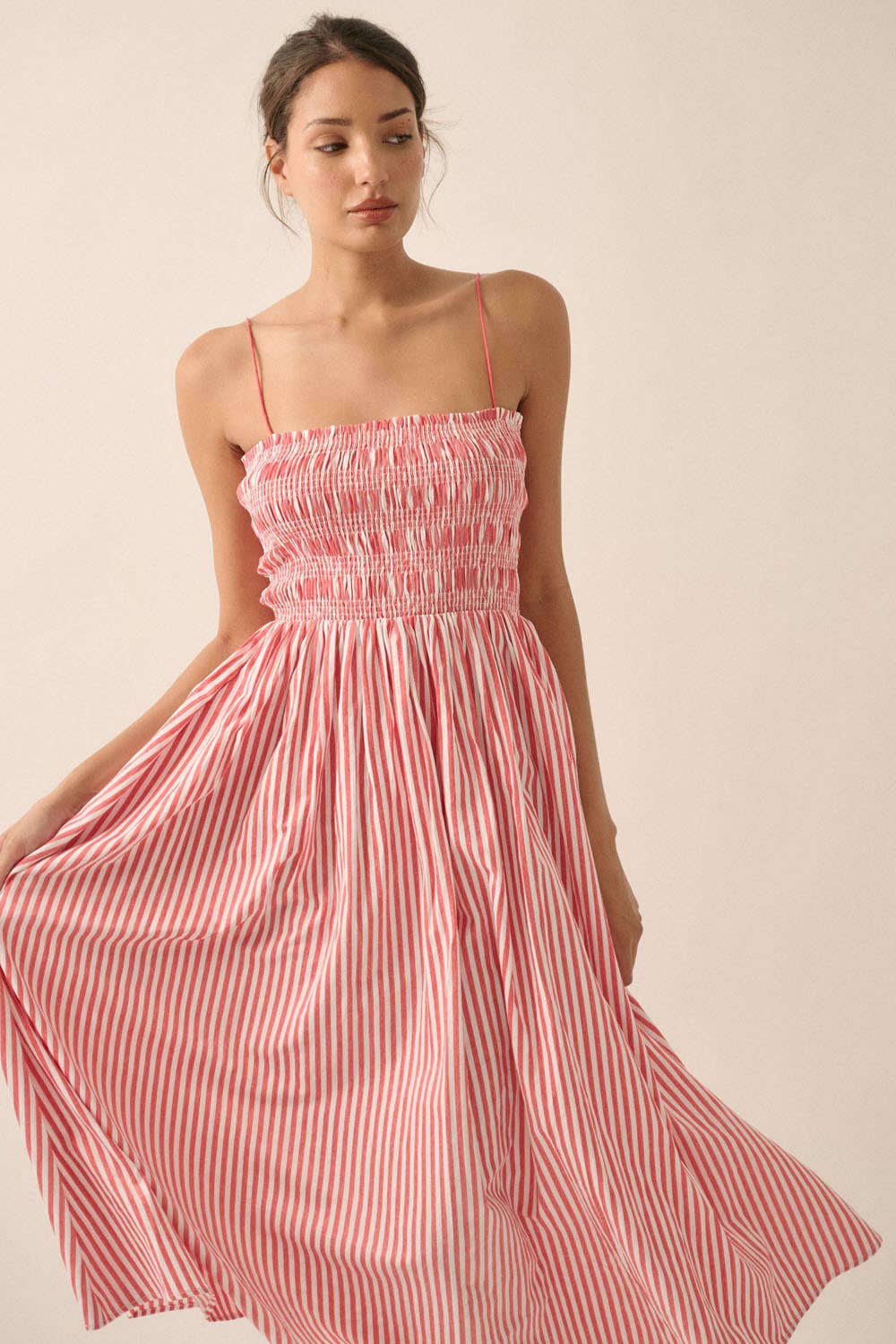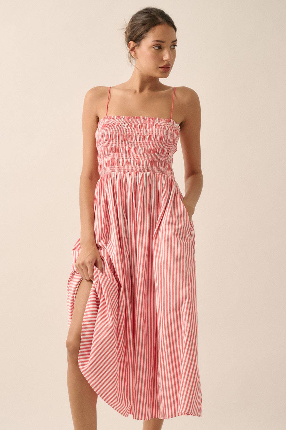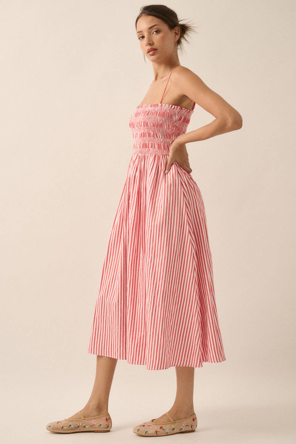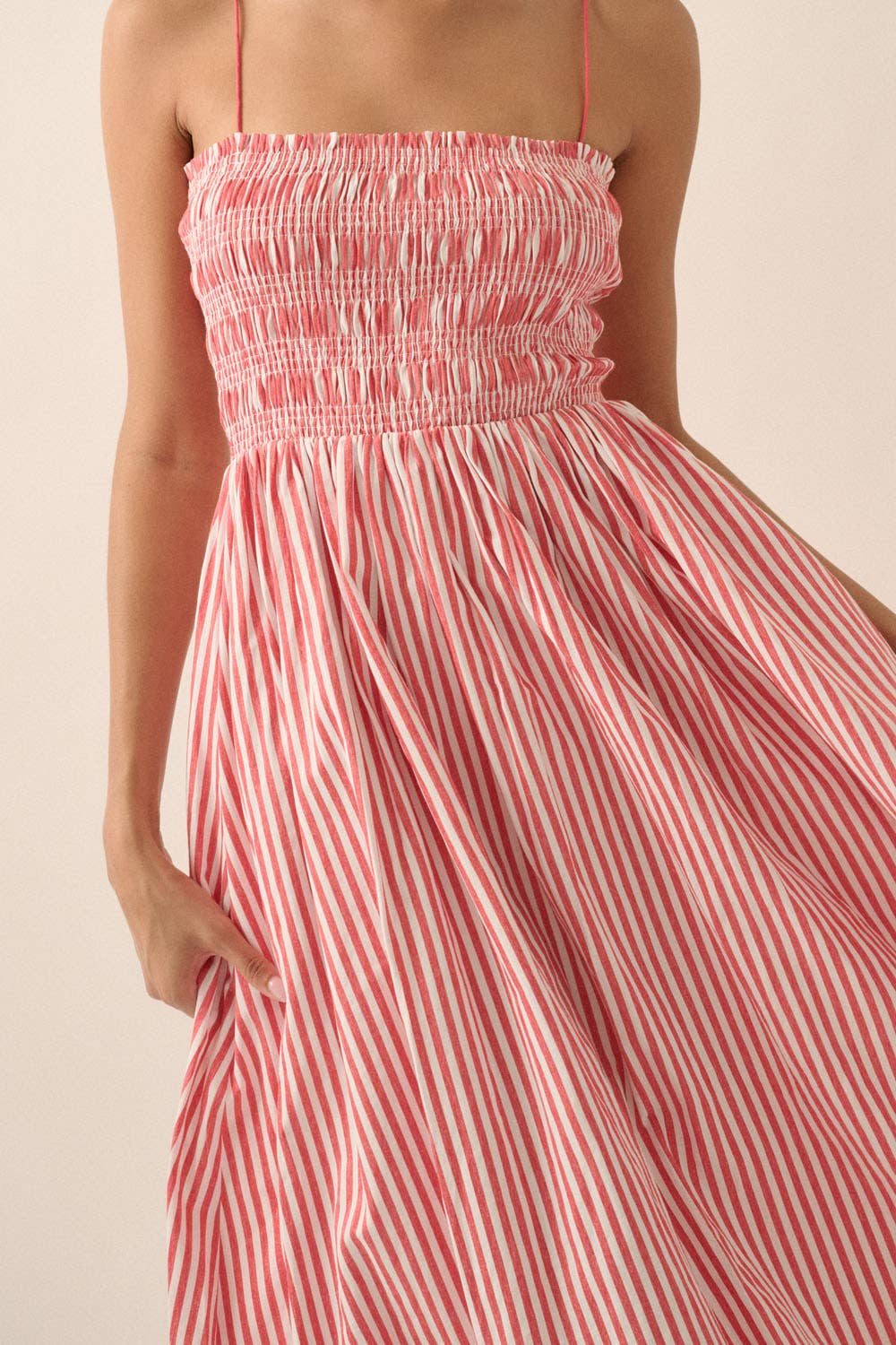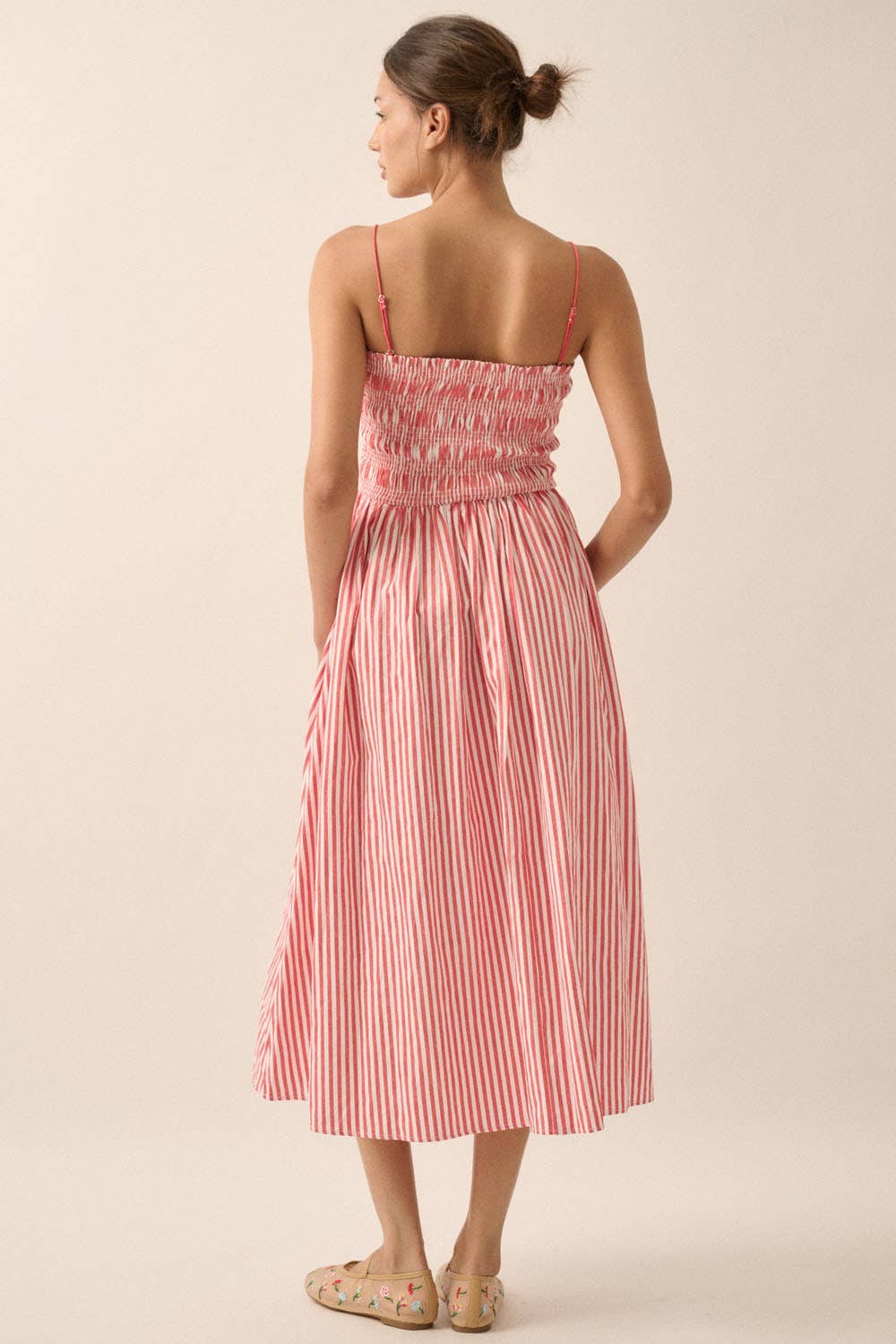 A stripe-print woven midi dress with the following features: Straight neckline with ruffle. Smocked bodice. Sleeveless with adjustable shoulder straps. Gathered skirt. Side seam pockets. Low back. Calf length. Fit-and-flare silhouette.