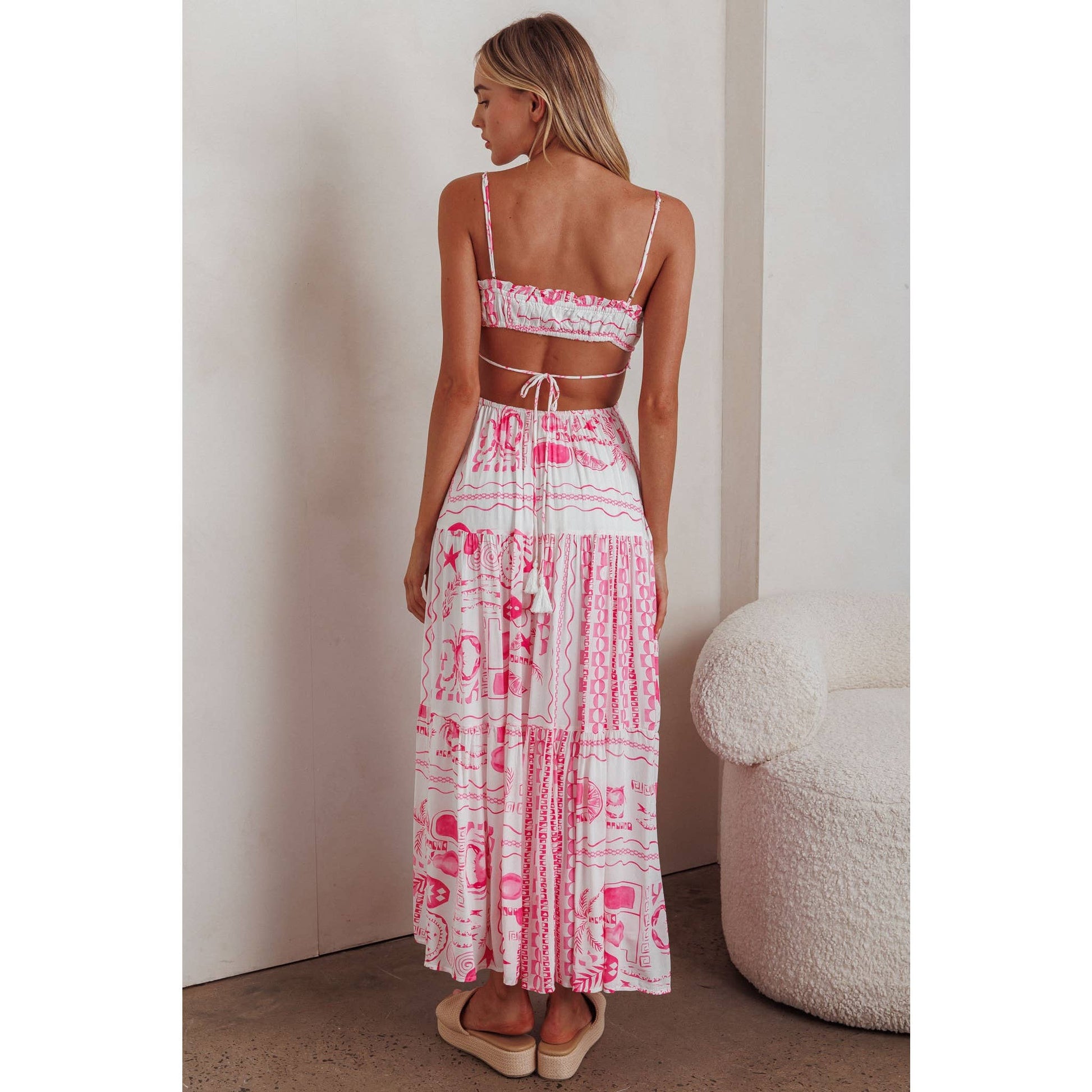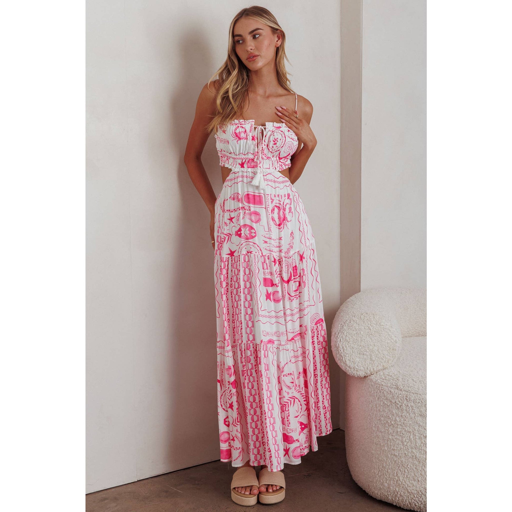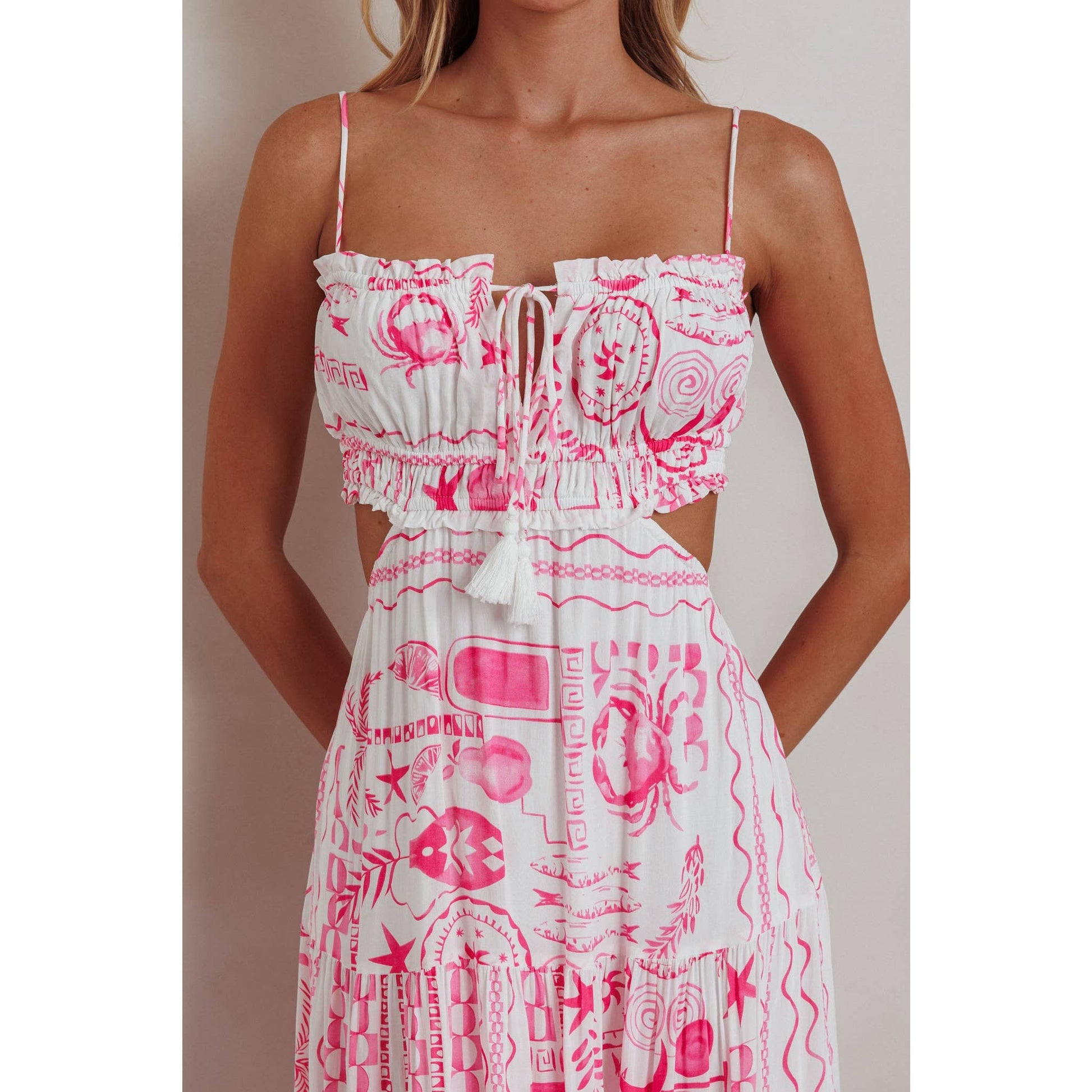 SUMMER BEACH VIBE MAXI DRESS SIDE CUTOUTS FRONT CUTOUT GATHERING DETAIL FRONT DRAWSTRING TIE BACK TIE LINED