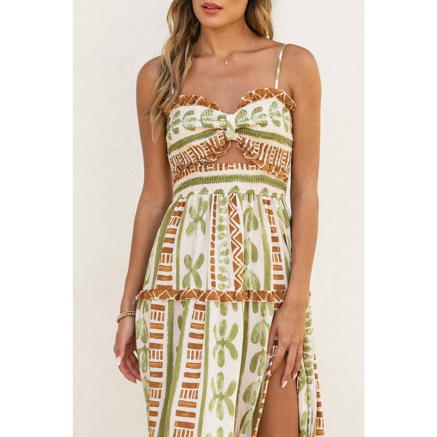 Border printed maxi dress featuring a cutout on the bodice and smocking details. Model is 5'8" and wearing size Small. - Ruched sweetheart neckline - Cut out below chest - Smocked chest and waistband - Ruffle details around the edges of smocked panels - Front side slit - Adjustable shoulder straps.