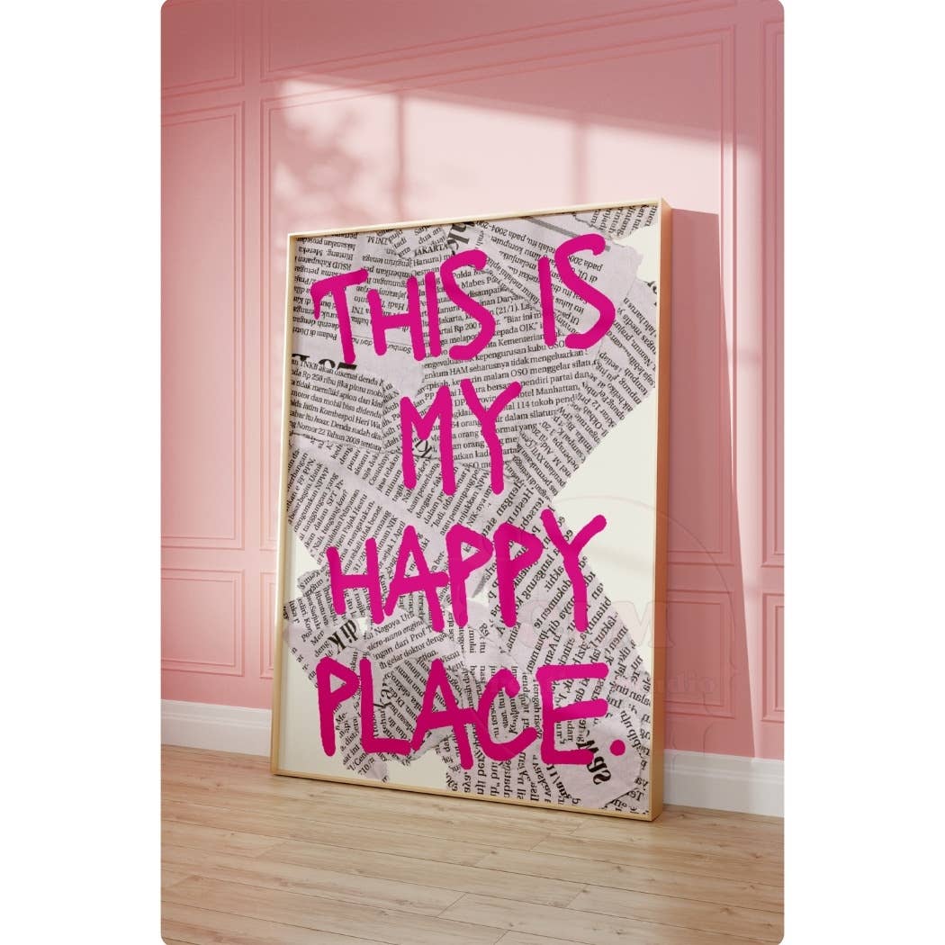 This Is My Happy Place Pink Retro Newspaper Wall Art Print