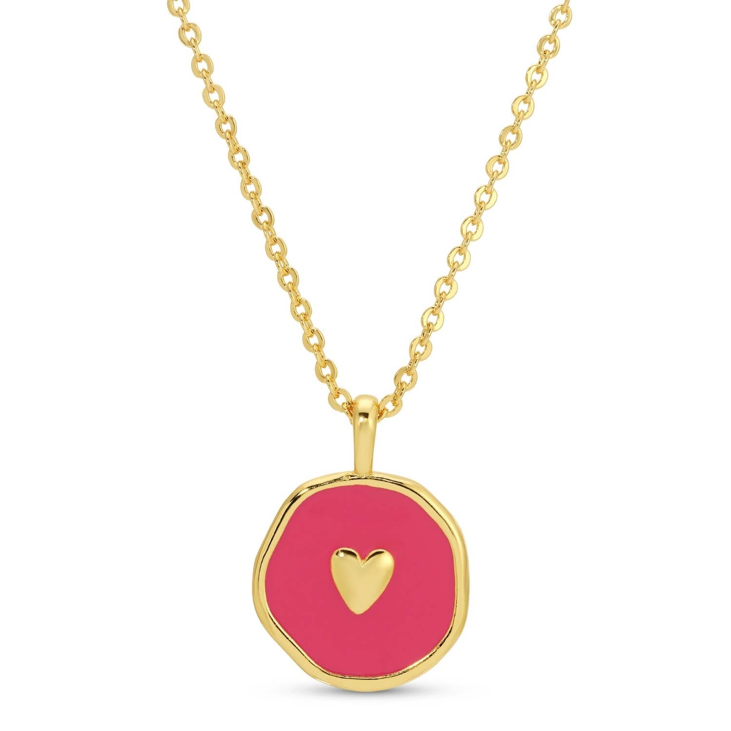 Stunningly crafted, this tiny heart pendant features an enamel background on a brass, plated 18" necklace. .5" Pendant, .75" Drop 18"