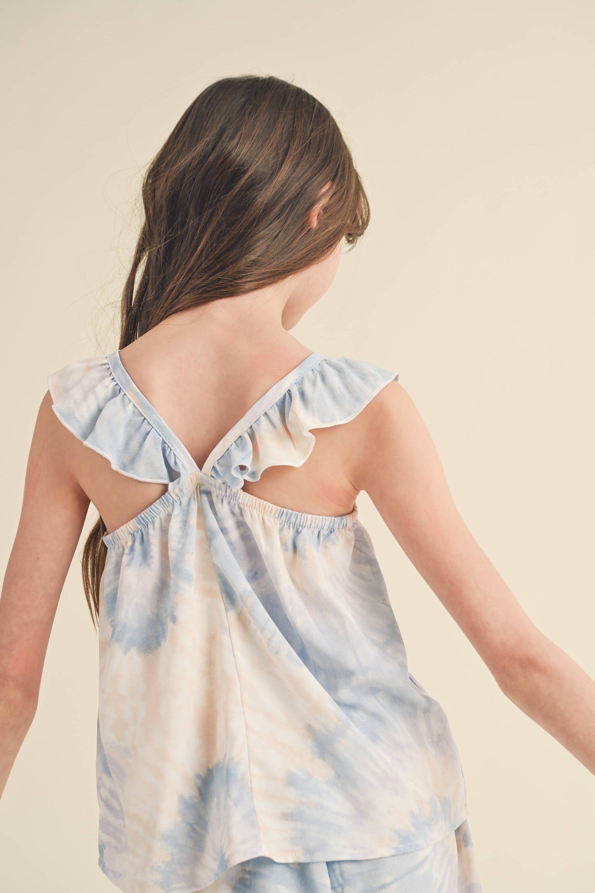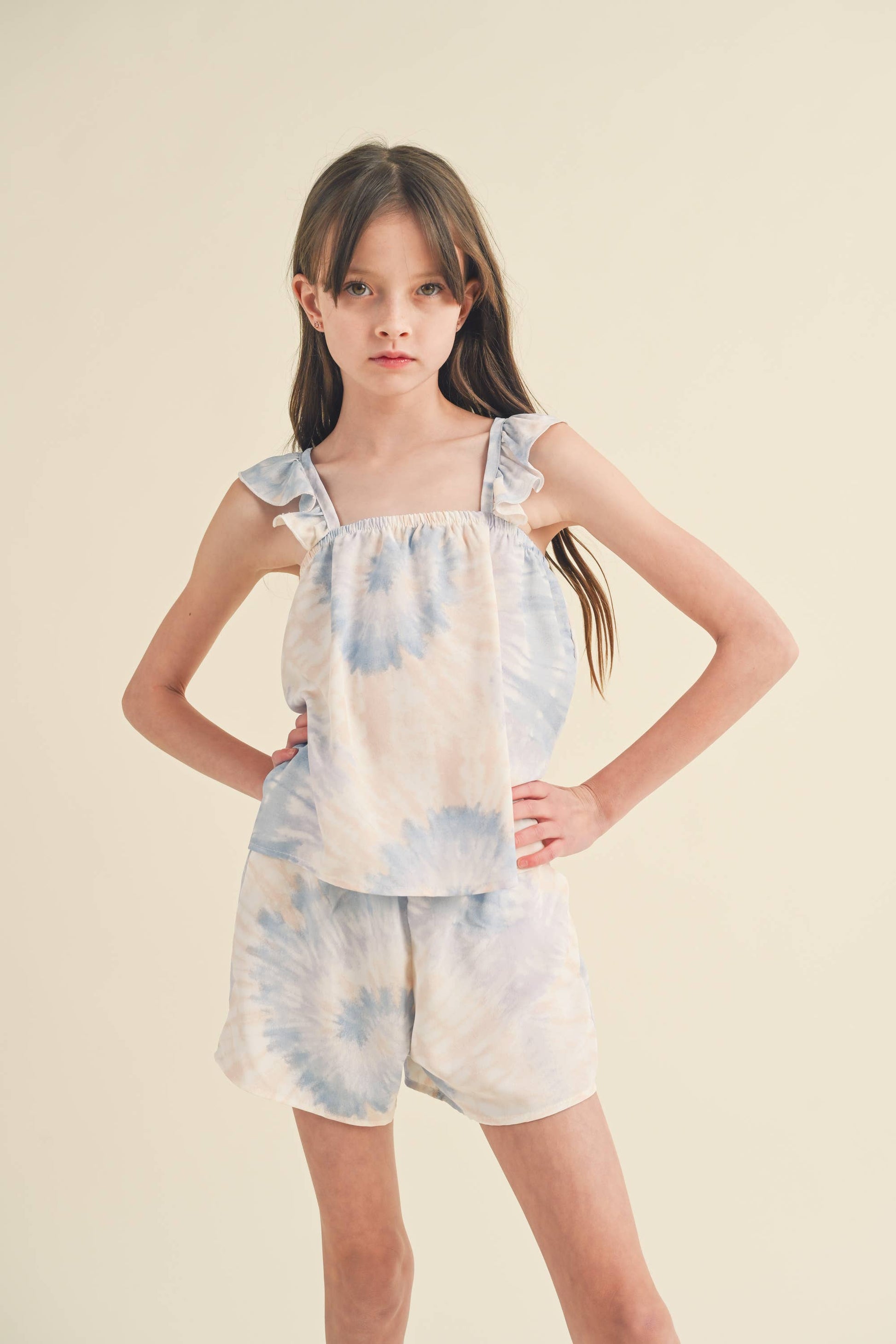 RUFFLE SLEEVE WITH A CROSS BACK DETAIL IN A FLOWY WOVEN TIE DYE PATTERN. MATCHING SHORTS SET FOR EASY STYLING. It's the perfect go-to piece for a casual and chic.