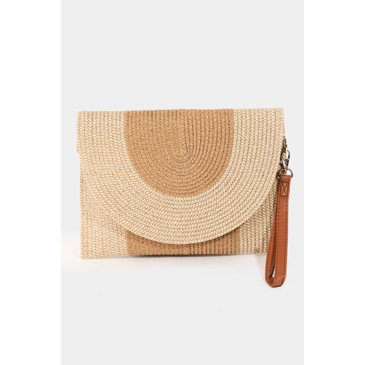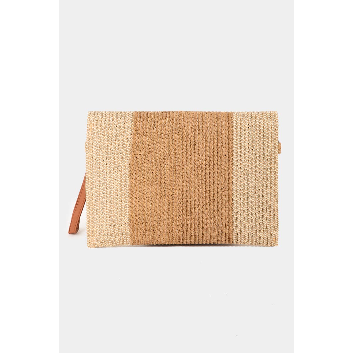 This clutch bag brings a luxurious two-tone straw style. Elevate your ensemble with this chic, timeless accessory.