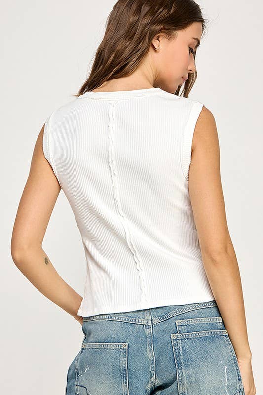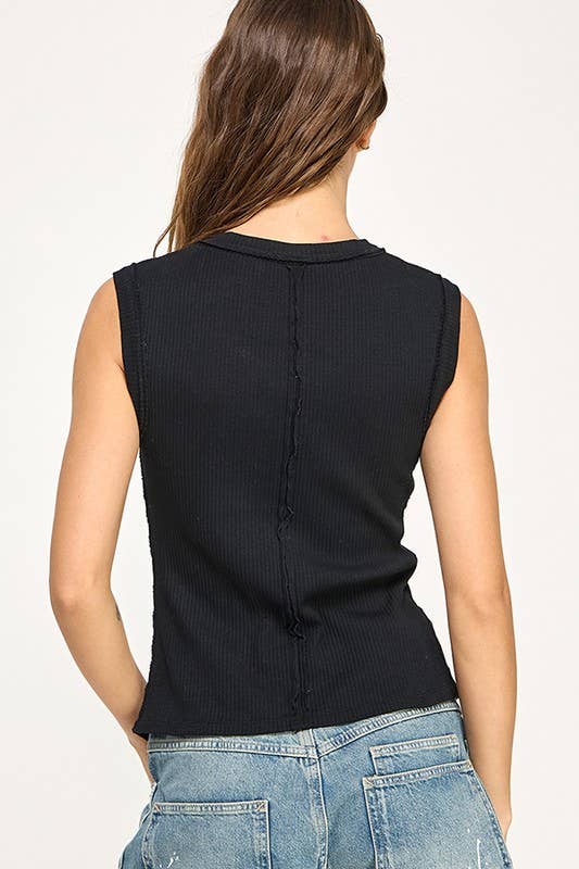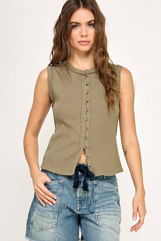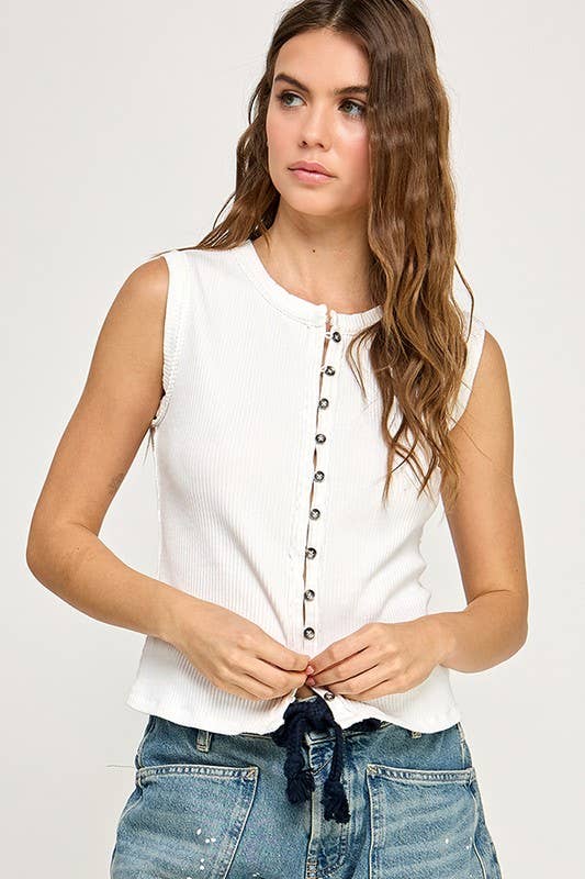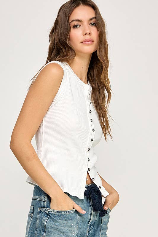 Front button closure and round neck, sleeveless, split hem, slim fit, casual tank top